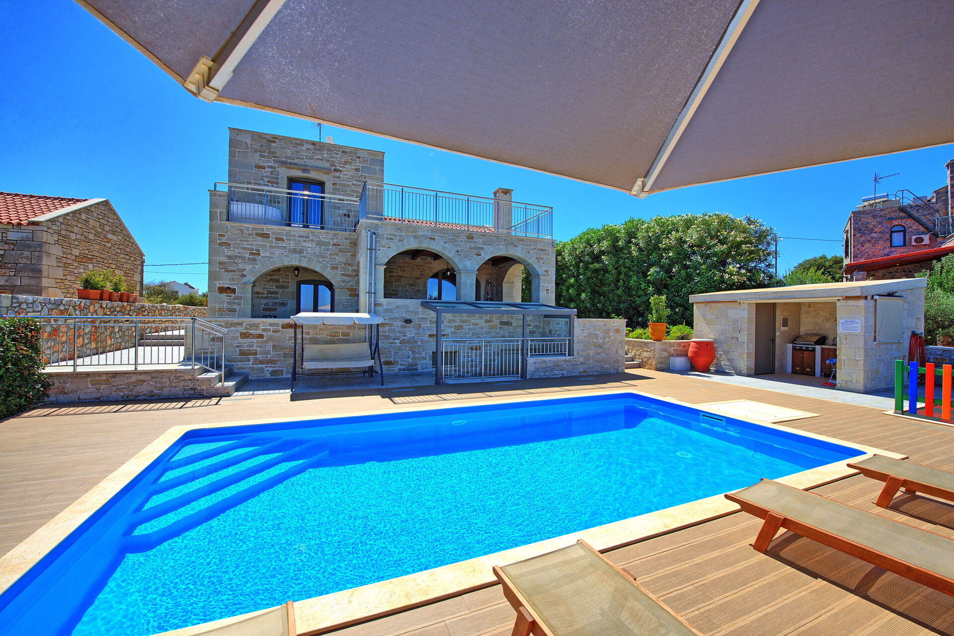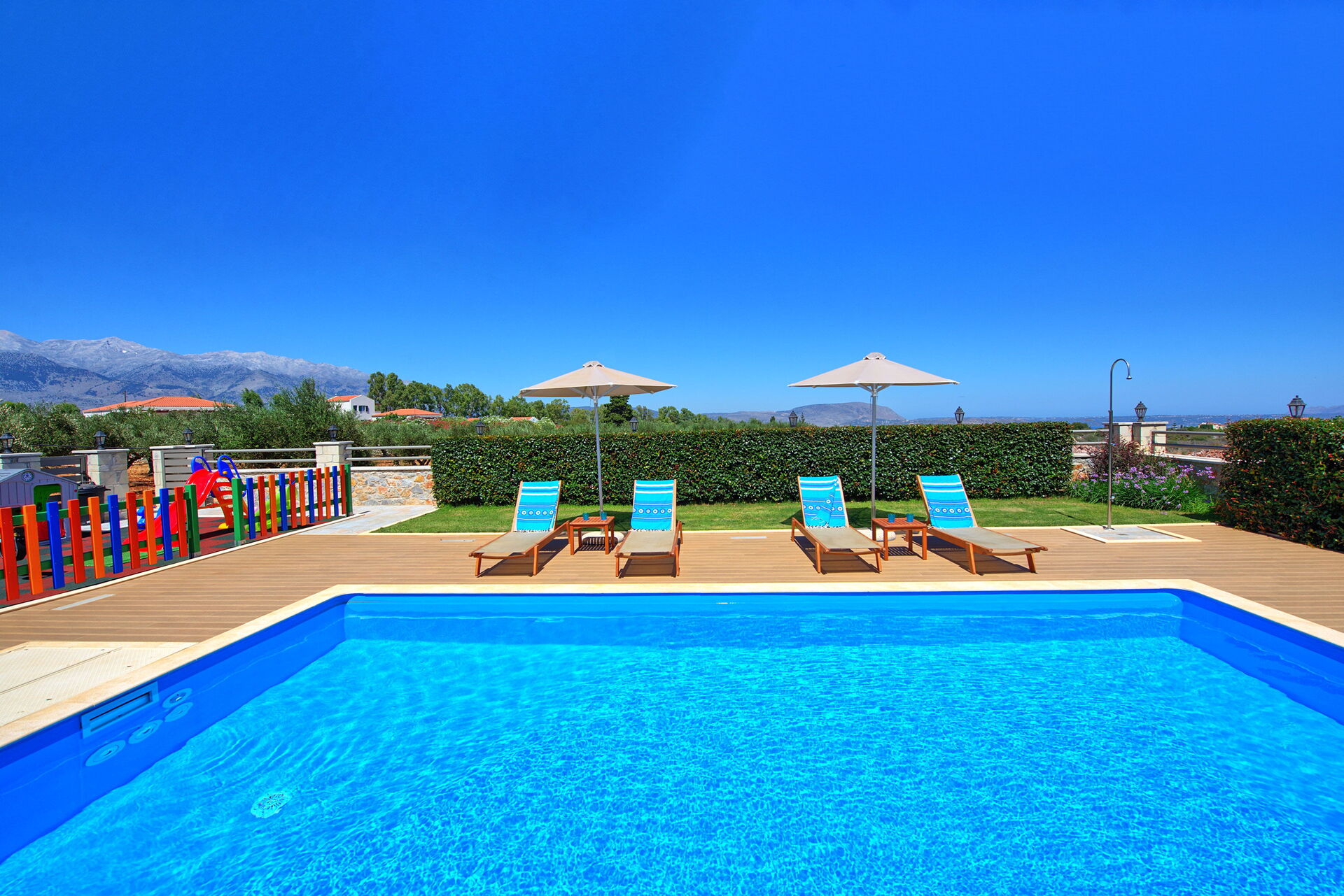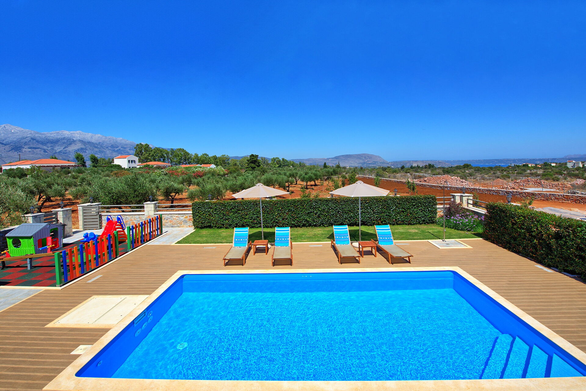 The house is new, spacious, very clean, airco is silent and works really well, beds are big and comfortable, master bedroom has an extra long bed so very comfortable for taller people like me. Outside you will find beautiful gardens all around the house which are full of beautiful plans and flowers. The swimming is fantastic, it's very big and the area around is very spacious, there is also a play area for the little ones. There is a covered outside kitchen with a BBQ which we didn't use to avoid fire risks, attached there is also another WC so you don't have to enter the house every time. The villa has beautiful views although there are still a few villas under construction in front but that didn't bother us at all. On the property you will find lots of olive trees and dozens of different fruit trees, they are all maintained by the owner Tony, ask him for a little tour and he will be happy to show you around. The villa is located just outside a small village, there is a restaurant/pizzeria just a 6 minutes walk, they don't have a big menu but all they make is fresh and delicious and at a very good price. Otherwise a 5 minute drive to Vamos and you will find several more restaurants, minimarket and bars. There are many beaches nearby, the 2 closest ones are both about 15-20 min drive, one is in Almirida, this one is smaller and can get a bit crowded. The other one is towards Georgioupoli, here you will find a small beach in the town, this one is very crowded, but if you drive a bit further you will find a huge beach (Peristeras Beach) with plenty of space, beautiful water and many bars and restaurants. We advise a place called Giorgiali, they have free sunbeds (just consumption), shower, toilet and a nice restaurant, we often spent the morning in the villa and the afternoon at the beach ending at the restaurant Giorgiali (beach dinner with a wonderful sunset). Other place to visit is Chania, very beautiful harbour, ask Tony and Debbie for directions. We totally recommend this property and will definitely come back!
