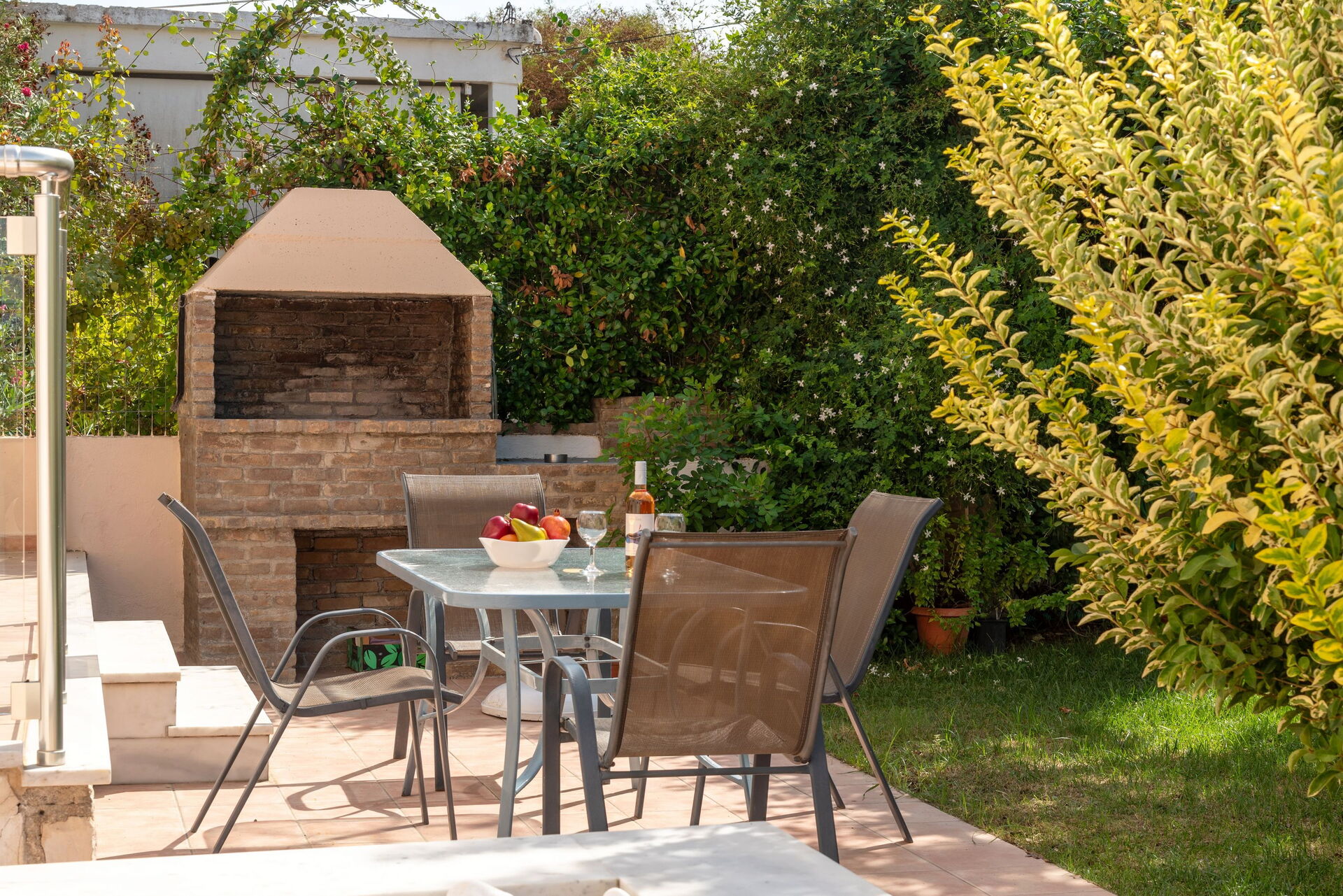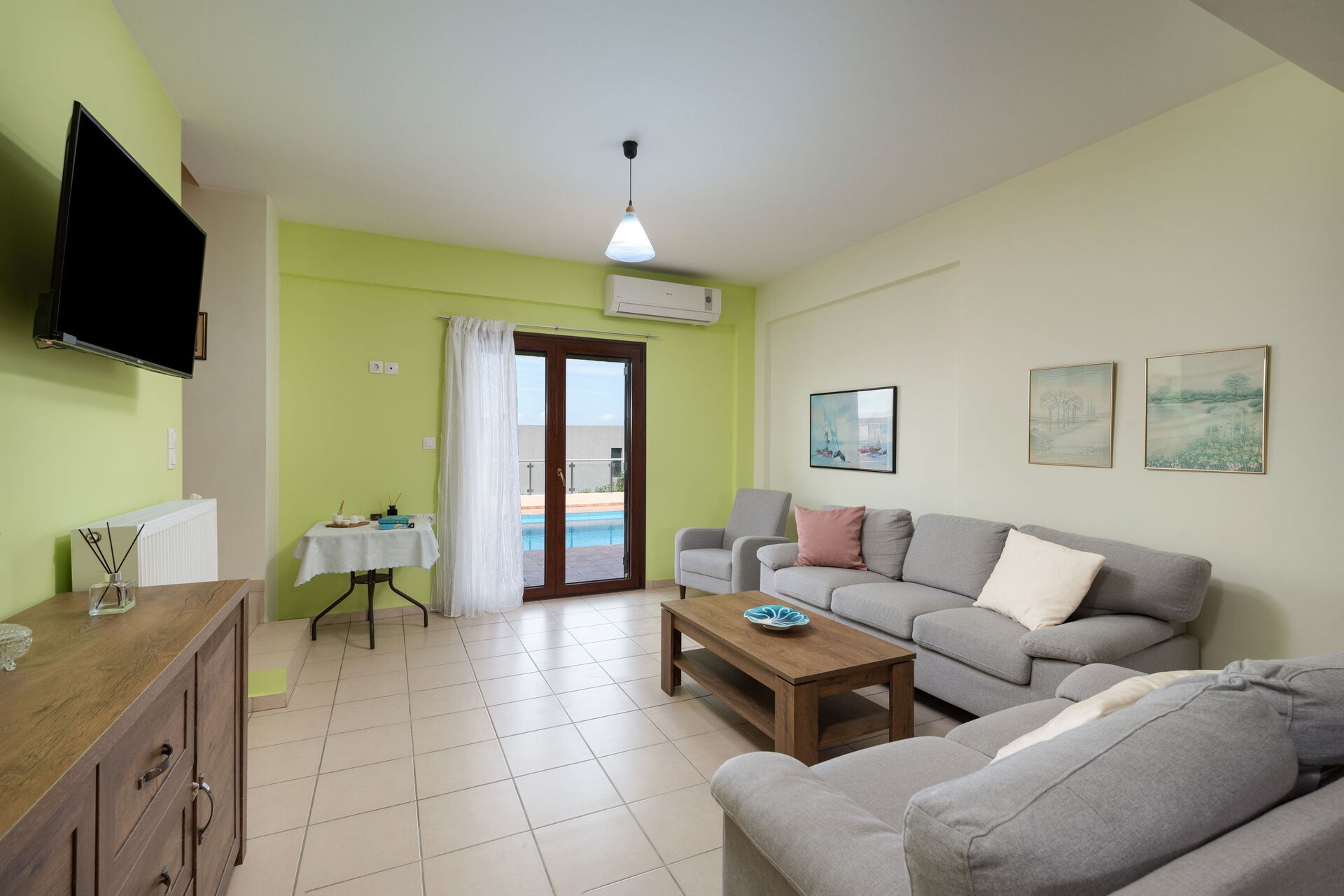 Stuen har utgang til bassengområdet, og det lille kjøkkenet har utgang til terrassen foran med murgrillen.