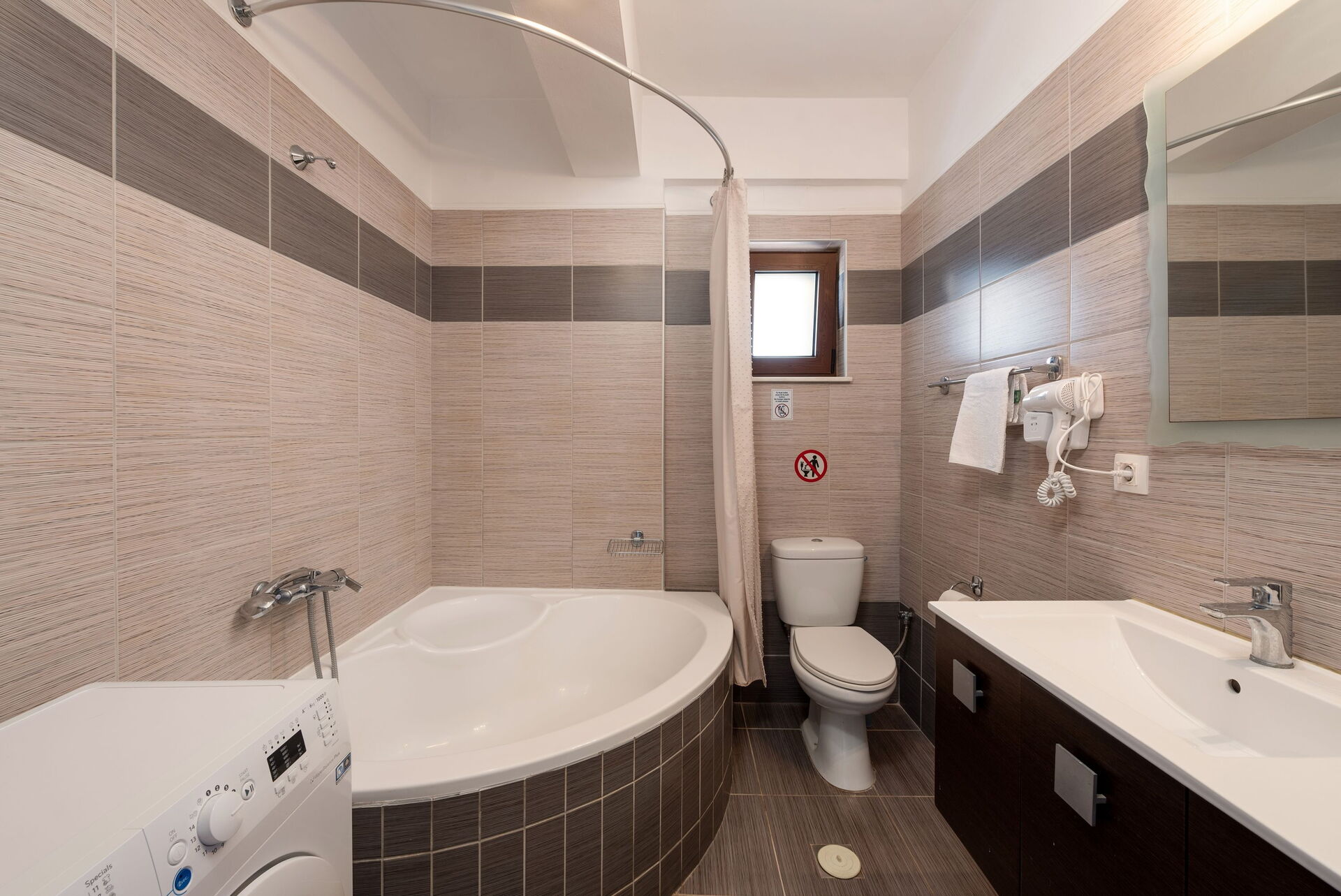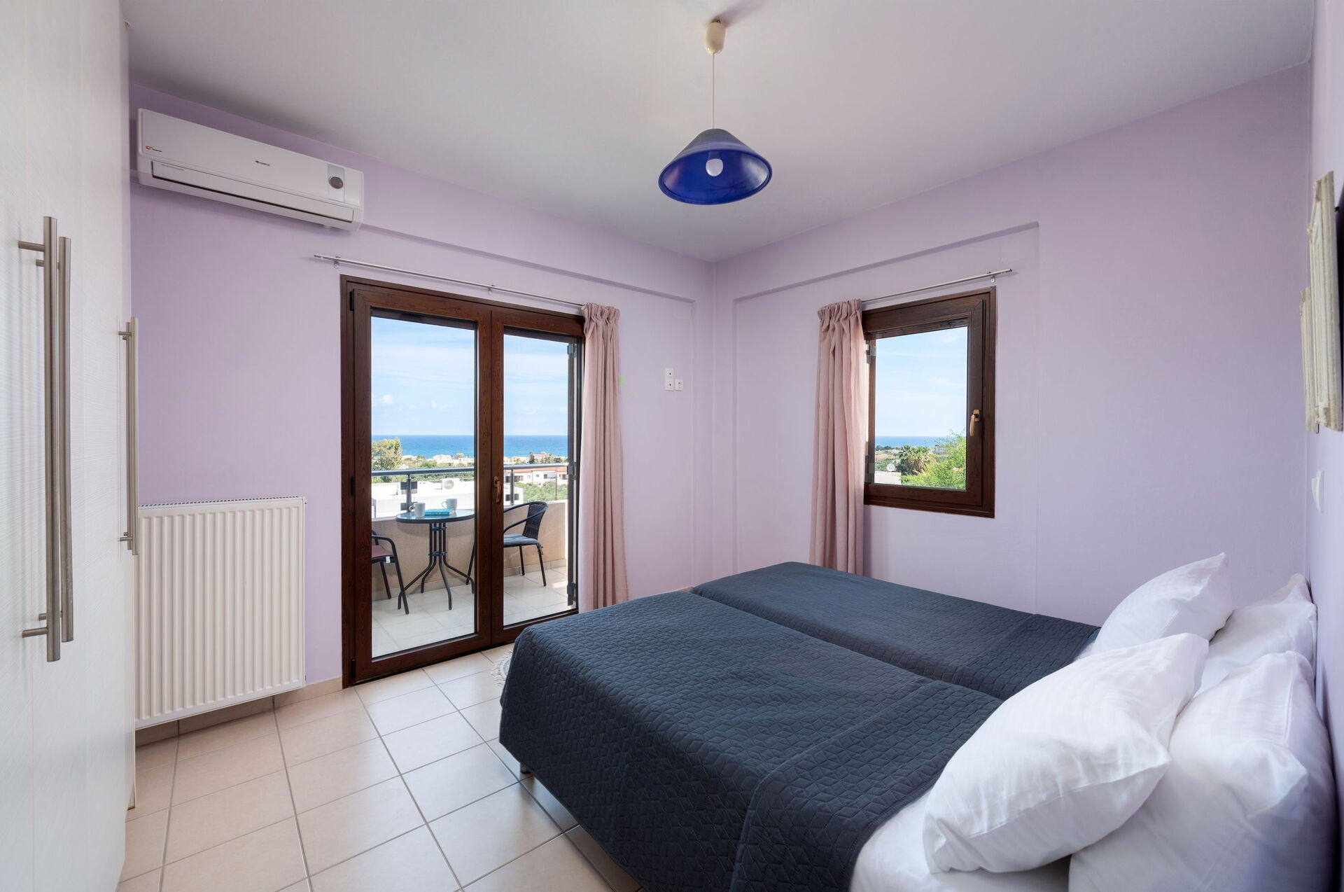 Twin rom og utgang til panoramaterrasse, bad med badekar og dusj (vaskemaskin), dobbeltrom og utgang til en mindre balkong (bassengutsikt og havutsikt).