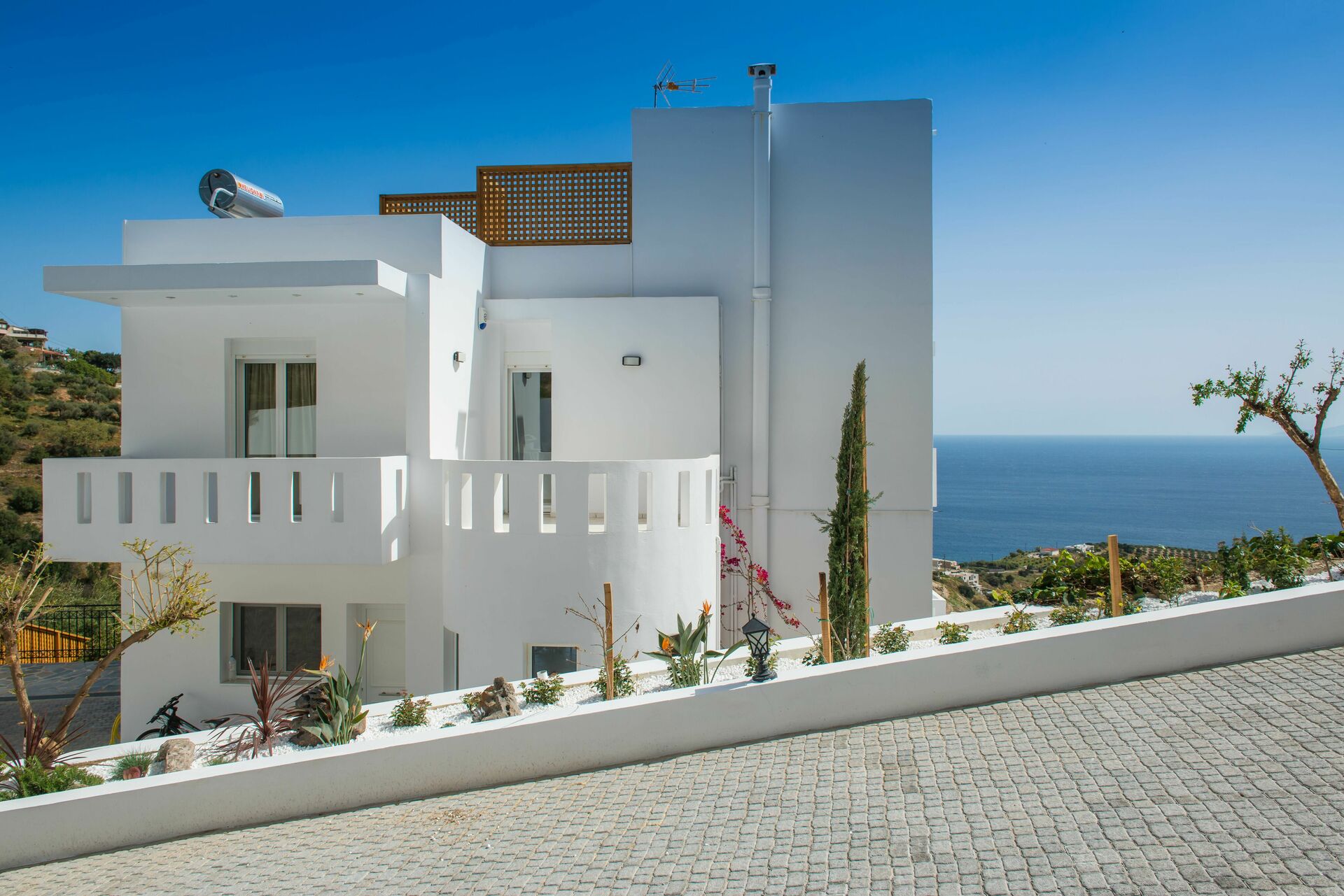 Avstander: Rodia (butikker) 2 km, Ligaria (strender, butikker) 9 km, Agia Pelagia 13 km, Heraklion 16 km, Knossos Palace 19 km.