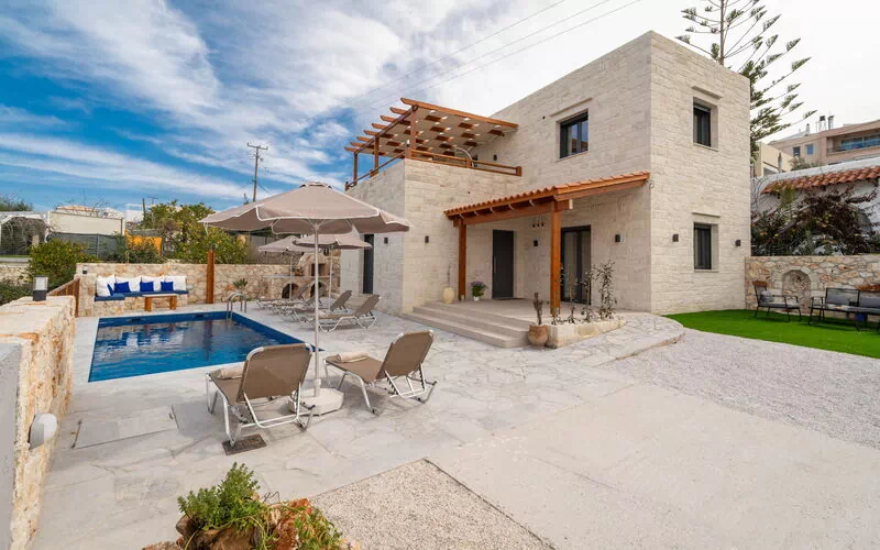 Den virkelige styrken til Villa Blini er den eksepsjonelle logistikken. Bare 350 meter fra inngangsporten ligger hjertet av Plaka: du kan glemme bilen og gå til typiske tavernaer, barer og små håndverksbutikker. For havelskere ligger den berømte Almyrida-stranden bare 2 km unna, noe som gjør denne villaen til den ideelle basen for de som søker bekvemmelighet uten å ofre privatlivet. Uteområdet er en sann oase av velvære: det private bassenget er omgitt av et utstyrt solarium, ideelt for å kjøle seg ned på varme kretiske dager eller nyte en aperitiff ved solnedgang.Lyse interiører og nyeste generasjon komfort