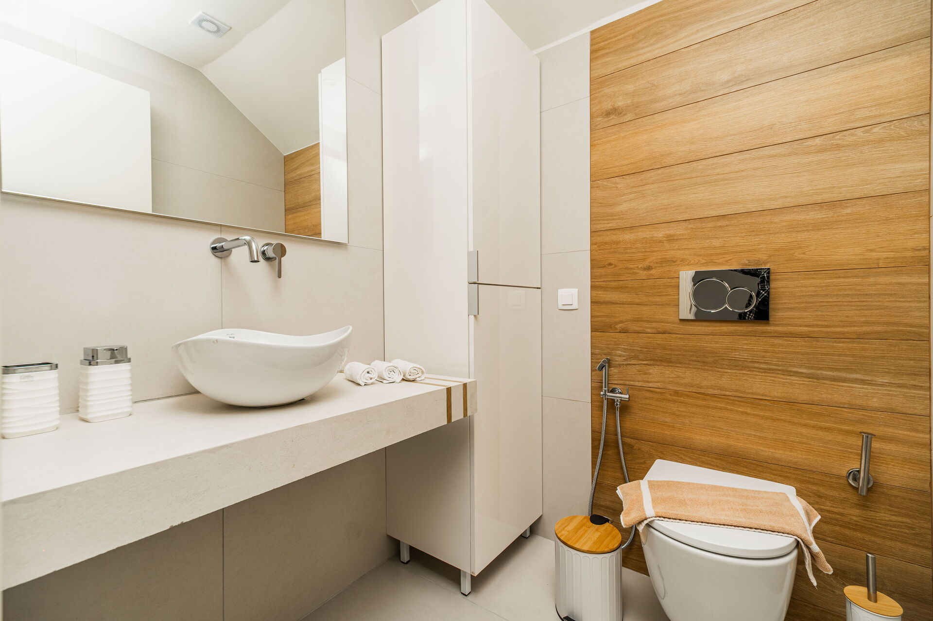Første etasje: lyst oppholdsrom med spiseplass og kjøkken (ovn, fryser, oppvaskmaskin), WC, 2 doble soverom, hvert med eget bad med dusj.