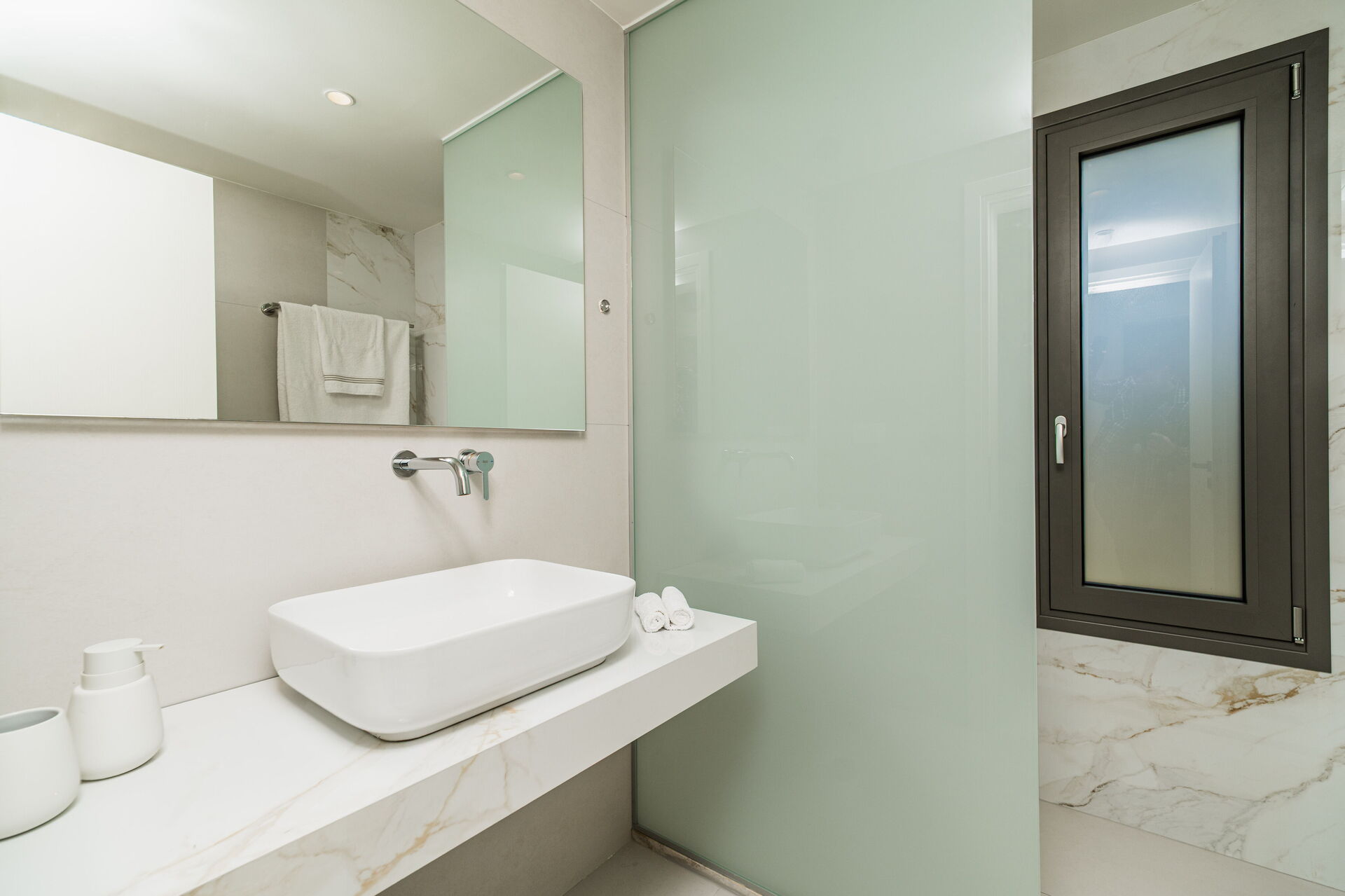 Andre etasje: dobbel sovesofa i en liten stuekrok med utsikt over etasjen nedenfor, 2 doble soverom, hvert med eget bad med dusj og tilgang til en felles balkong med panoramautsikt.