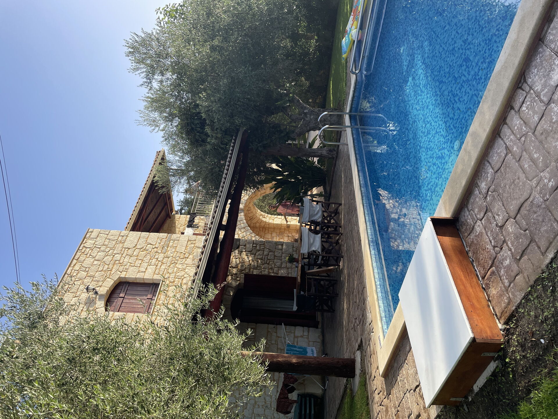We stayed in Villa Nipos, which is the one further away from the road. There are 2 villas there, and we were the only guests at that time. It was quiet and peaceful. There are many olive trees and the lemon trees that you see from the kitchen. The villa and the grounds are kept spotless by the owner who comes to look after the property every day, and is very discreet. Elisa is also super helpful with any queries. Thank you for the yoga mat! The house is also very well maintained and very comfortable. There a great views from the garden and the first floor balcony.