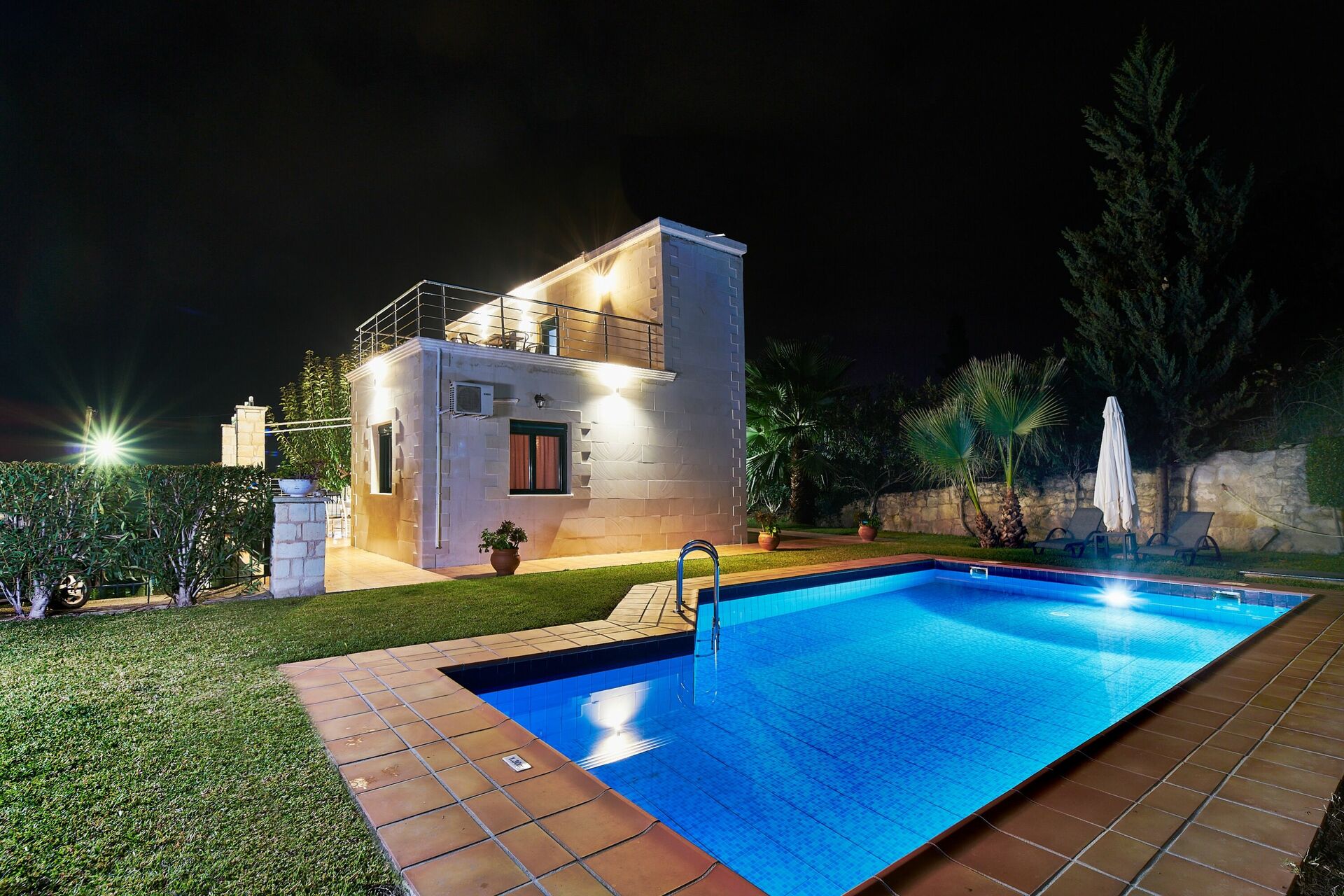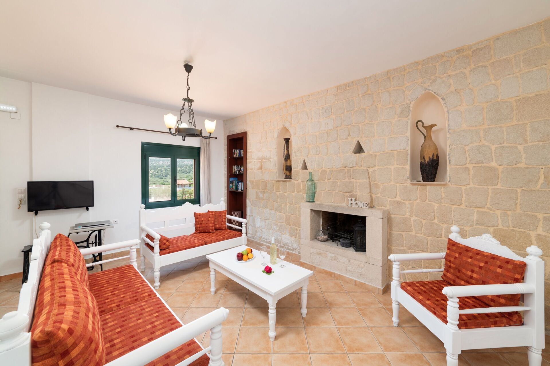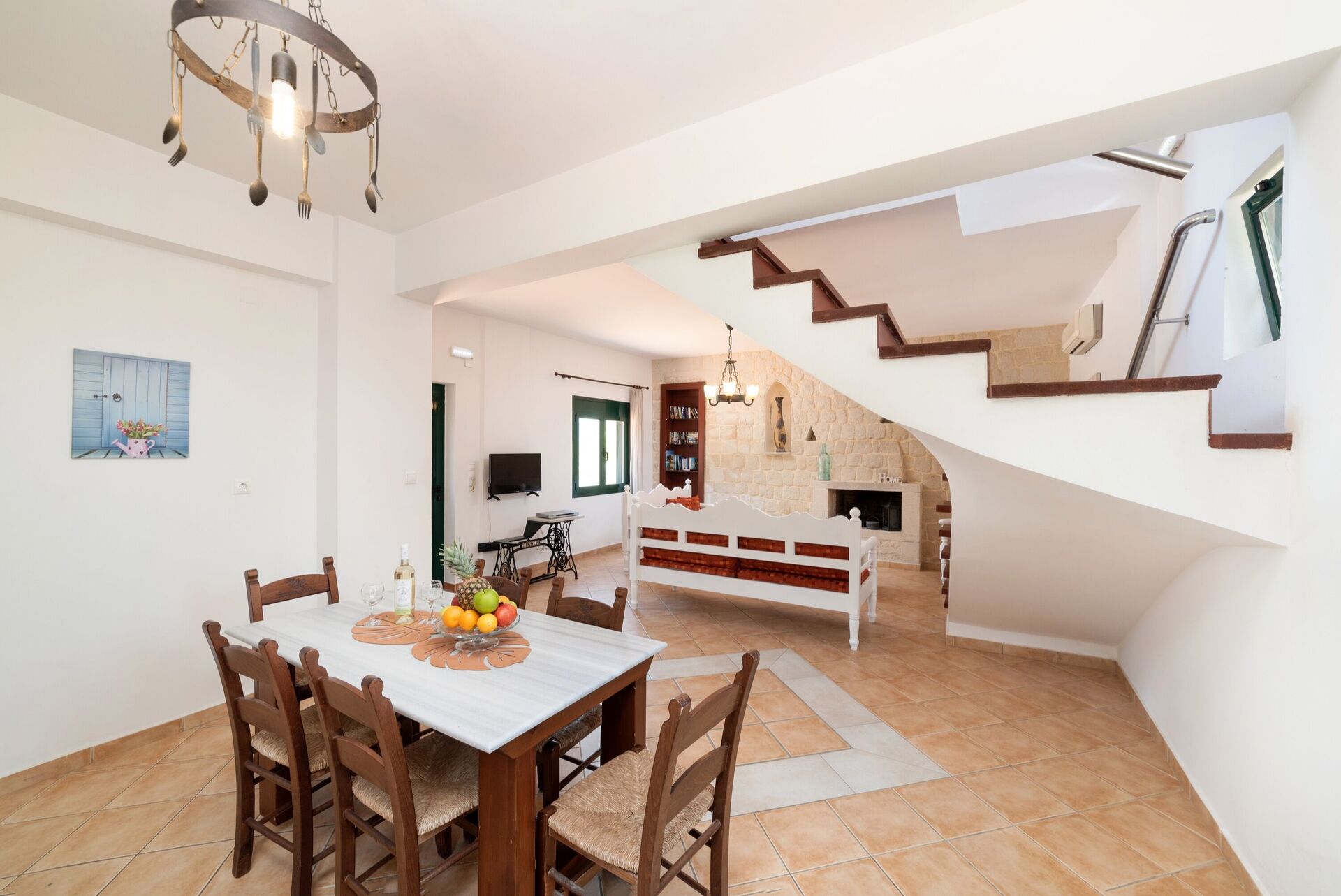 Innendørs tilbyr to-etasjes villaene klimaanlegg, og er smakfullt og stilfullt innredet med lokale steiner og tradisjonelle innslag fra Kreta.
