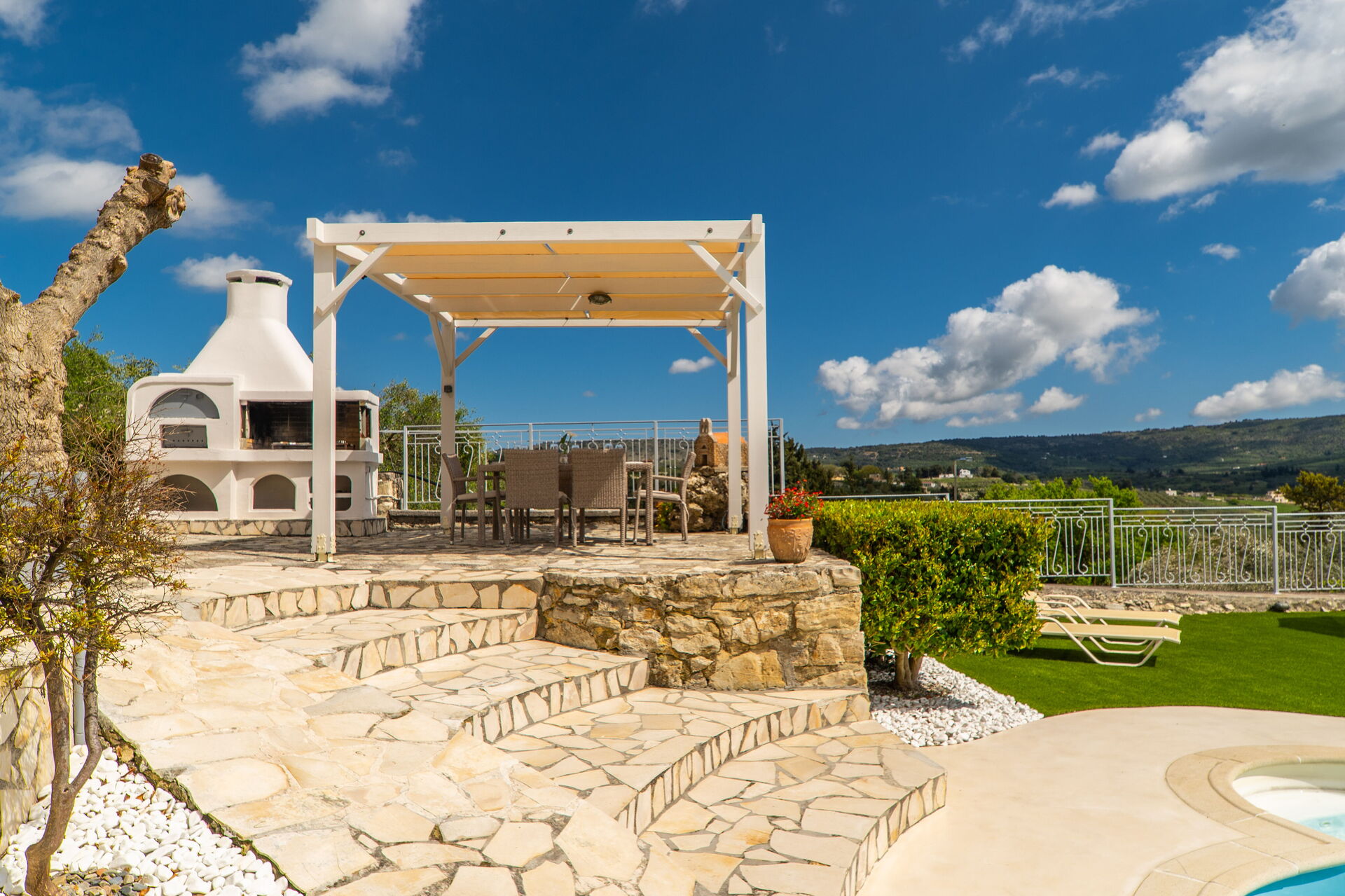 Ute finnes det mange store terrasser og et basseng, hvor du kan slappe av med familie eller venner og nyte de naturskjønne omgivelsene. Fra bassenget har man utsikt over de omkringliggende åsene med olivenlunder, sypresser og middelhavsbusker.