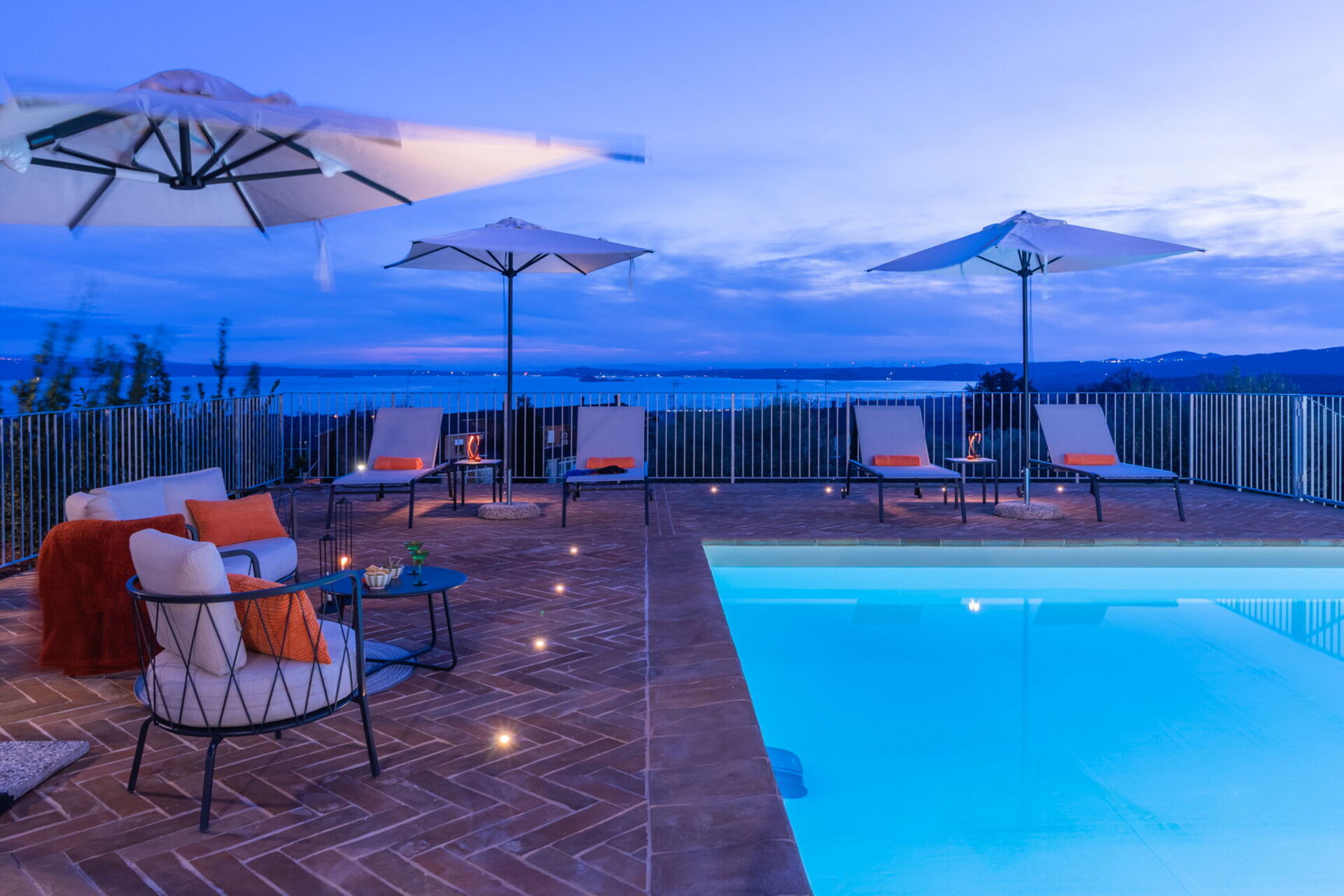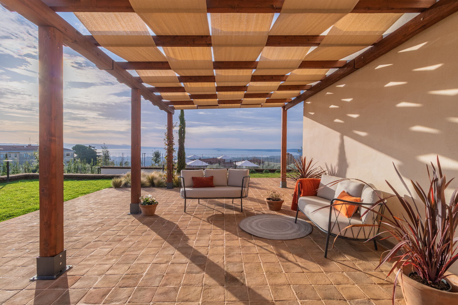 På uteområdet er det en velstelt hage på ca. 2 000 m². Her finner du et praktfullt privat basseng med naturskjønn utsikt over Bolsena-sjøen hvor man kan kjøle seg av på varme sommerdager. Verandaen med utendørs spiseplass er nok et sted som er perfekt for avkobling sammen med familie eller venner .