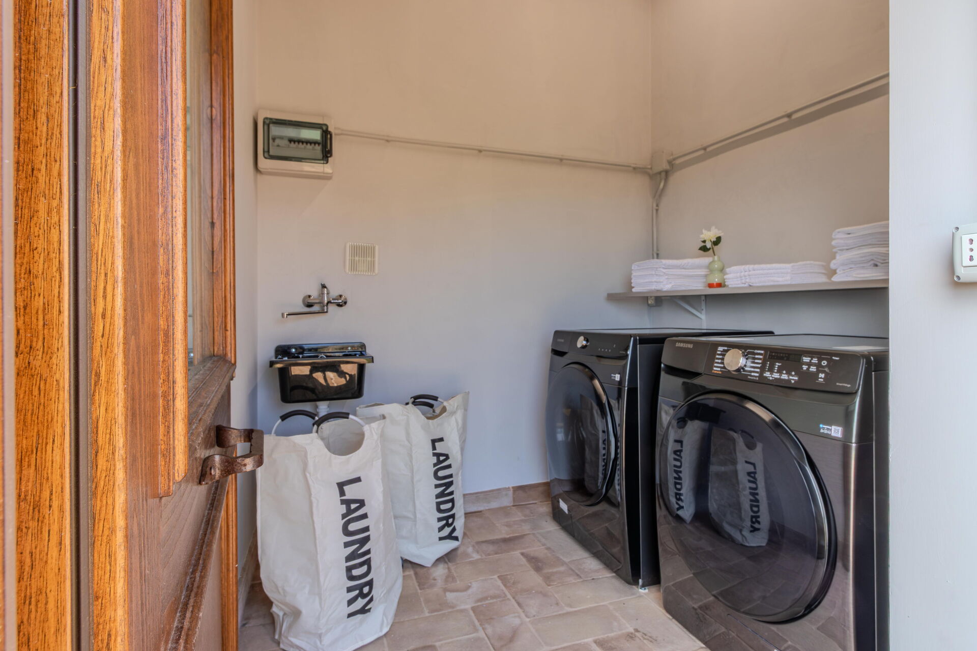 Første etasje (tilgjengelig fra hagen over bassenget, og ikke innvendig forbundet med de andre enhetene): utstyrt med vaskemaskin og tørketrommel.