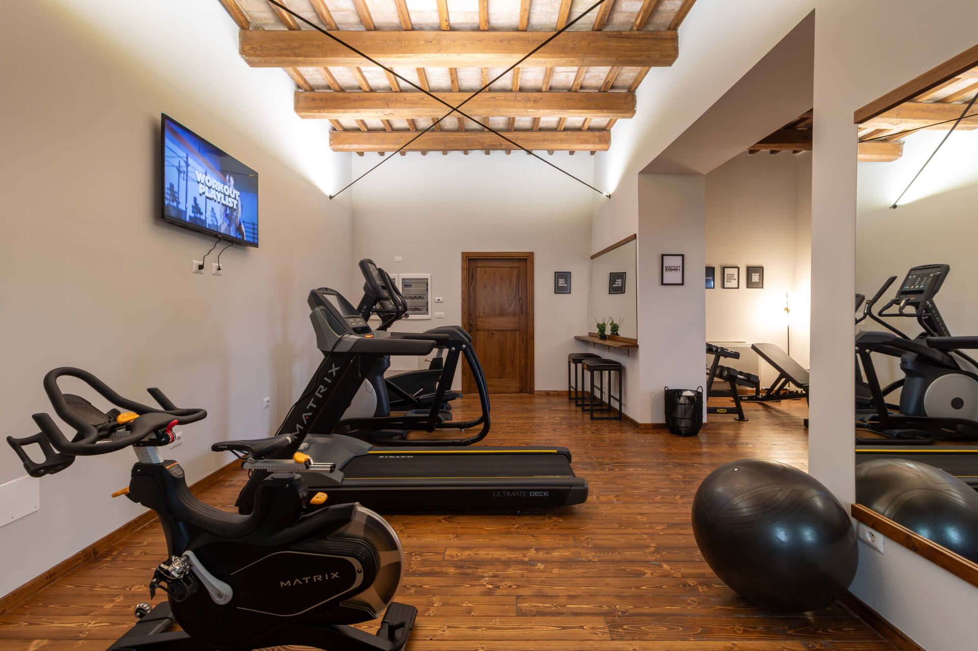 Første etasje (tilgjengelig fra hagen over bassenget, og ikke innvendig forbundet med de andre enhetene): treningsrom med treningsutstyr, WC og multisensoriske dusjer.