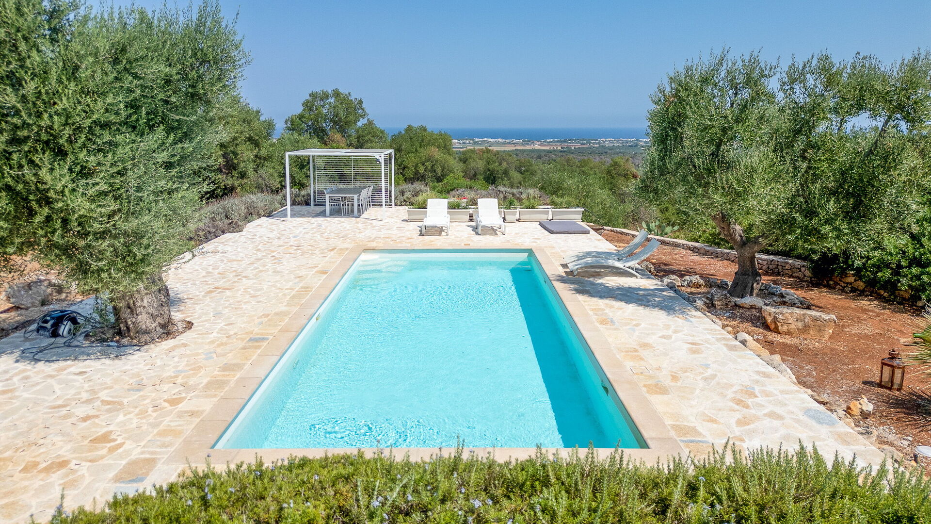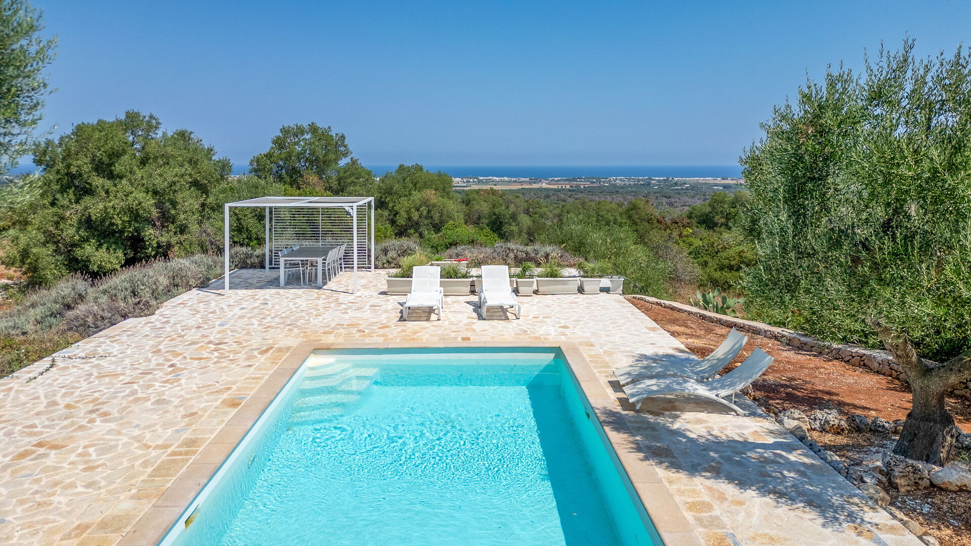 Villa Butterfly er et vidunderlig feriehus med basseng og fantastisk havutsikt i Puglia nær Carovigno.