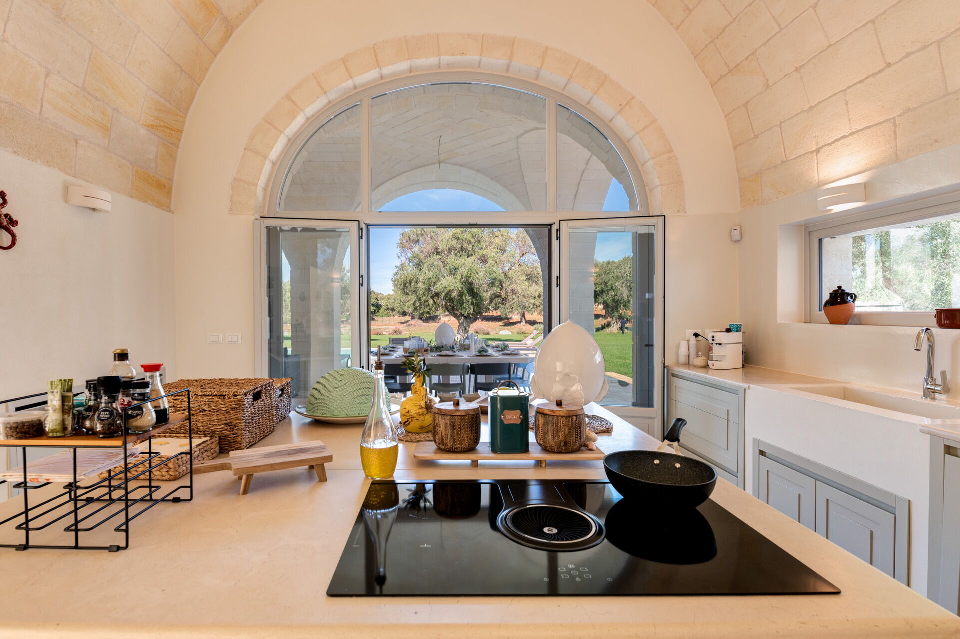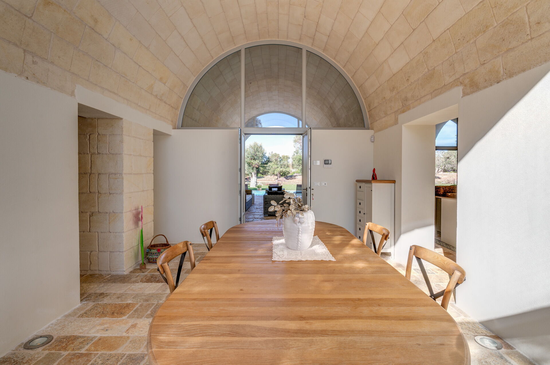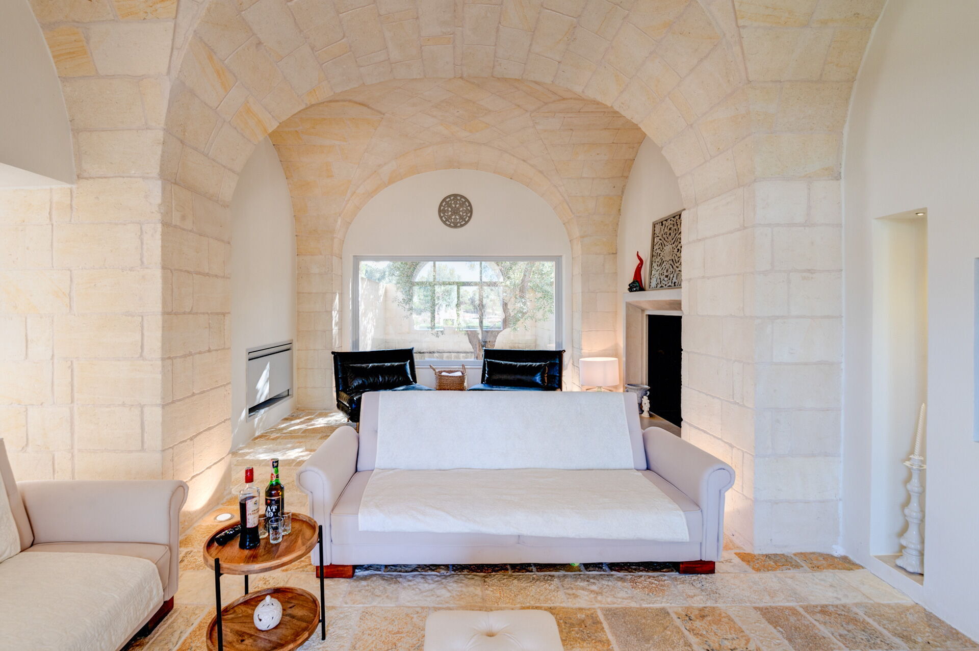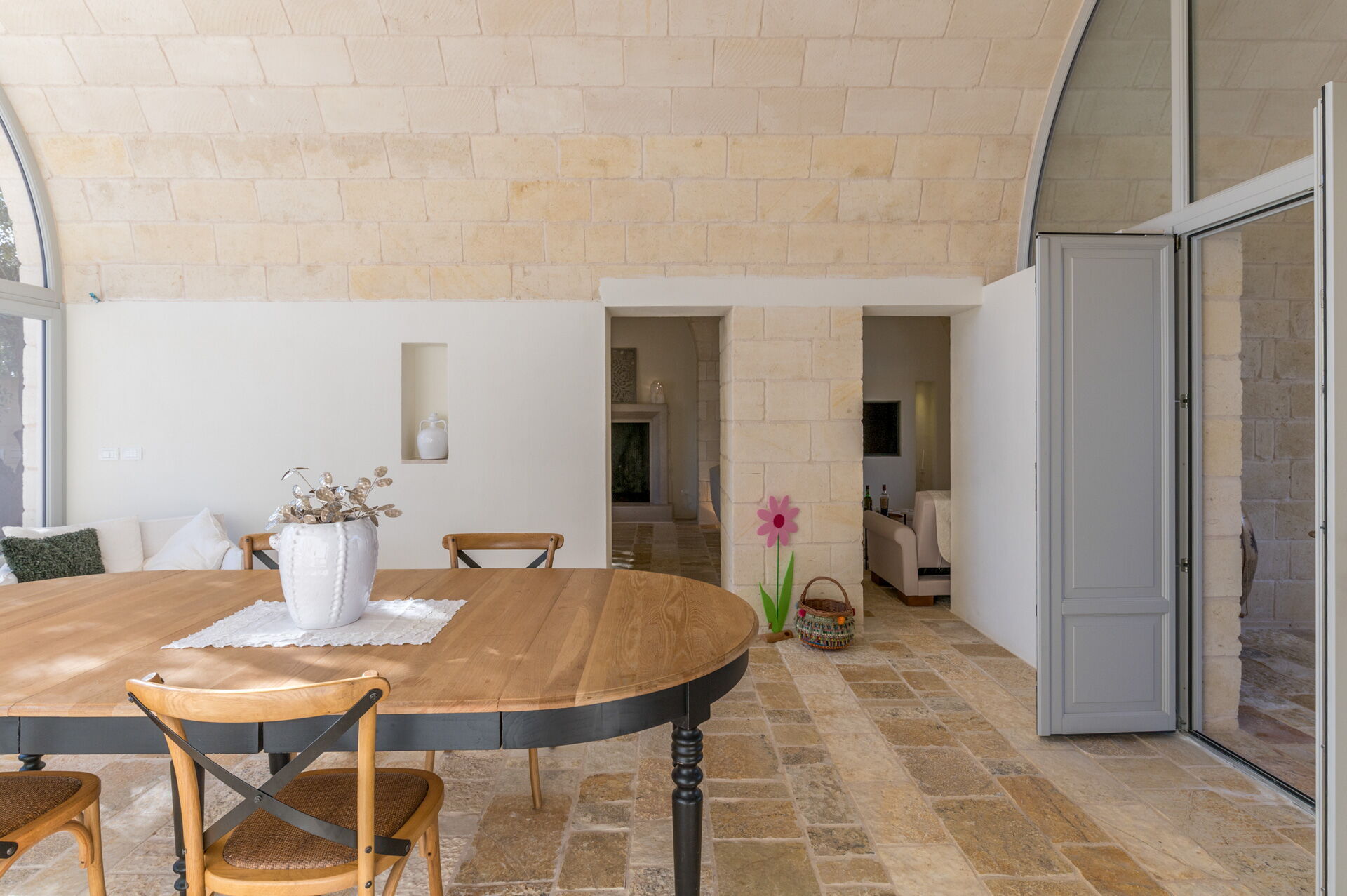 Feriehuset pent innredet, og er lyst takket være de store vinduene som harmonerer perfekt med den tradisjonelle Salento-arkitekturen (hvelvede tak, steinvegger og hvite vegger).