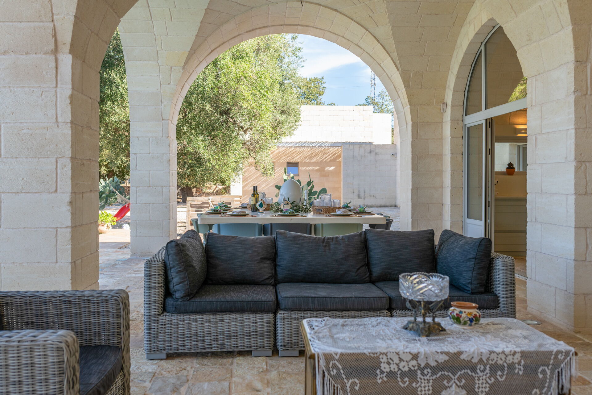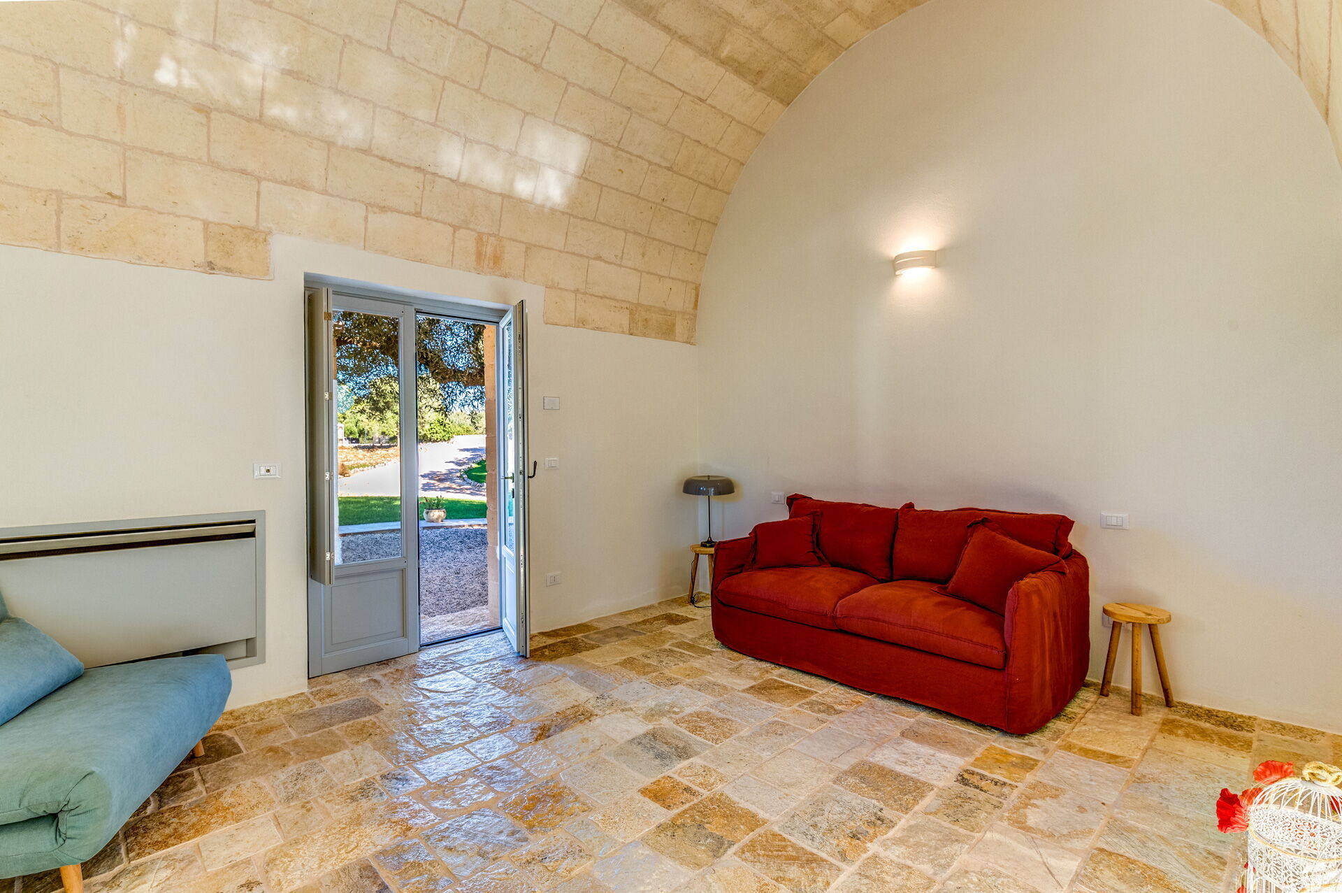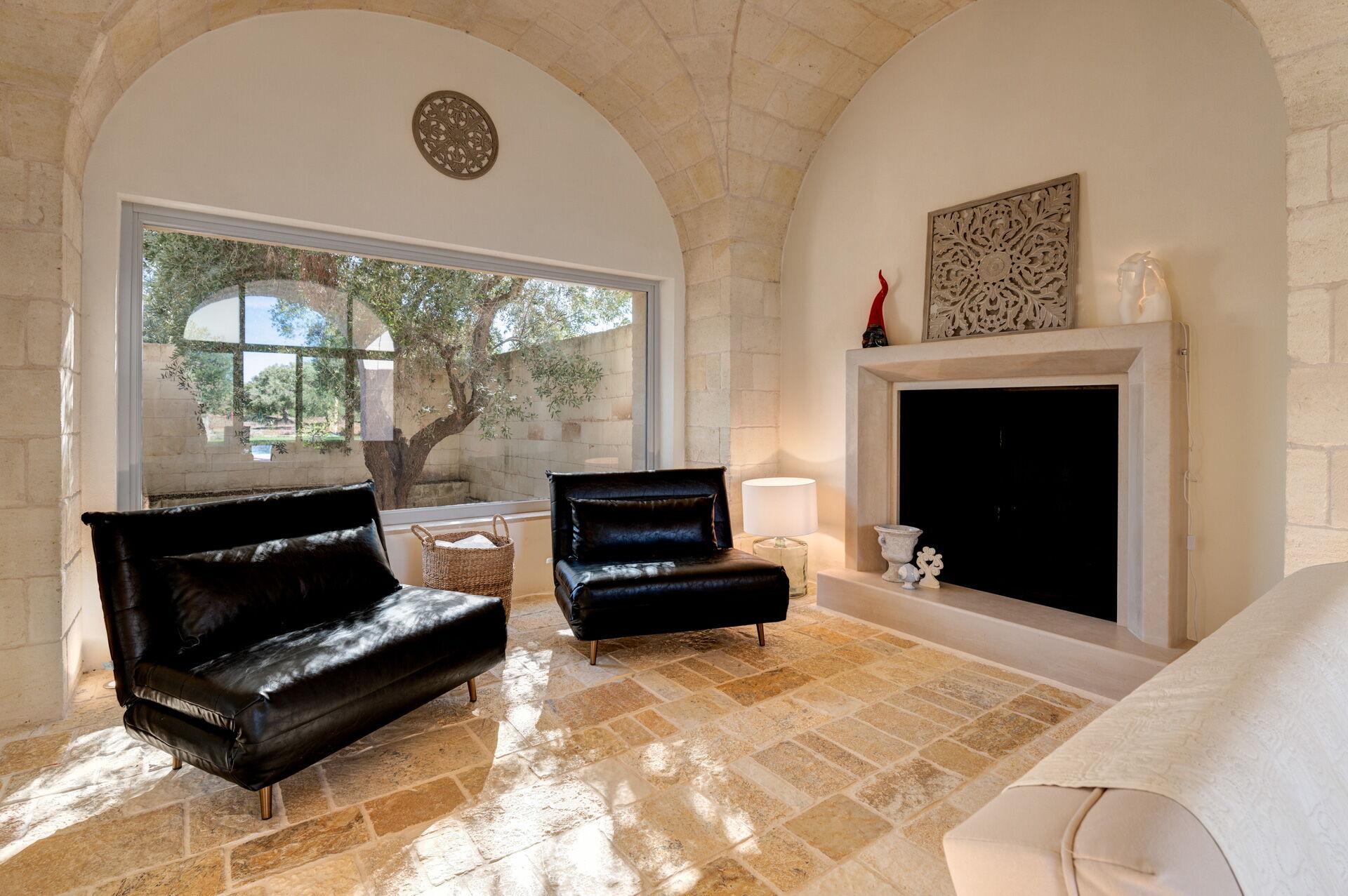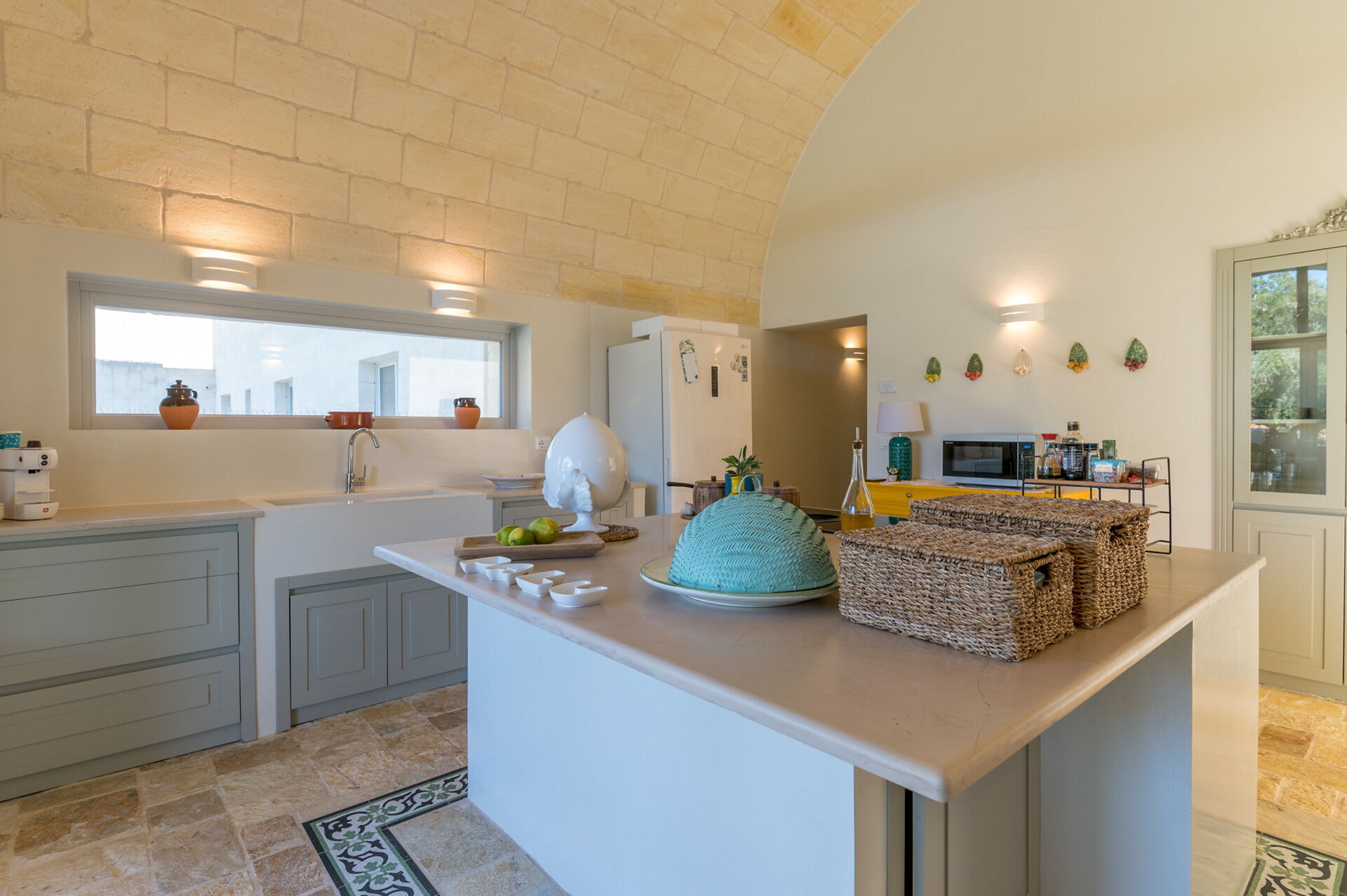 Feriehuset pent innredet, og er lyst takket være de store vinduene som harmonerer perfekt med den tradisjonelle Salento-arkitekturen (hvelvede tak, steinvegger og hvite vegger).