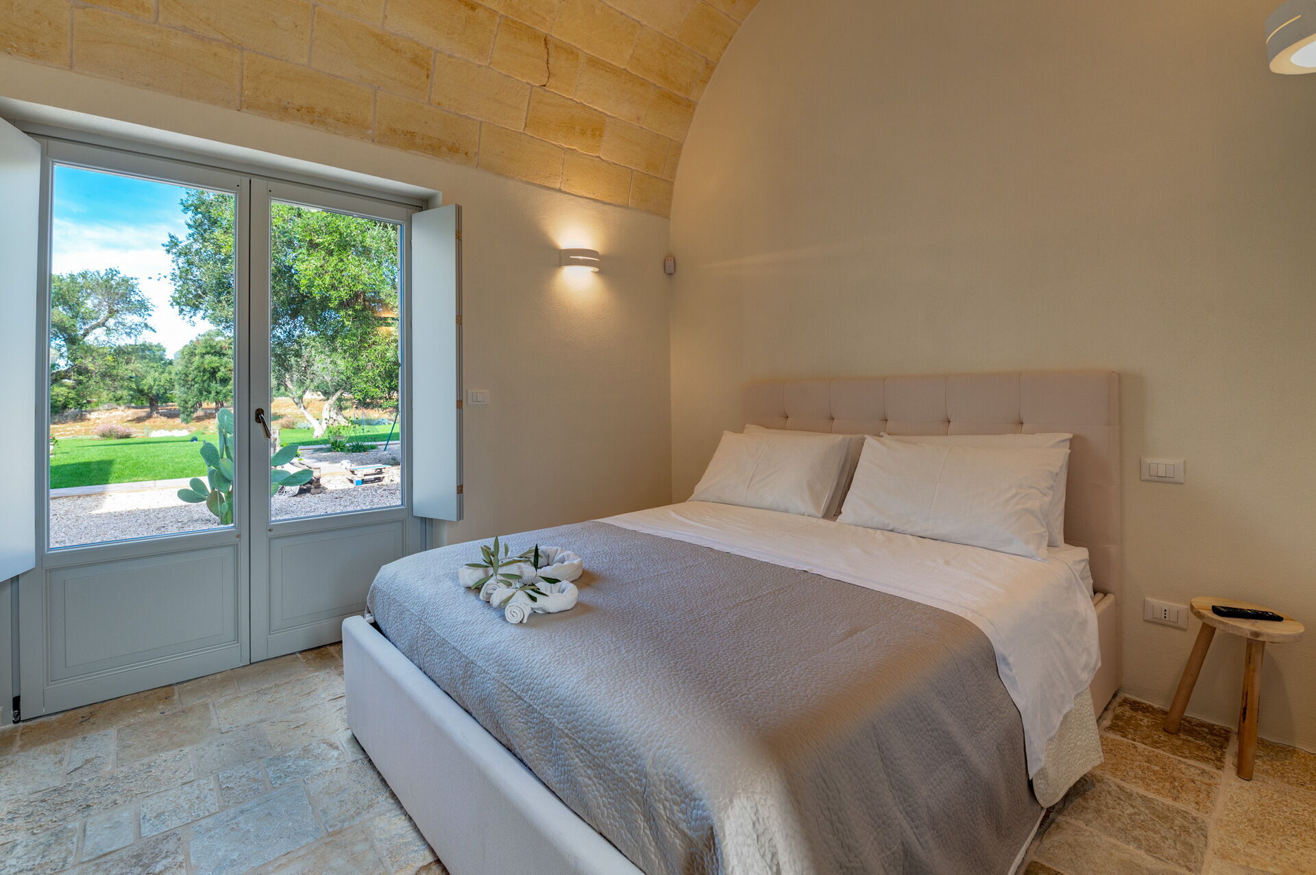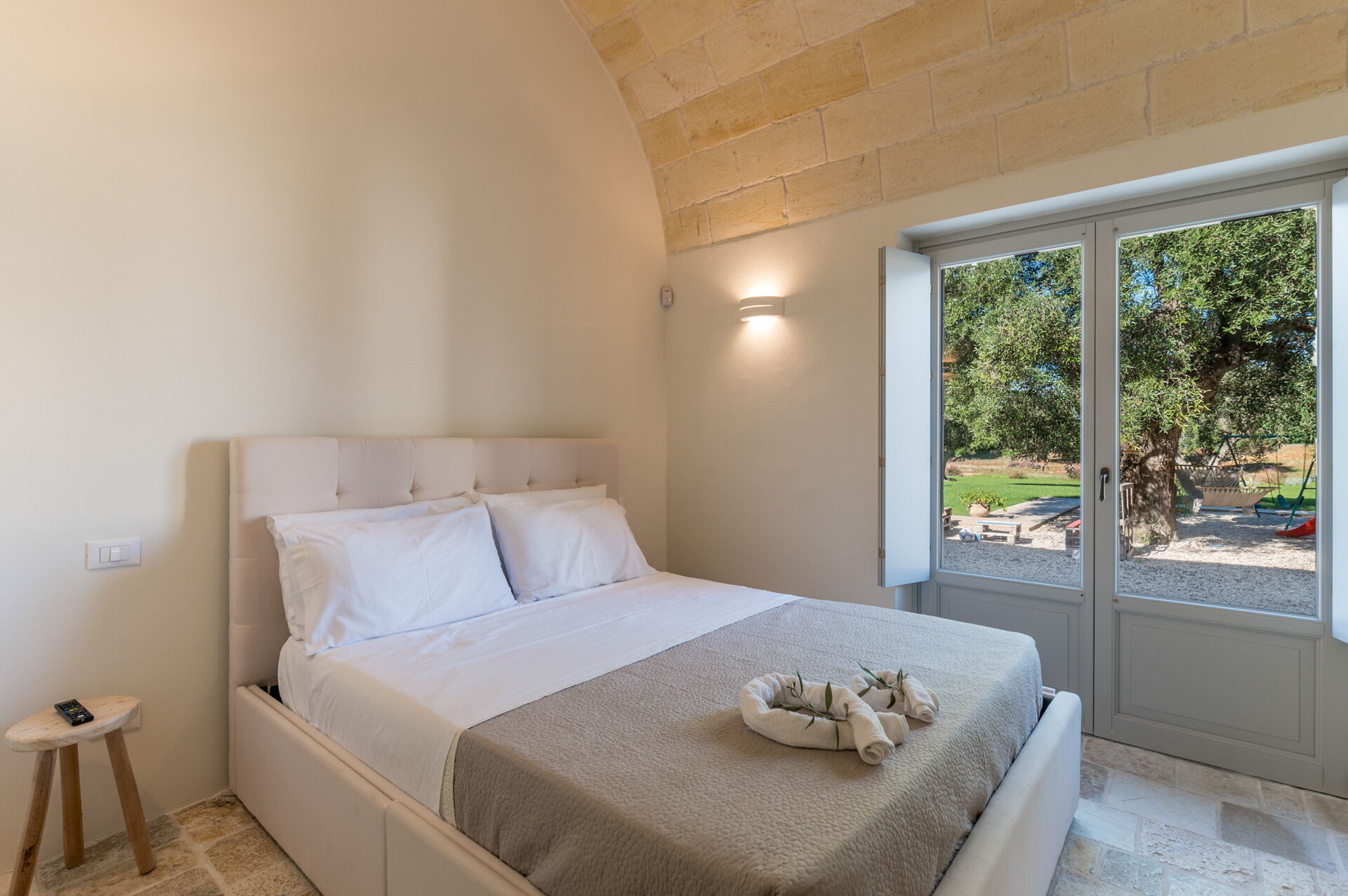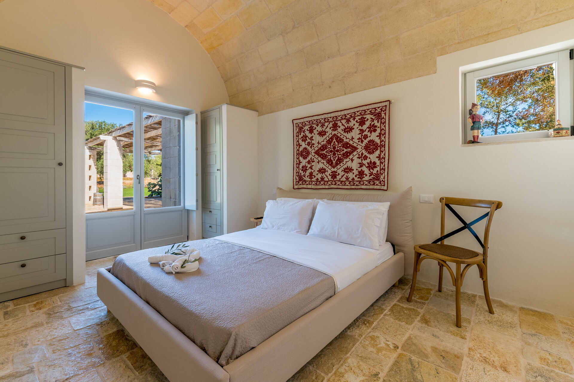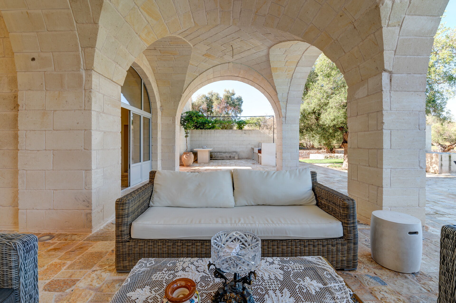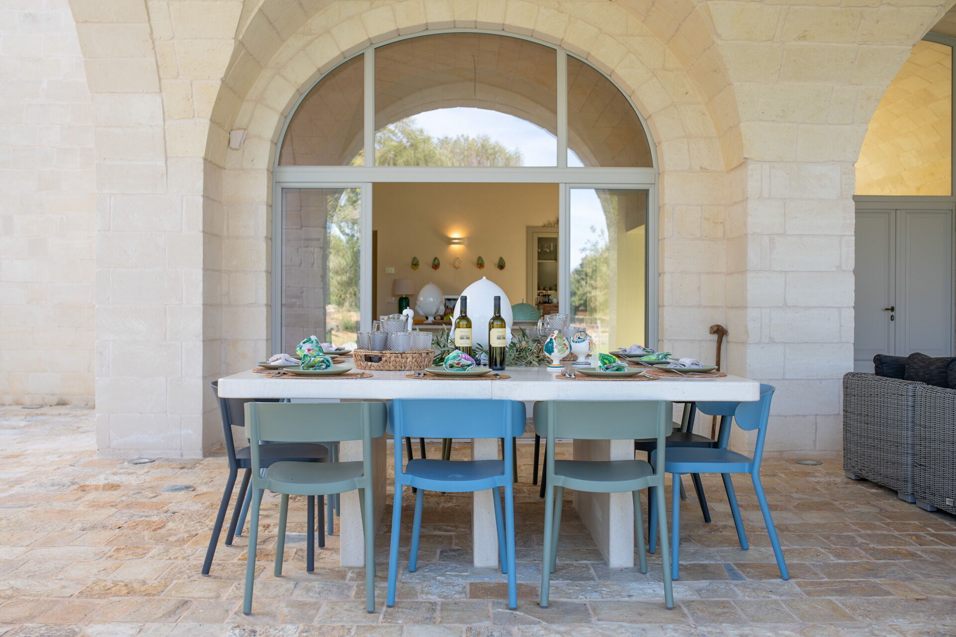 Feriehuset pent innredet, og er lyst takket være de store vinduene som harmonerer perfekt med den tradisjonelle Salento-arkitekturen (hvelvede tak, steinvegger og hvite vegger).