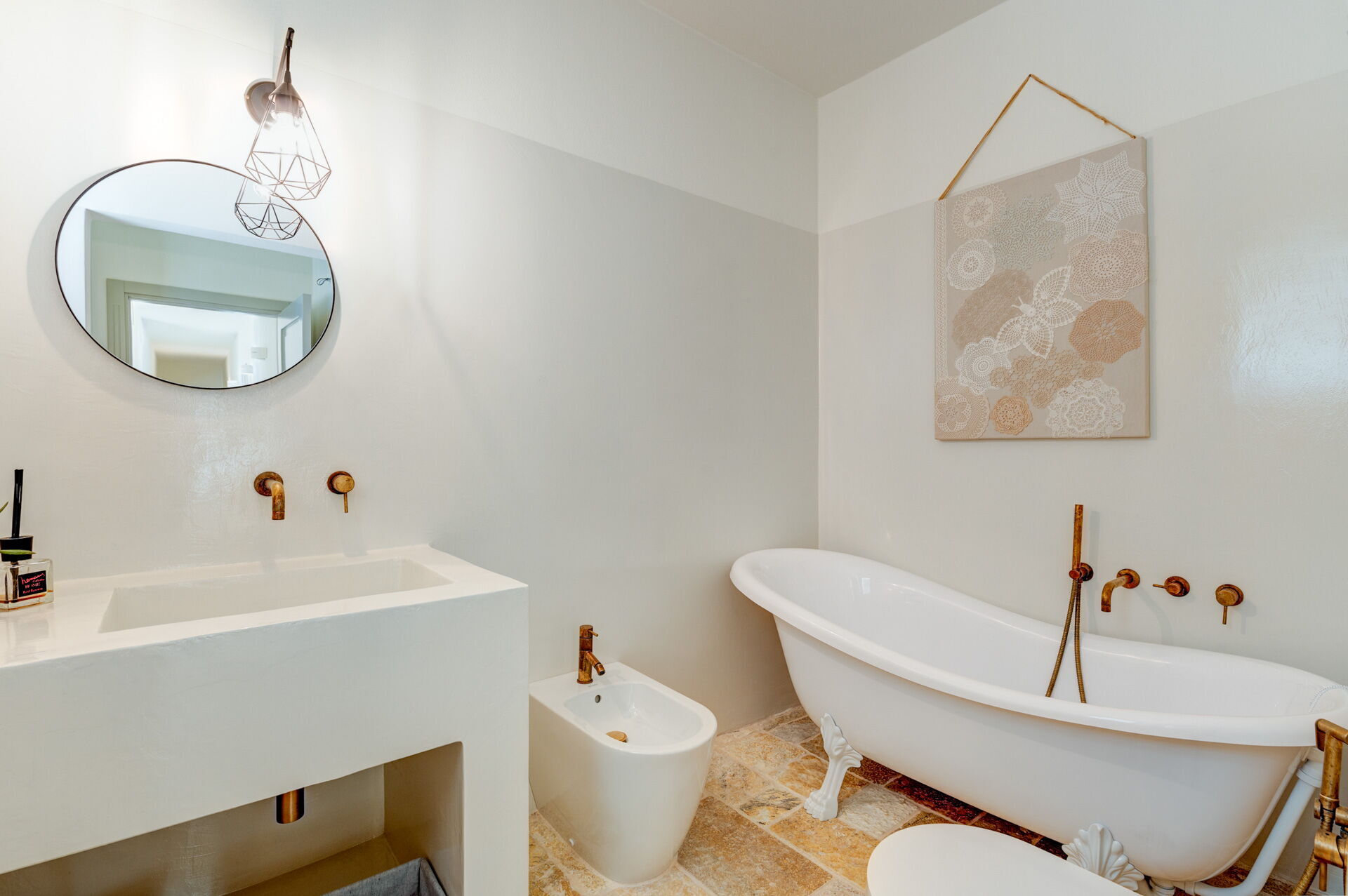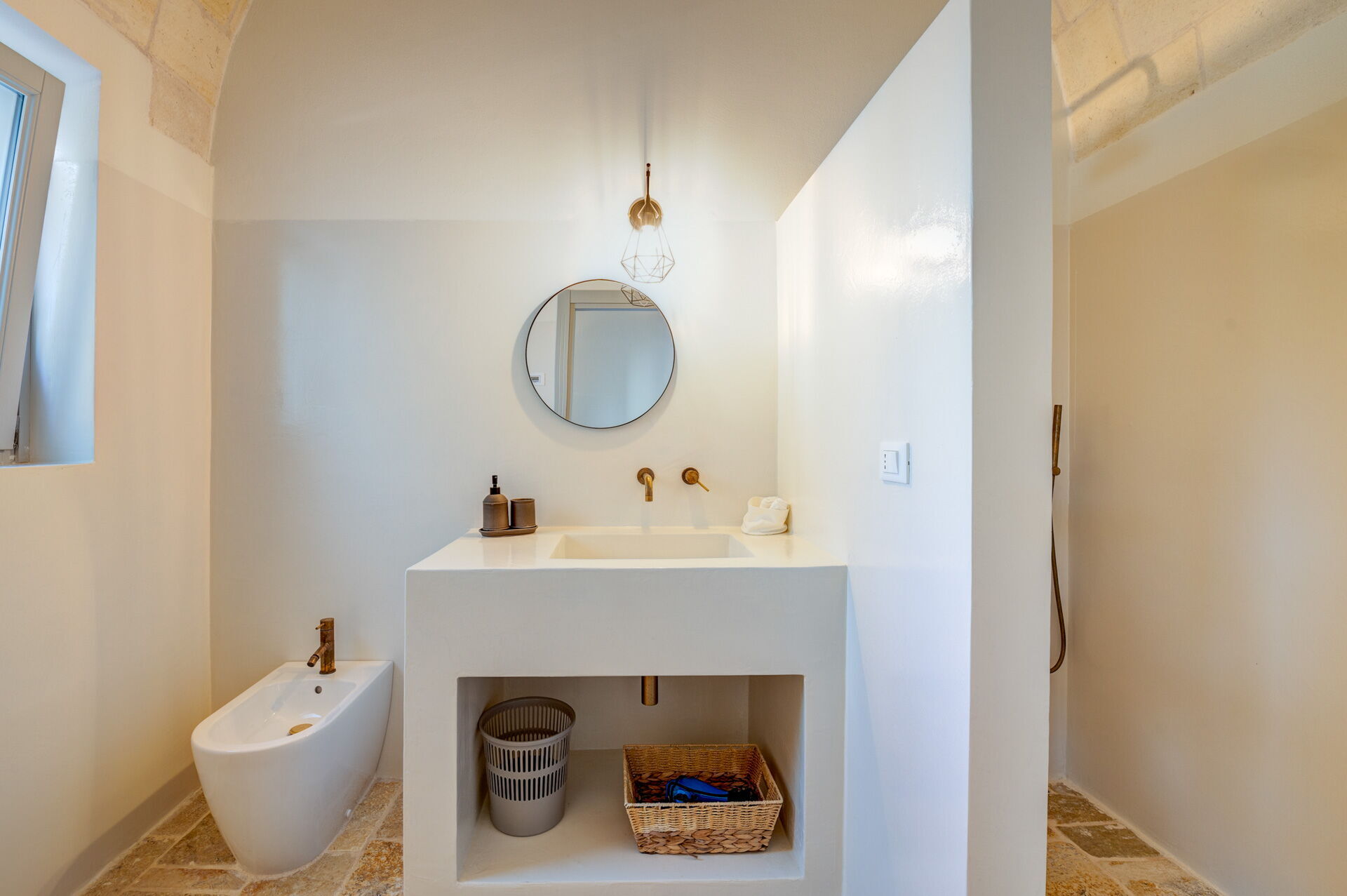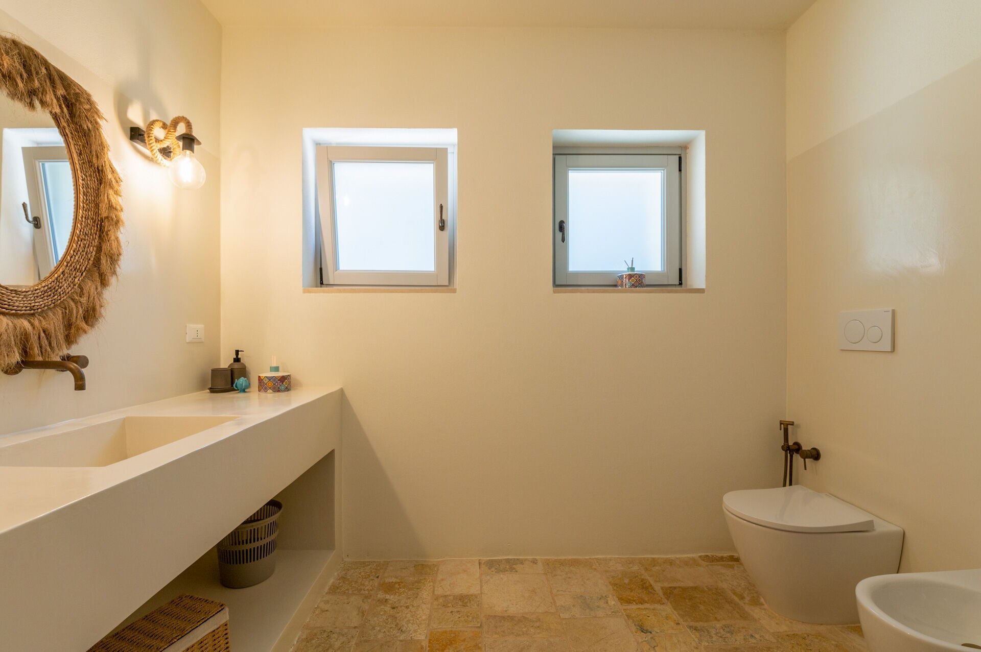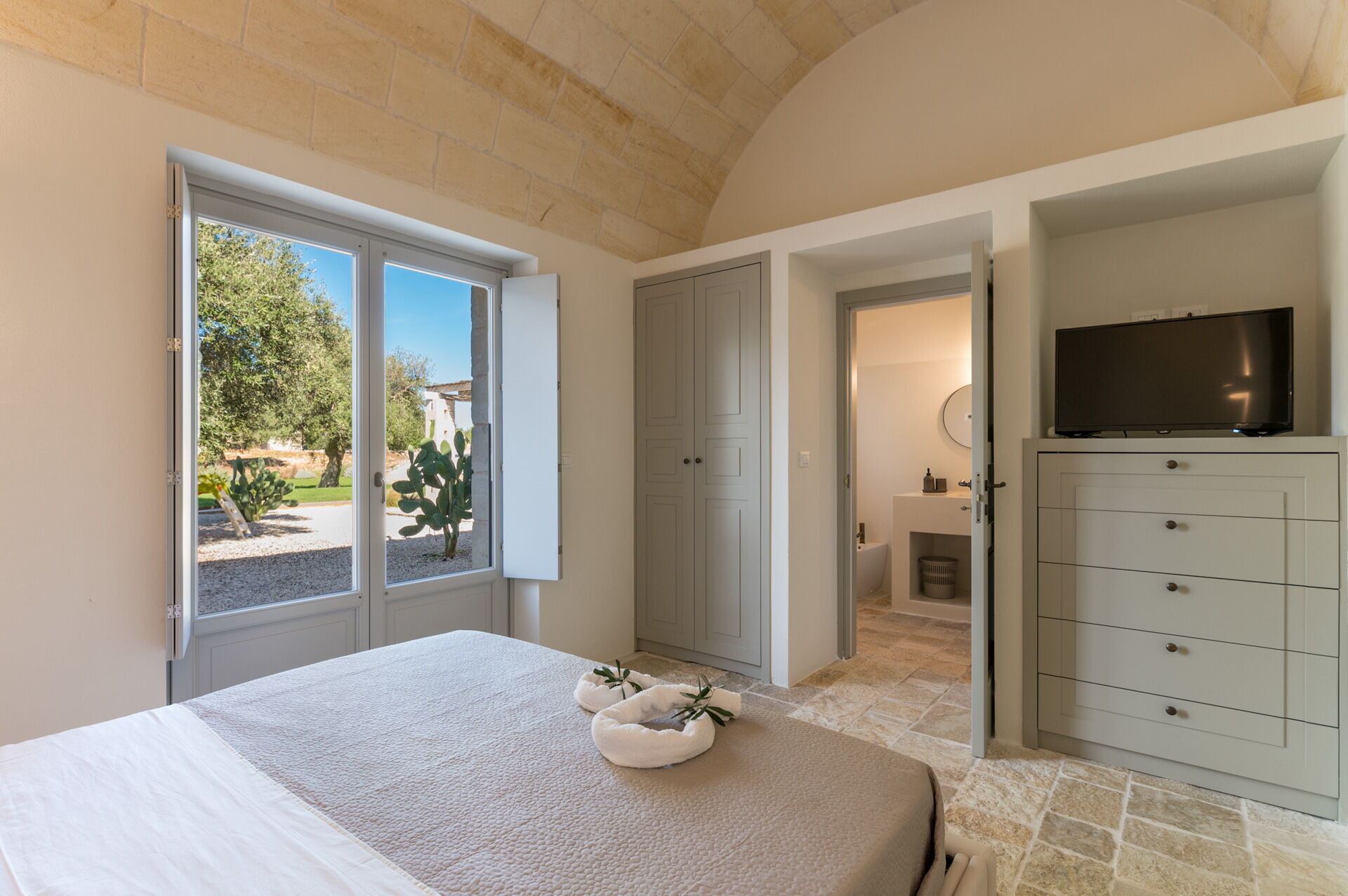 Feriehuset pent innredet, og er lyst takket være de store vinduene som harmonerer perfekt med den tradisjonelle Salento-arkitekturen (hvelvede tak, steinvegger og hvite vegger).