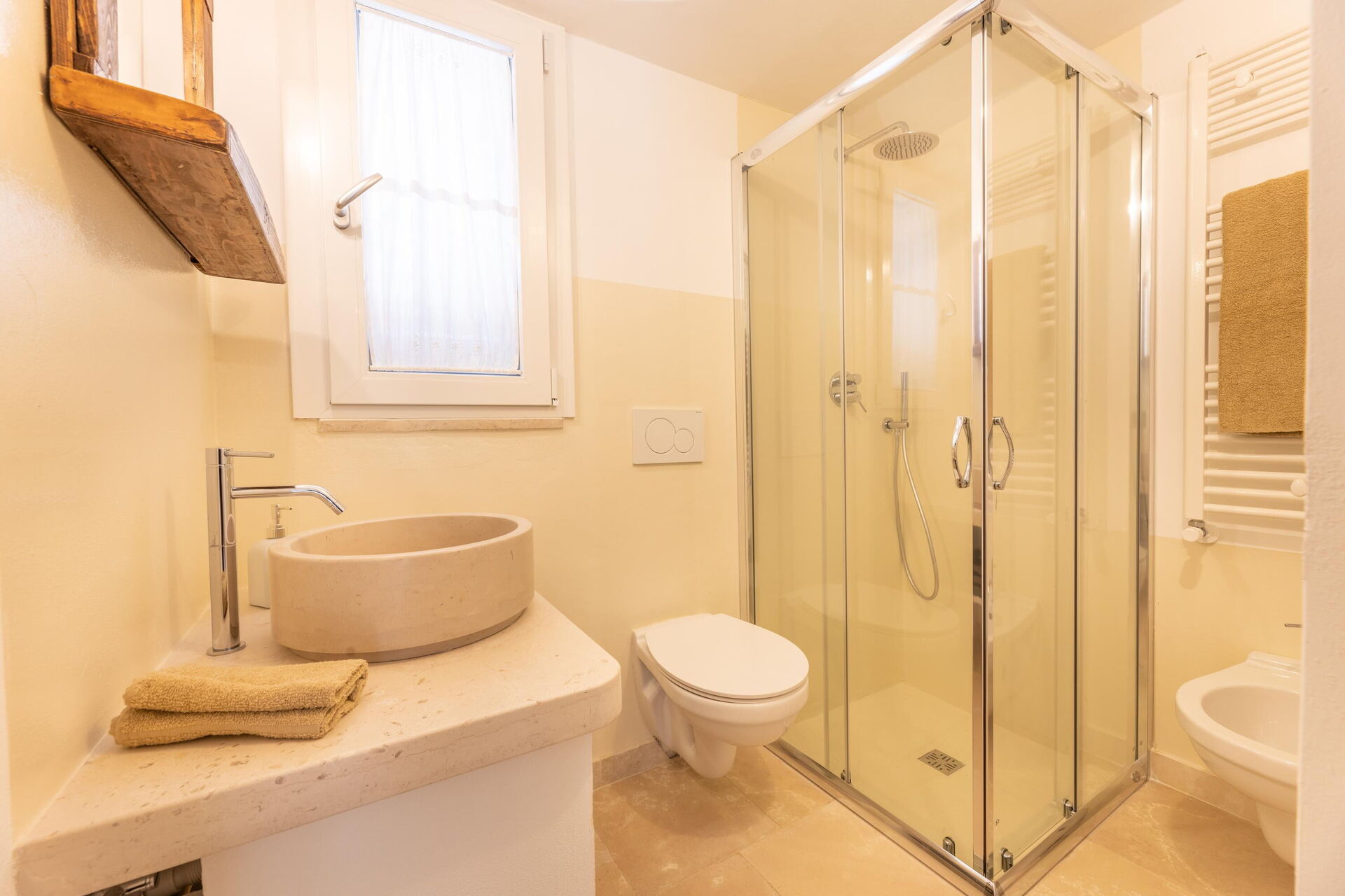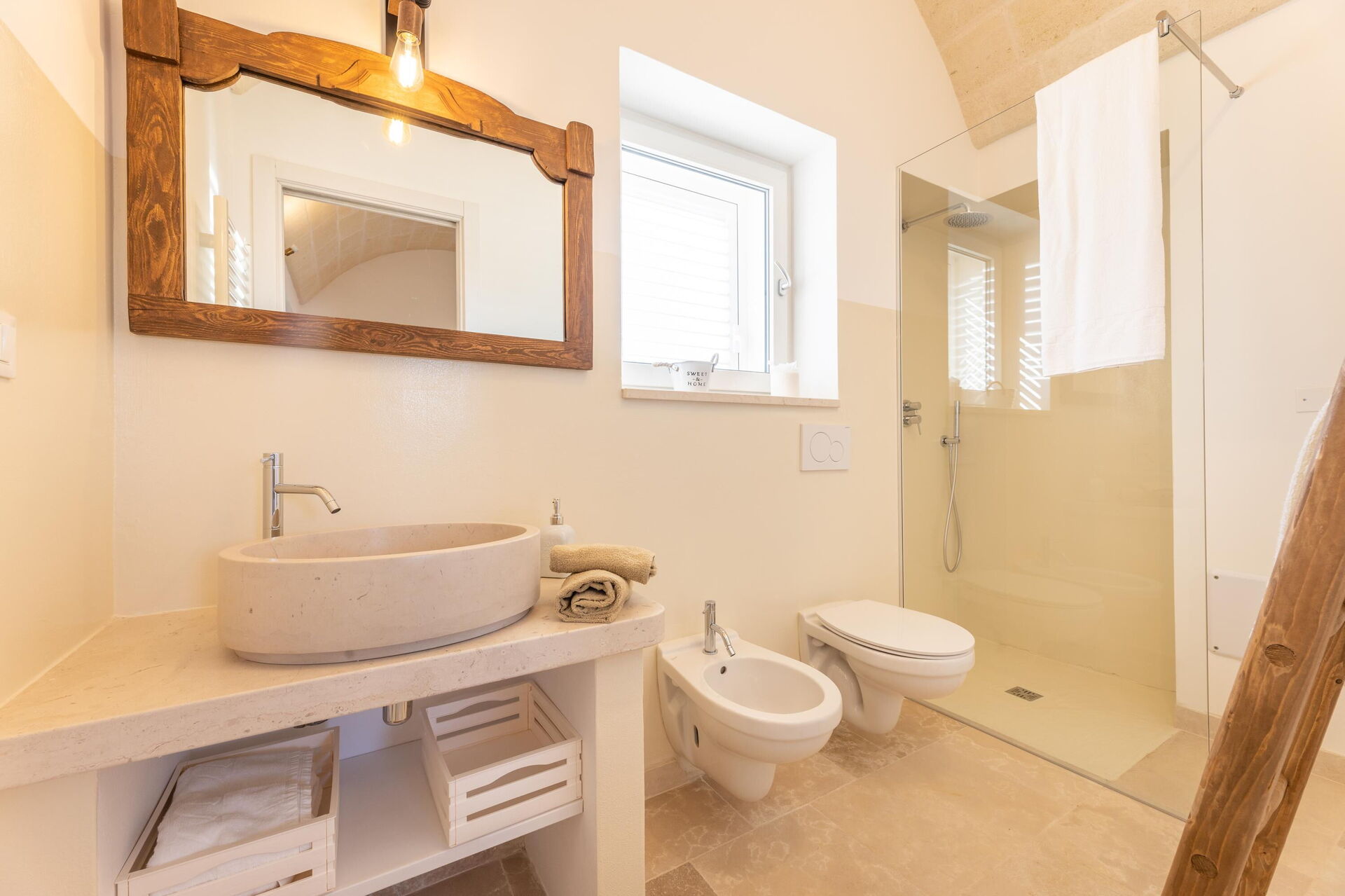 Inngang til kjøkken (oppvaskmaskin, fryser og stekeovn) og stue med dobbel sovesofa (tilgjengelig på forespørsel og mot et pristillegg), 1 dobbeltrom med eget bad med dusj, 1 stort dobbeltrom i trullodelen med eget bad med dusj