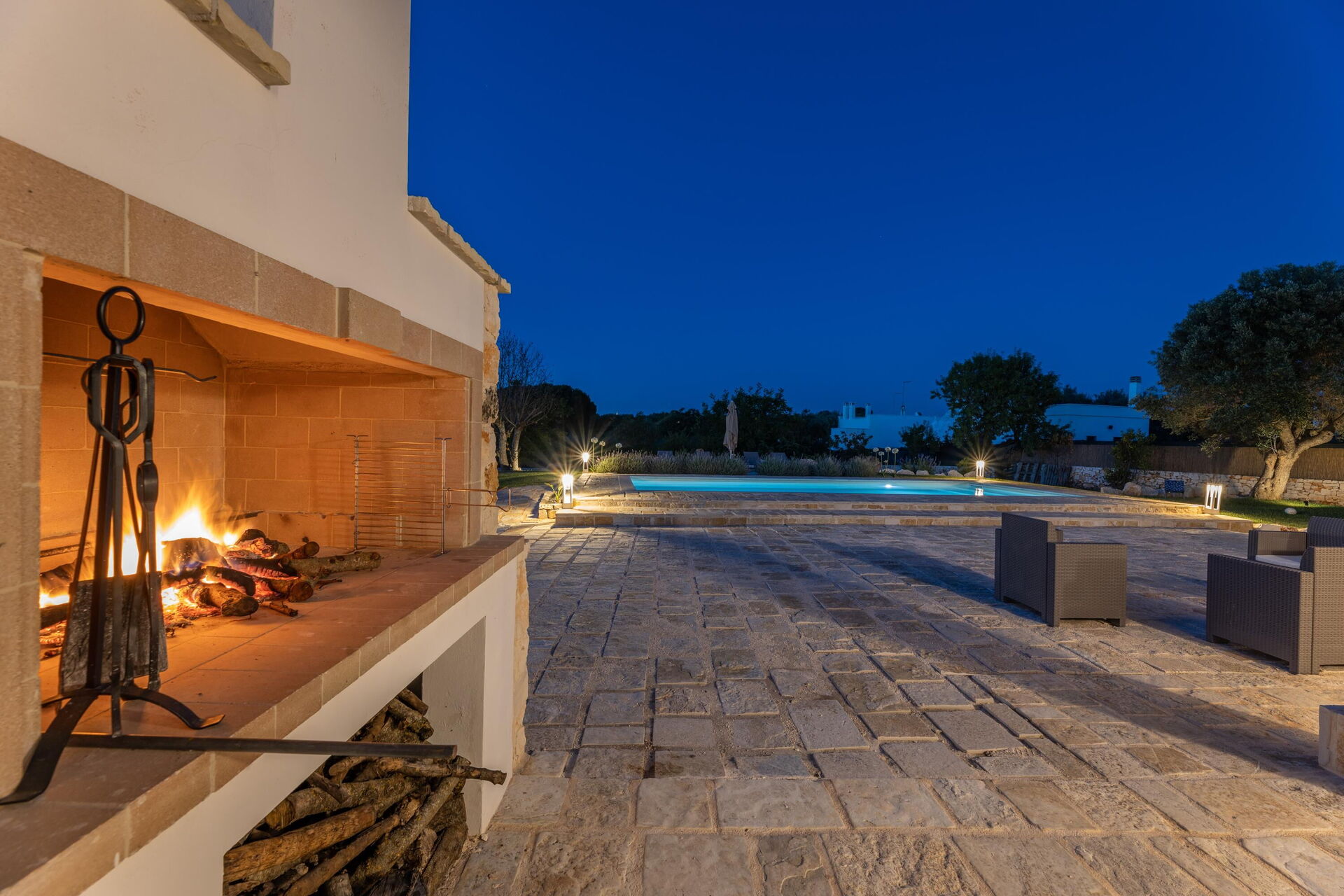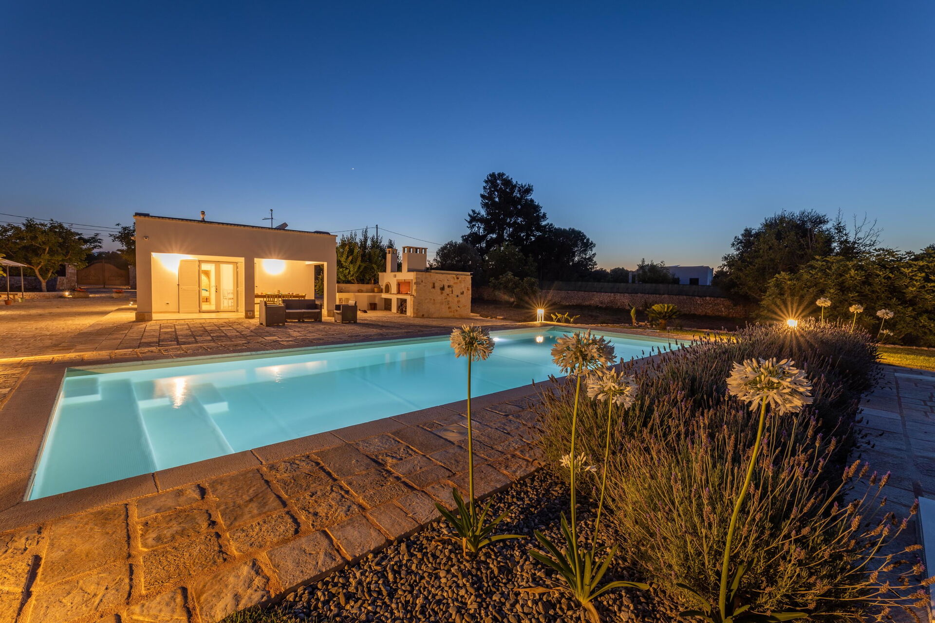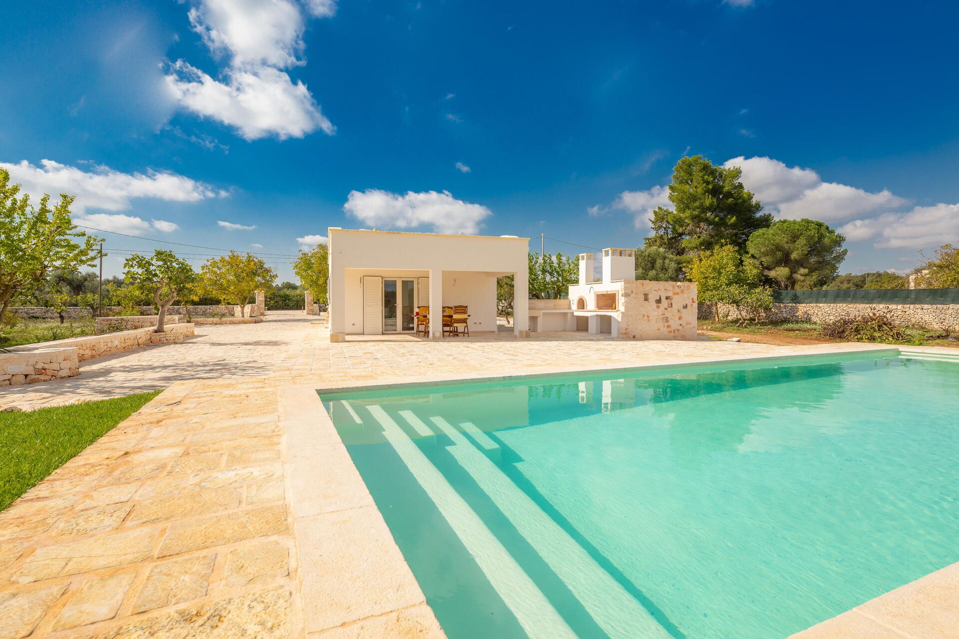 Hagen er ca 4000 kvm stor, inngjerdet, har et elegant svømmebasseng med romersk trapp og gir god plass til spasertur mellom trær og oliventrær.