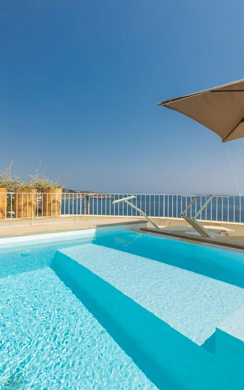 - Terrasse med panoramautsikt over sjøen og privat oppvarmet svømmebasseng (3 m x 3 m, dybde 1.3 m)