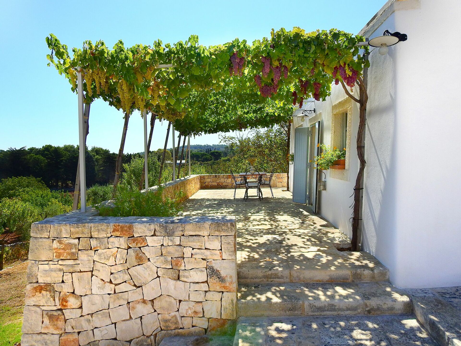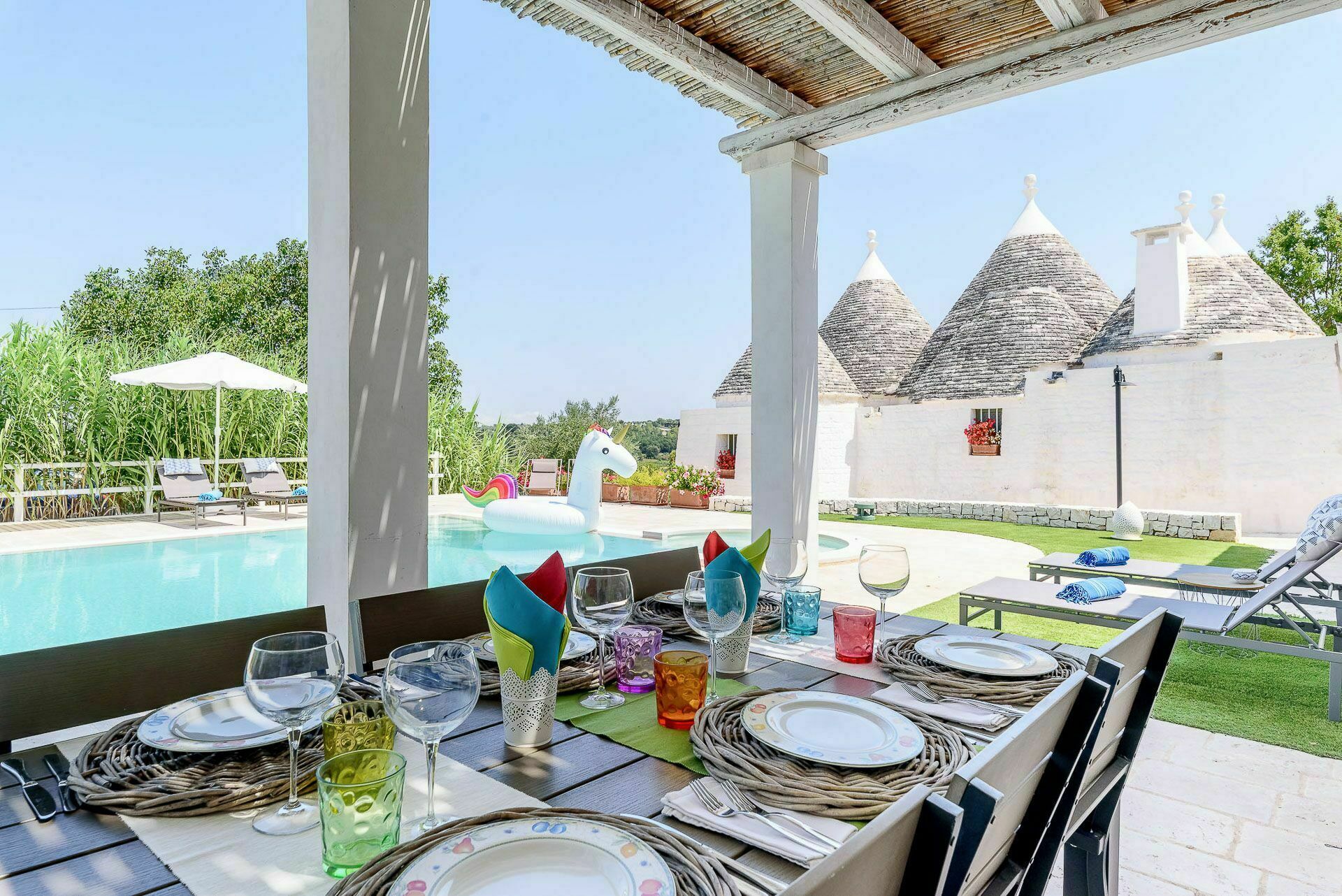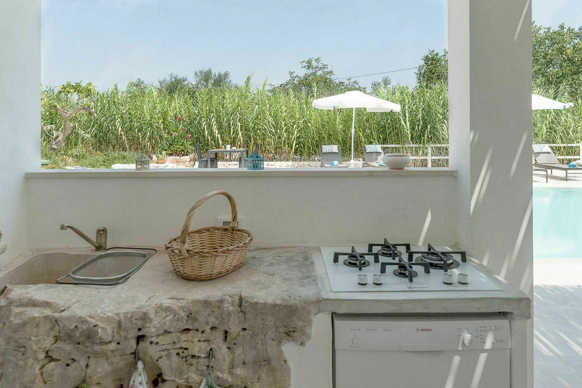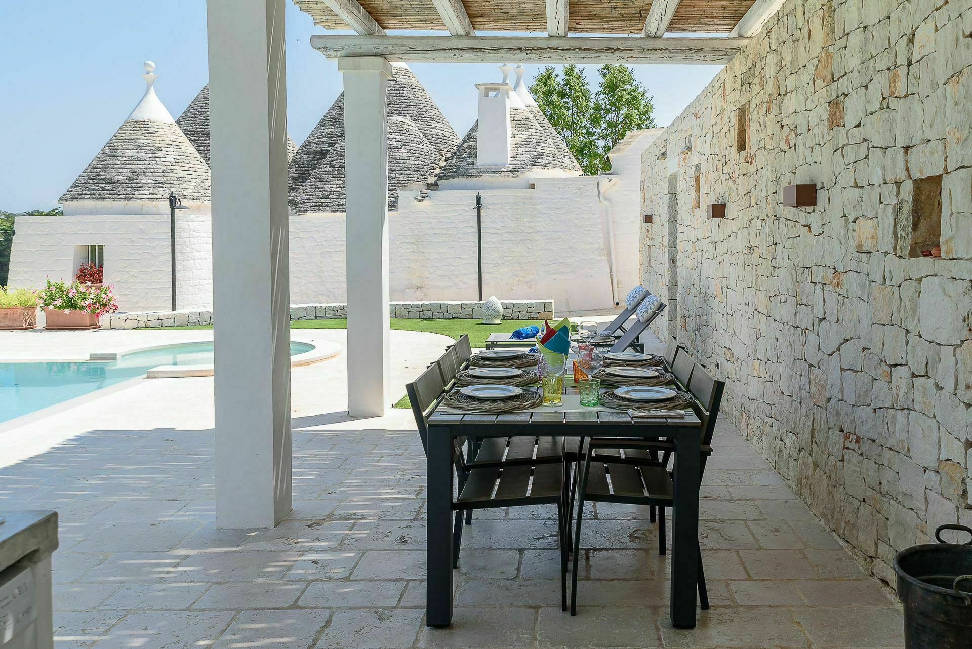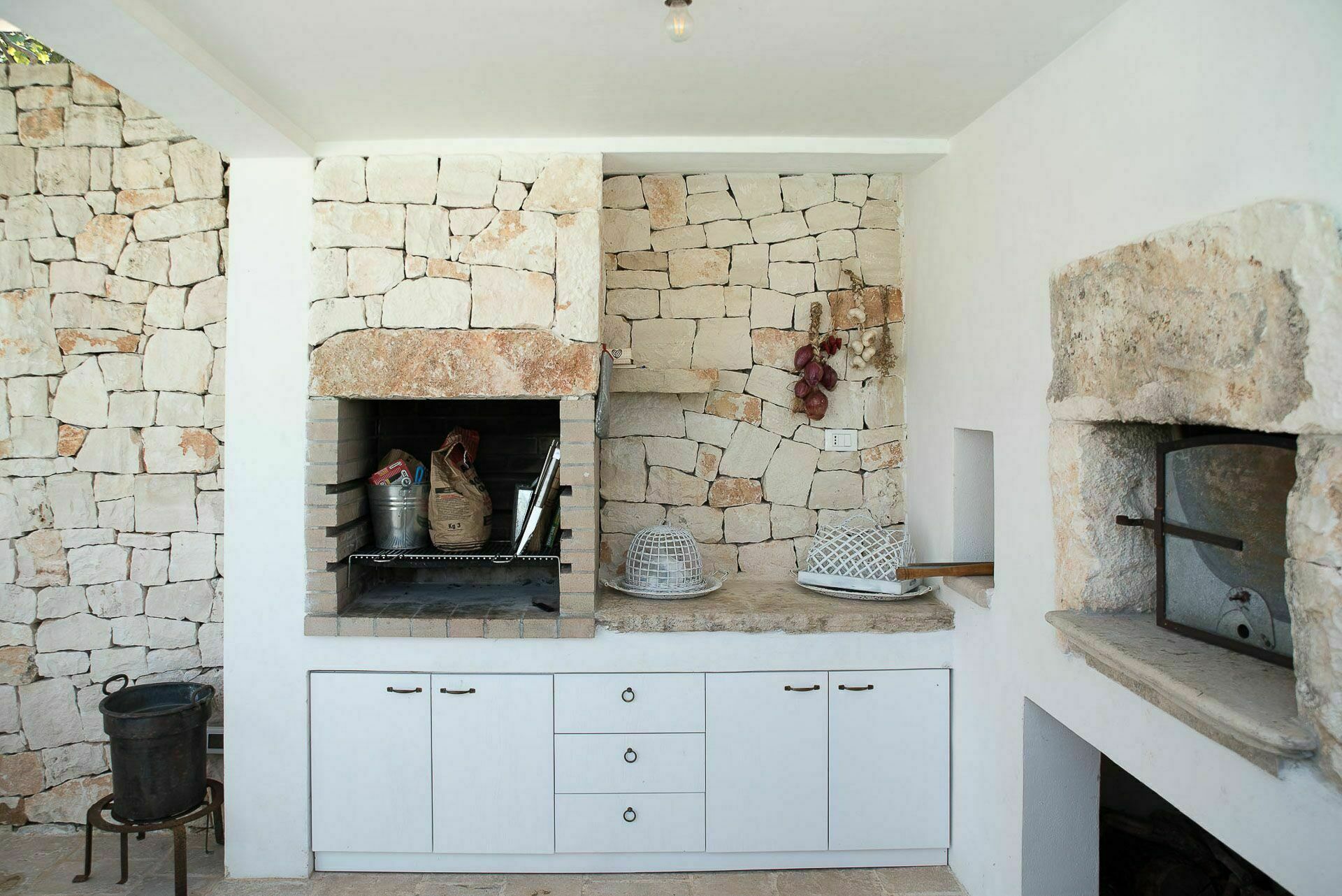 Trulloutleien har også en stor overbygd veranda nær bassenget med et utendørs kjøkken med oppvaskmaskin, vedovn, grill og spiseplass. Nær verandaen er det et salongområde med steinseter.