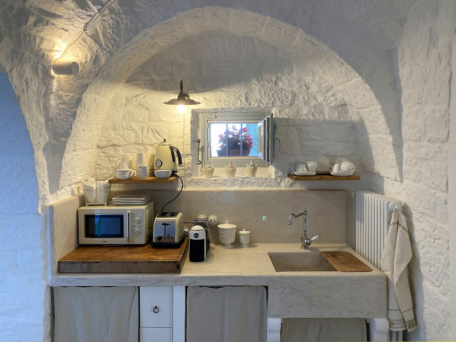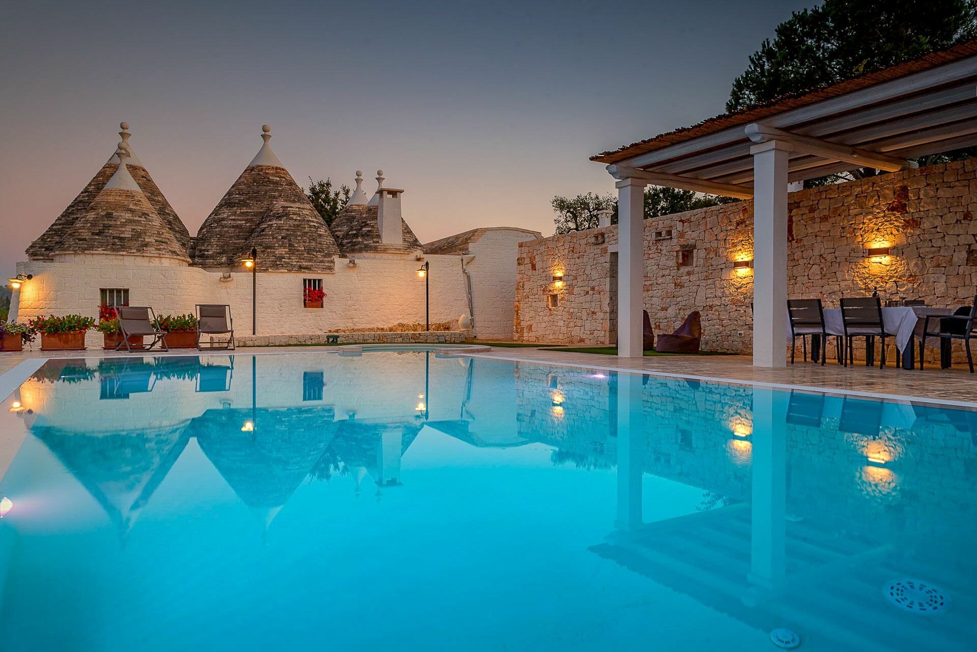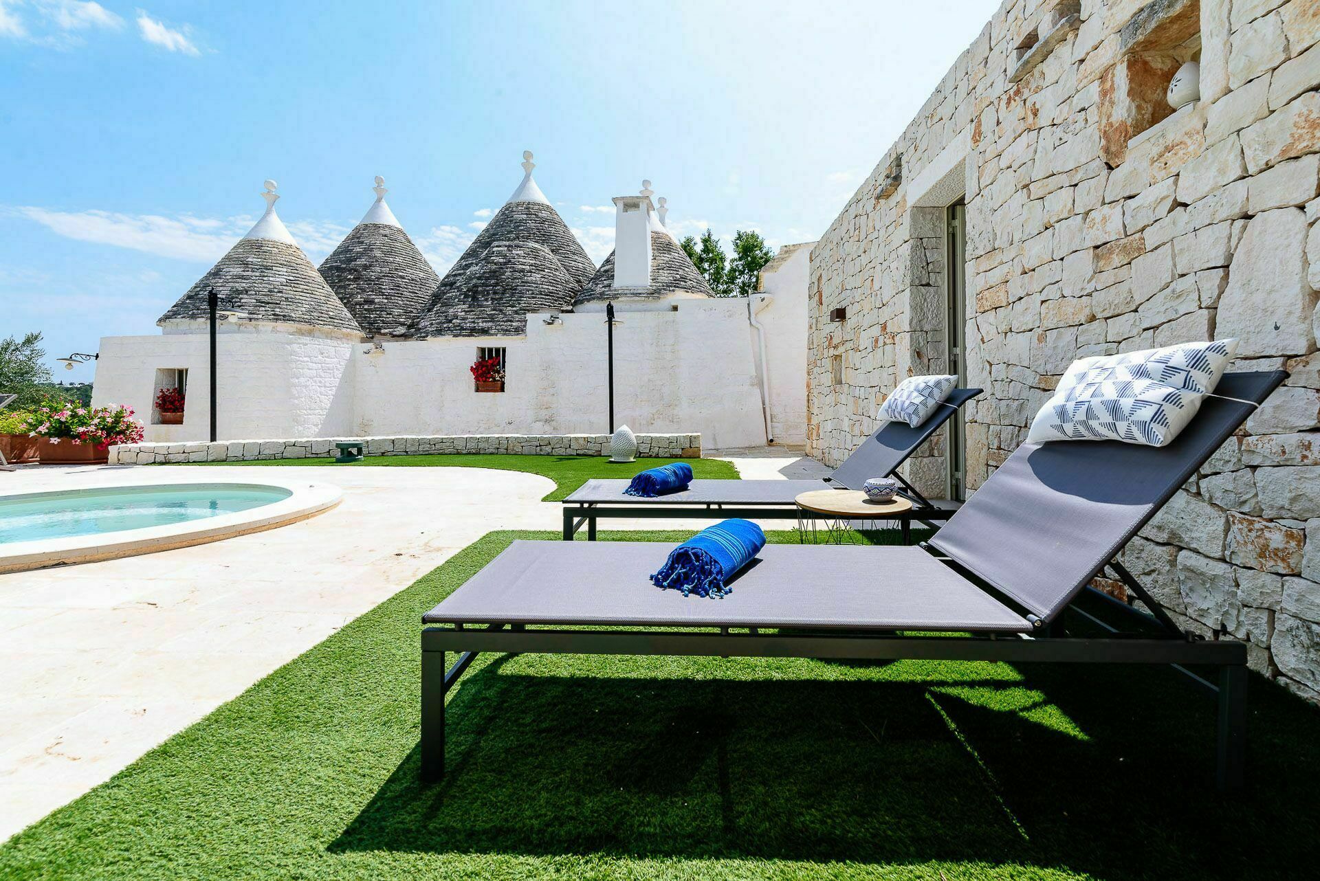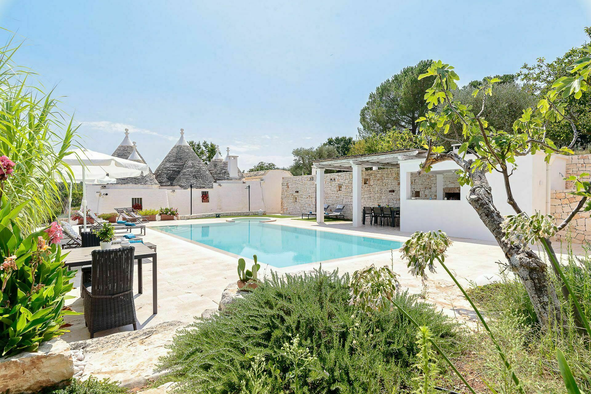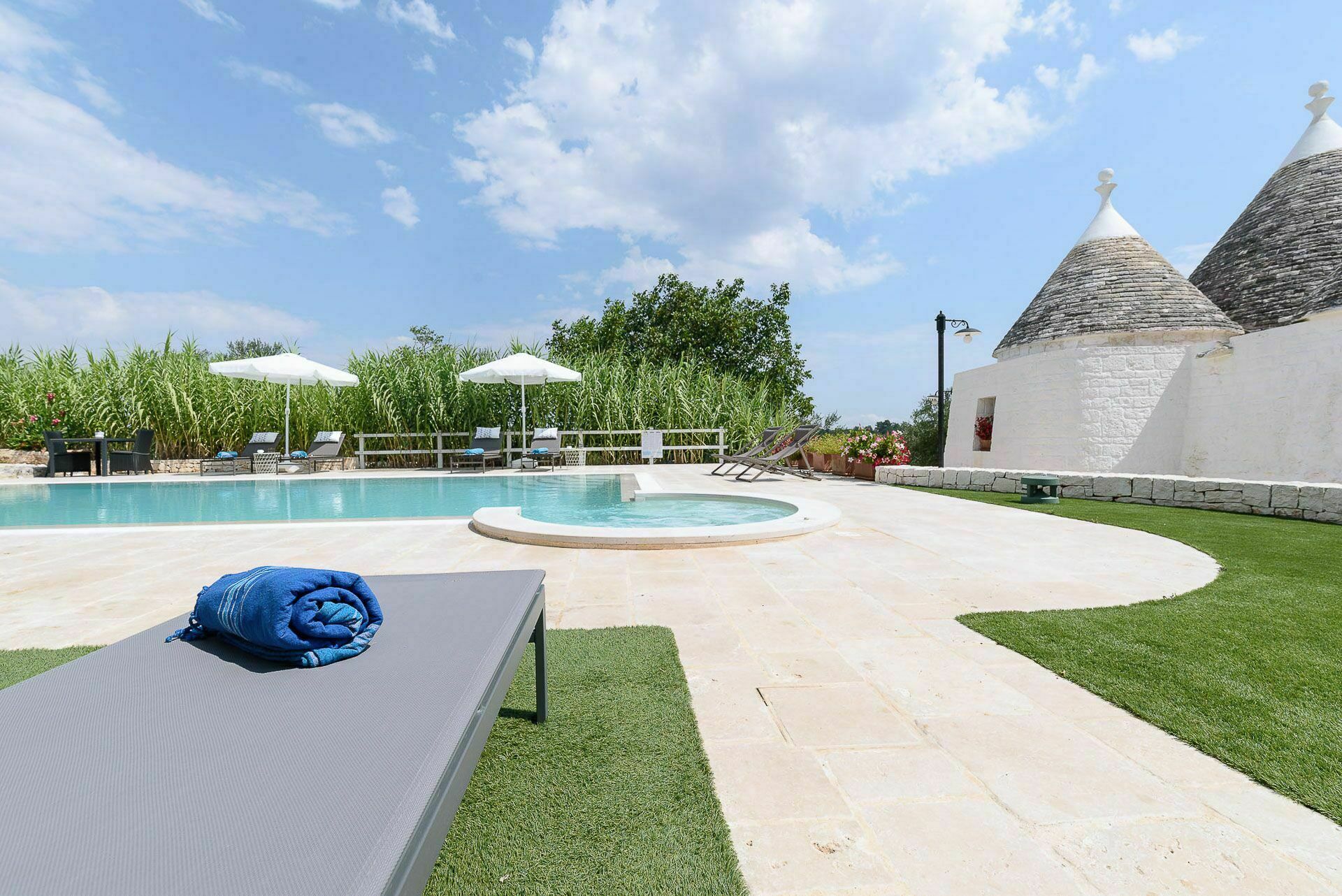 Trulloutleien har også en stor overbygd veranda nær bassenget med et utendørs kjøkken med oppvaskmaskin, vedovn, grill og spiseplass. Nær verandaen er det et salongområde med steinseter.