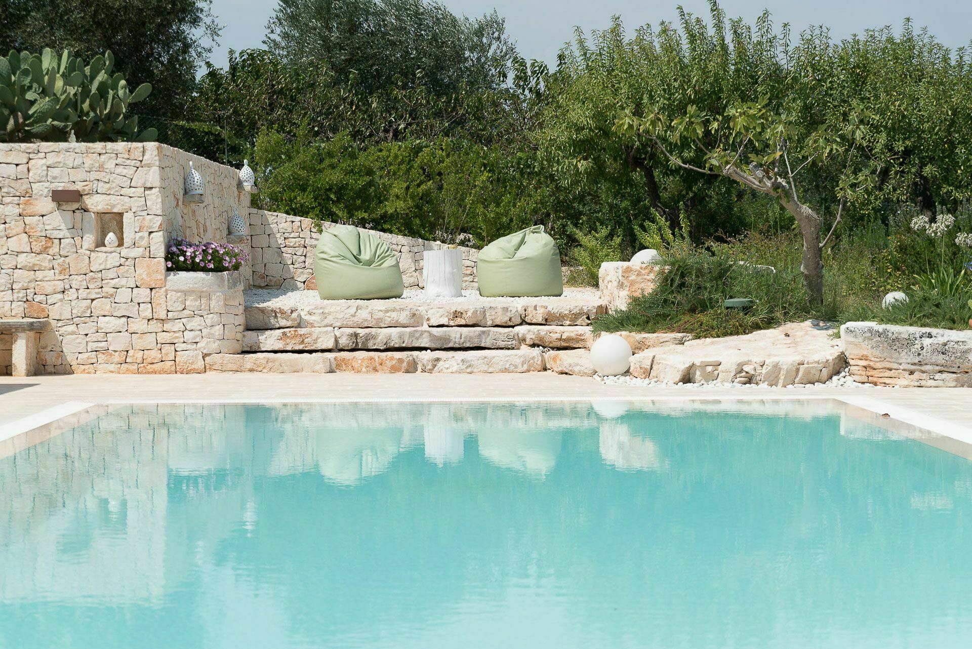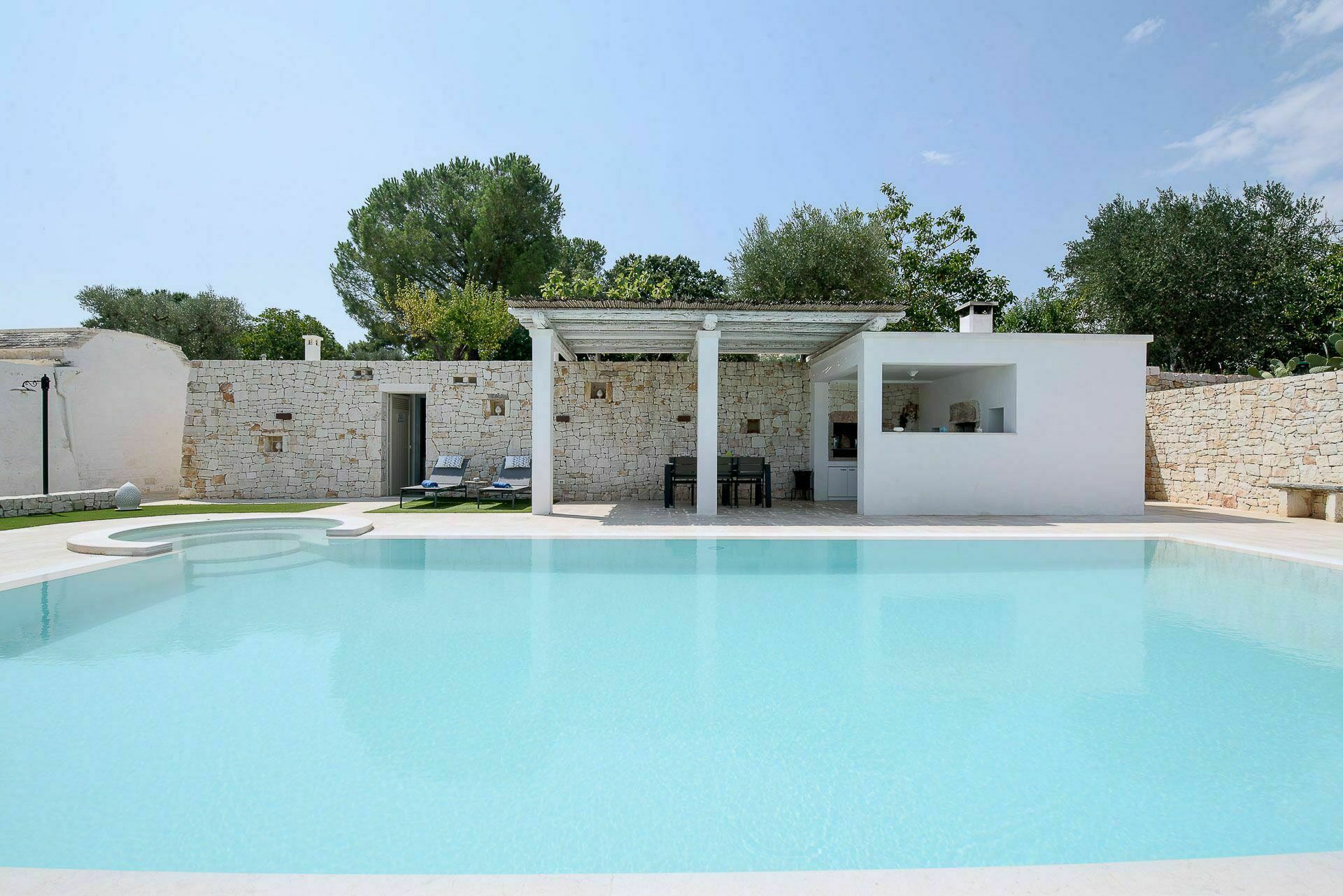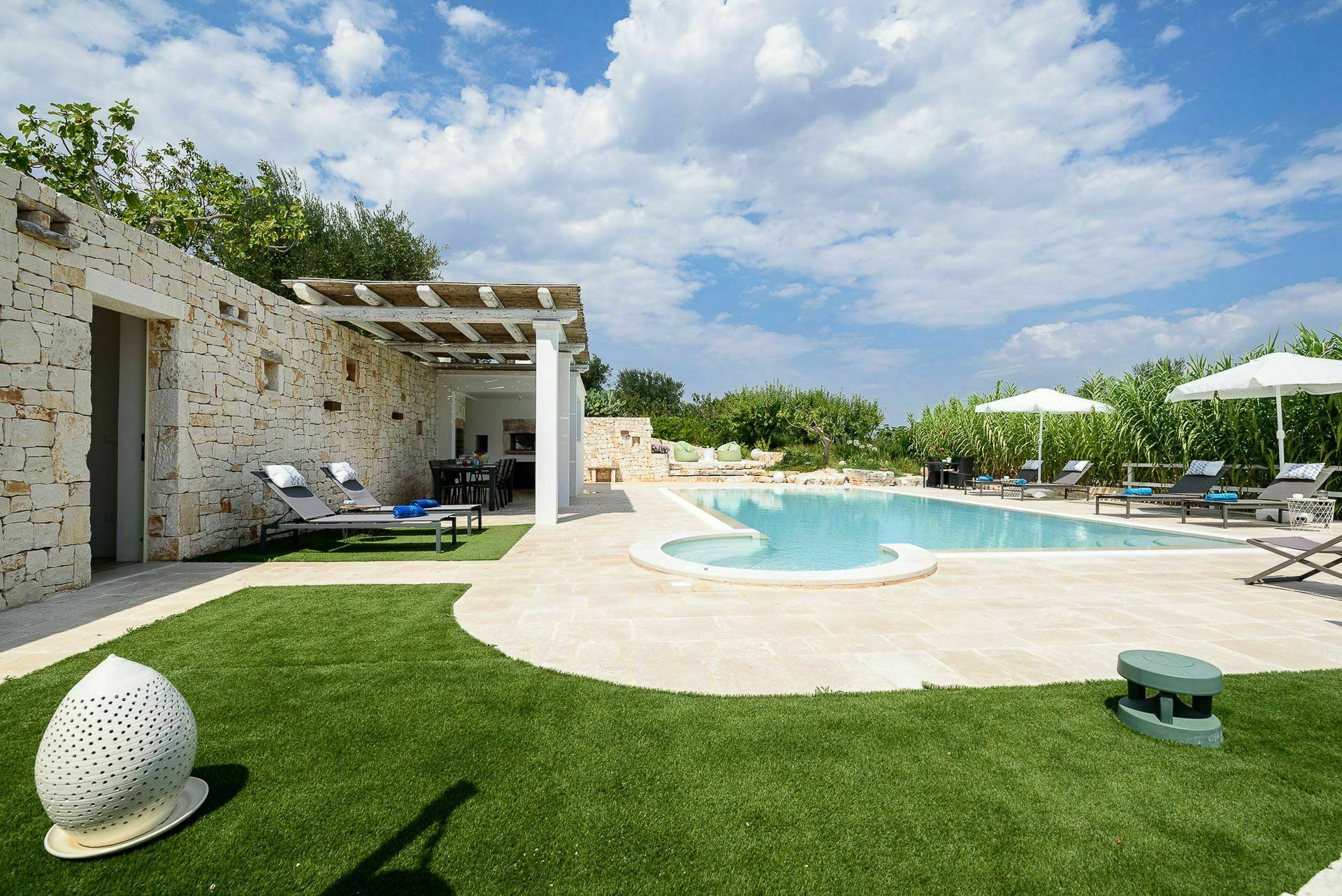 En stor, velstelt hage omgir eiendommen. Bak feriehuset er det et spektakulært saltvannsbasseng flankert av en elegant grønn plen. Bassenget har romerske trapper for enkel tilgang, og et område med avslappende massasjestråler. Her er det perfekt å nyte solen og freden på det apuliske landskapet fra solsengene ved bassenget.