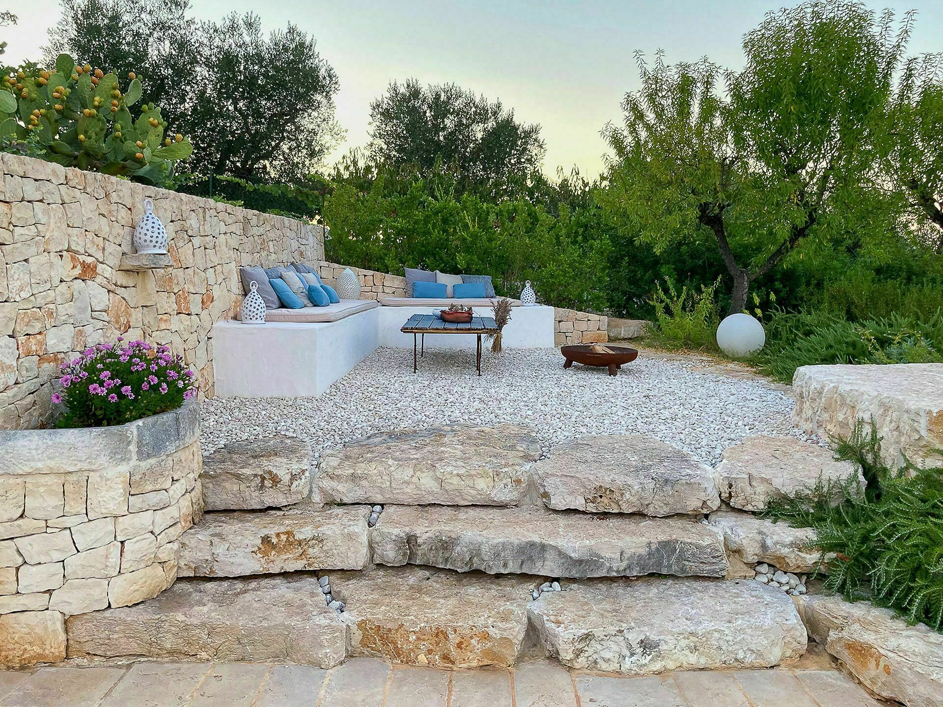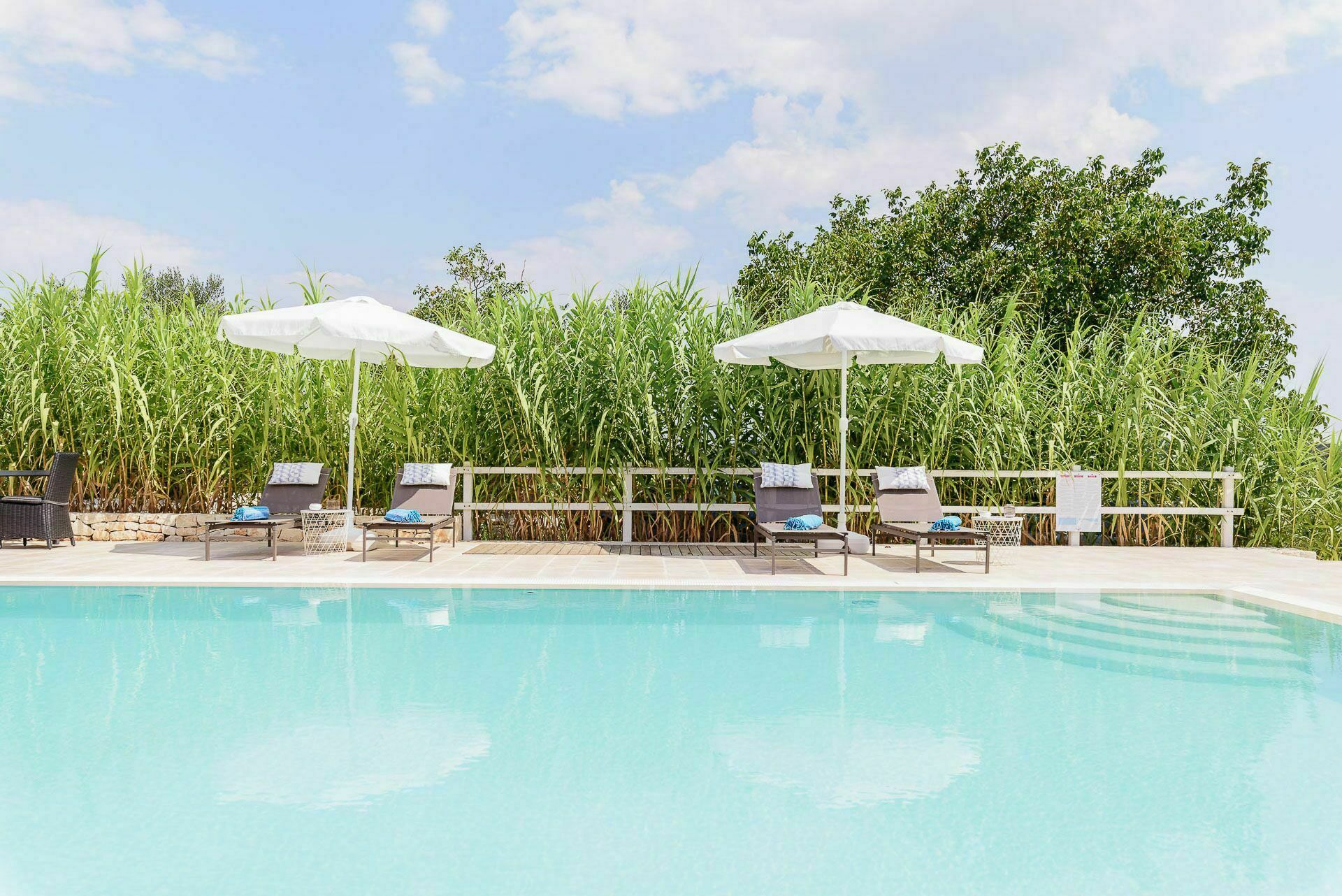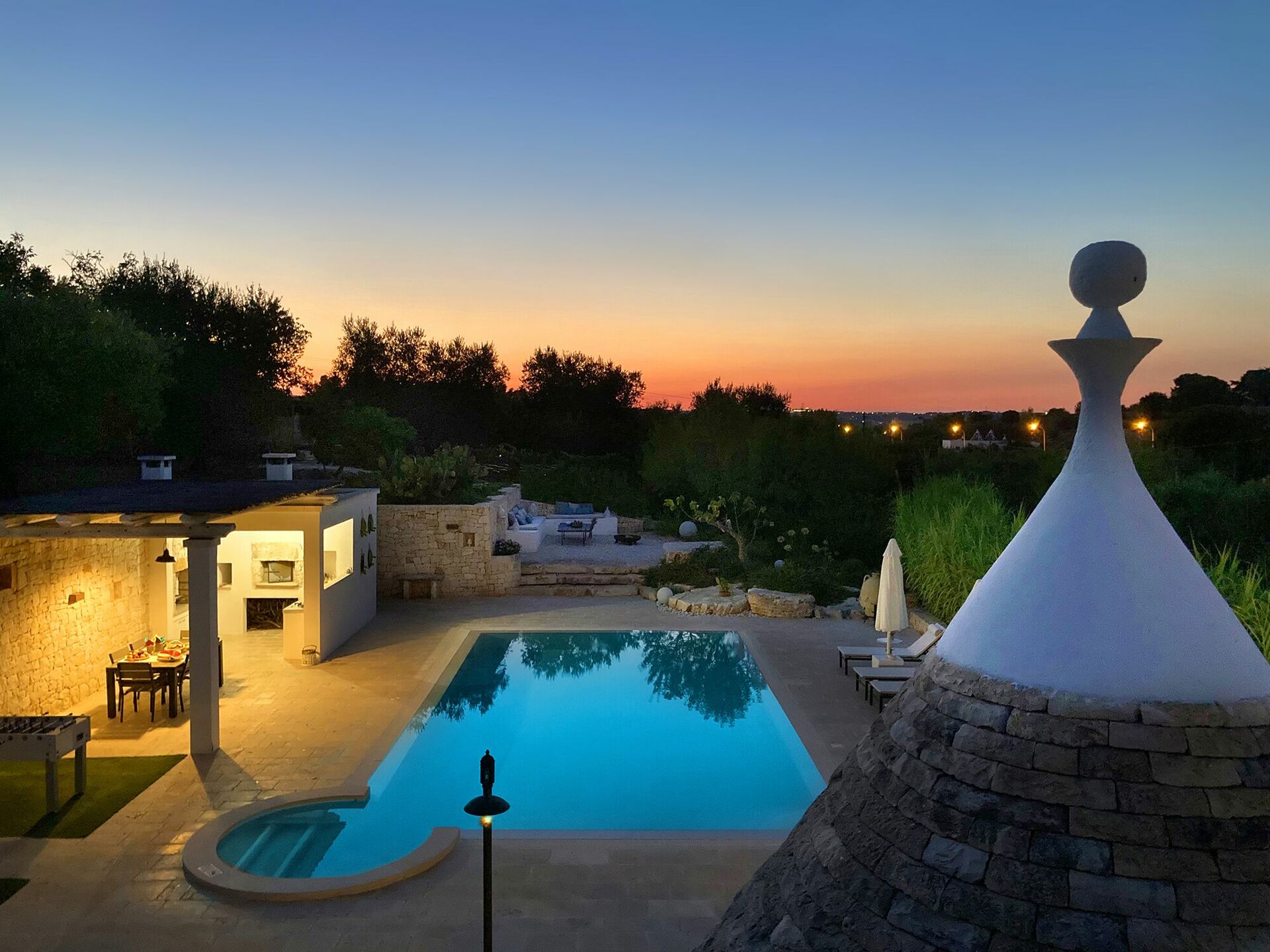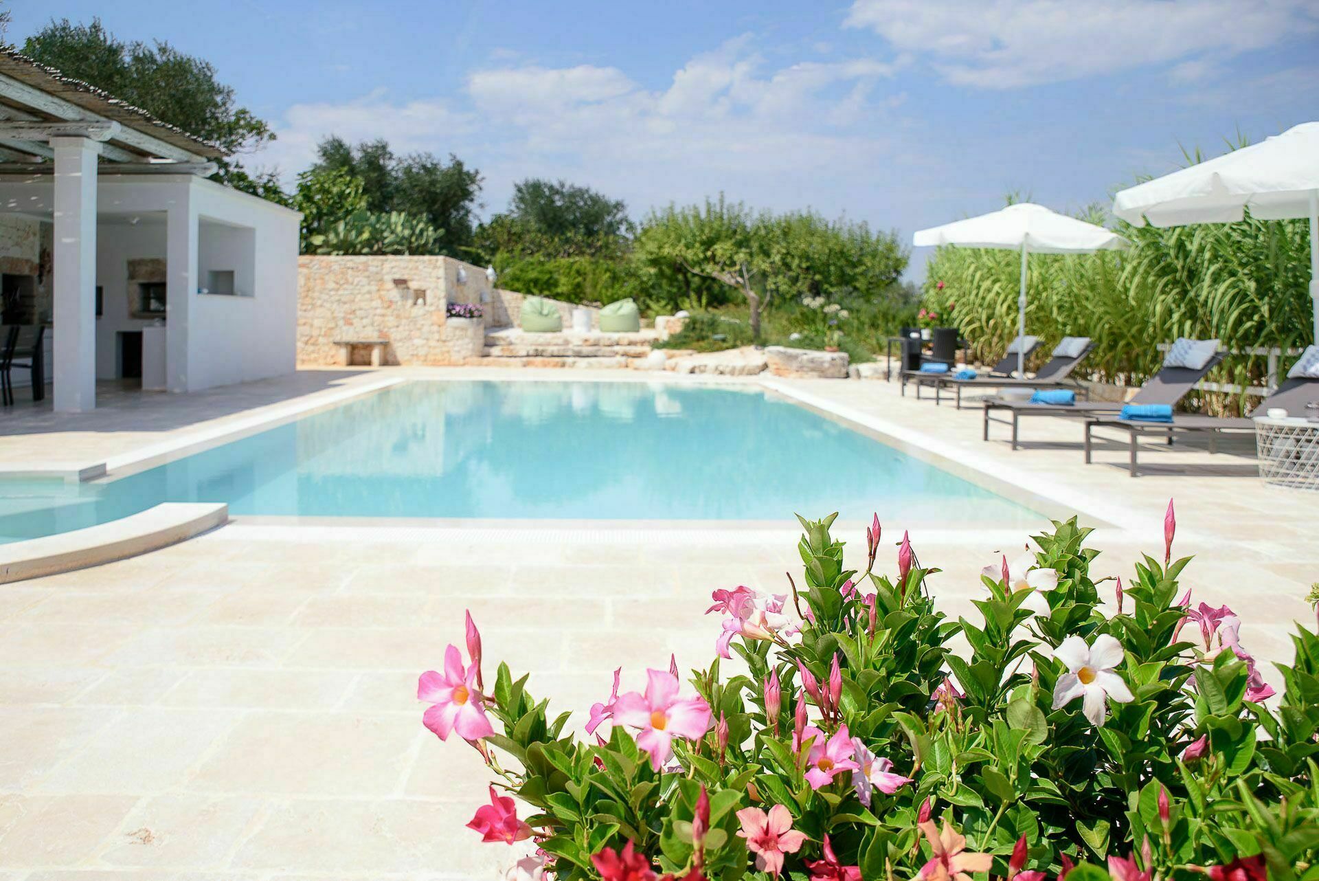 En stor, velstelt hage omgir eiendommen. Bak feriehuset er det et spektakulært saltvannsbasseng flankert av en elegant grønn plen. Bassenget har romerske trapper for enkel tilgang, og et område med avslappende massasjestråler. Her er det perfekt å nyte solen og freden på det apuliske landskapet fra solsengene ved bassenget.