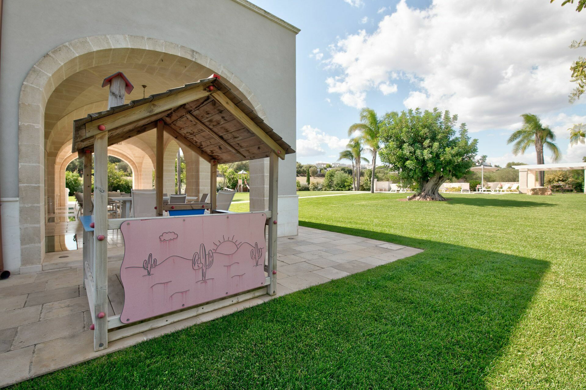 Ved bassenget er det en moderne paviljong med spisebord. En romslig veranda med utsikt over bassenget, en annen spiseplass og et område hvor man kan slappe av strekker seg langs siden av hele villaen. Utendørs er det også en liten lekeplass for barn nær bassenget.