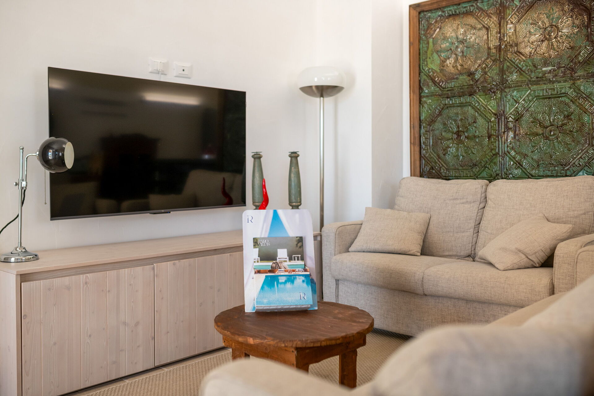 Bakkeplan: stue (TV) med spiseplass og kjøkkenkrok (kokeplater, oppvaskmaskin, mikrobølgeovn, kjøleskap, fryser, ovn, brødrister, espressomaskin) og tilgang til verandaen, WC; vaskerom (tørketrommel, vaskemaskin); dobbeltrom (sengestørrelse: 200 x 200 cm; myggnett) med privat bad med dusj, dobbeltrom (sengestørrelse: 200 x 200 cm; myggnett) med privat bad med dusj. Gjennom det siste rommet når man et annet dobbeltrom (sengestørrelse: 160 x 190 cm; myggnett) med privat bad med dusj. Fra hvert av de 3 rommene er det direkte utgang til utsiden. Klimaanlegg i alle rom.
