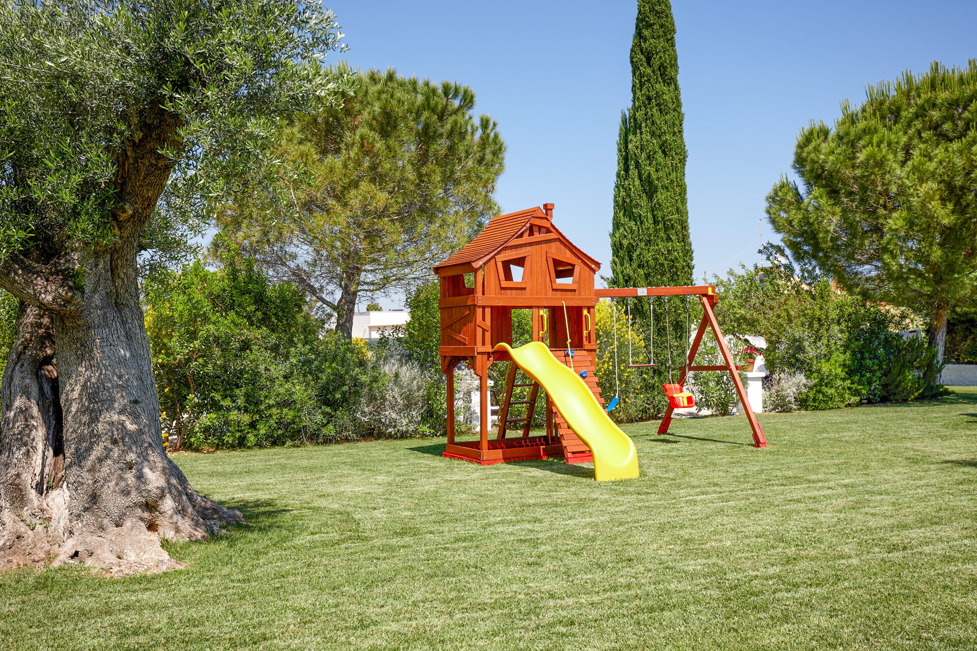 Eiendommen har en stor hage med flere områder for avslapning og sosialt samvær. Utekjøkkenet har vedfyrt ovn, og det er en stor pergola, en vakker veranda, en panoramaterrasse i første etasje, et lekeområde for barn, to svømmebassenger og et utendørs boblebad.