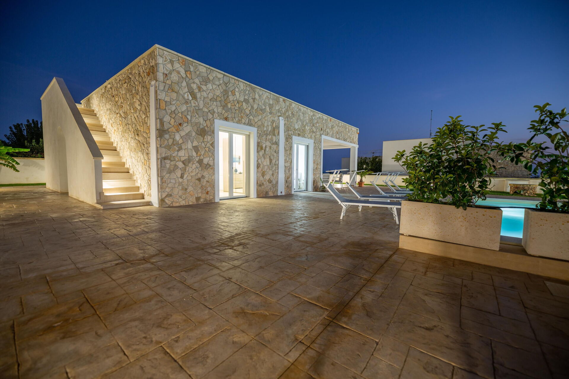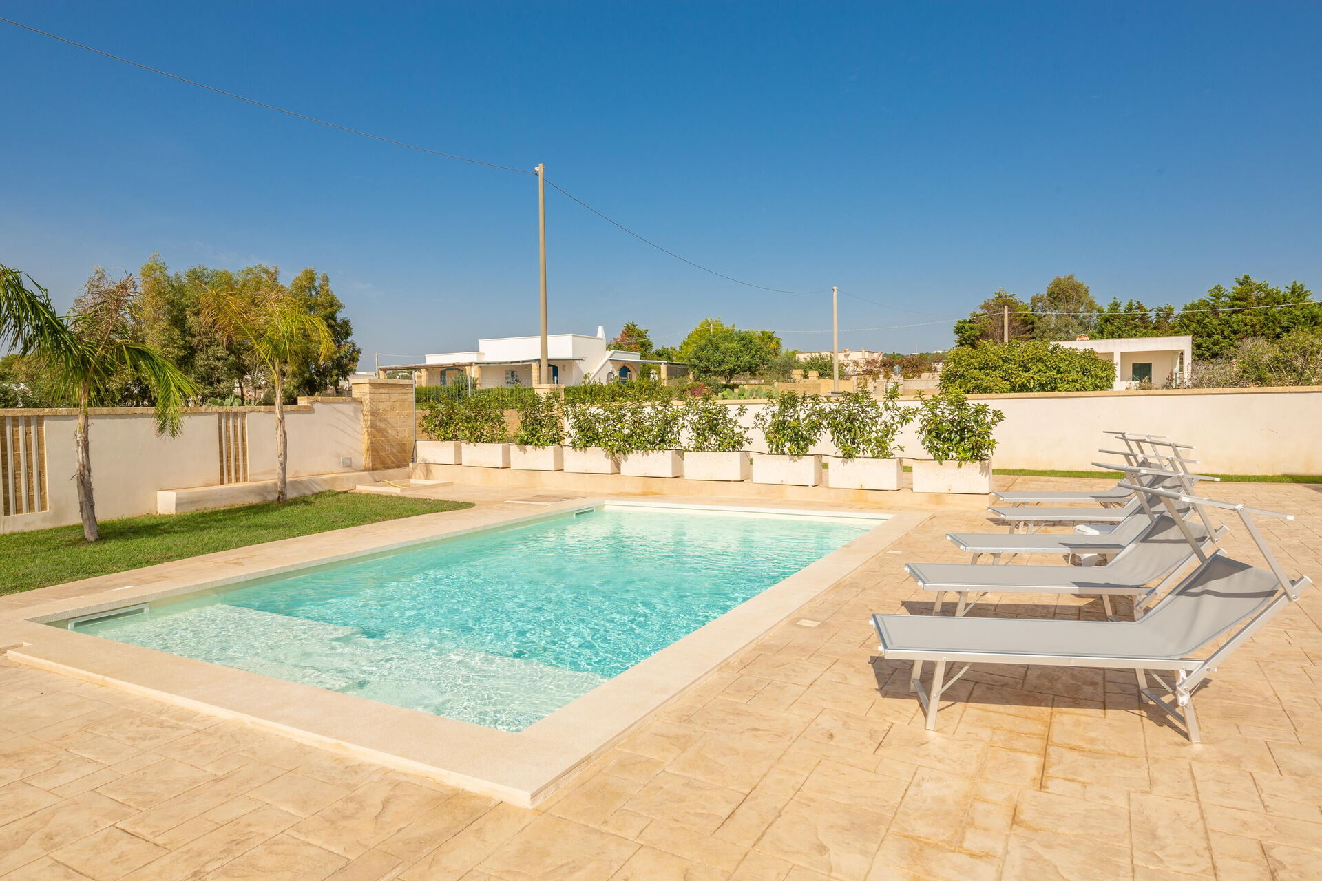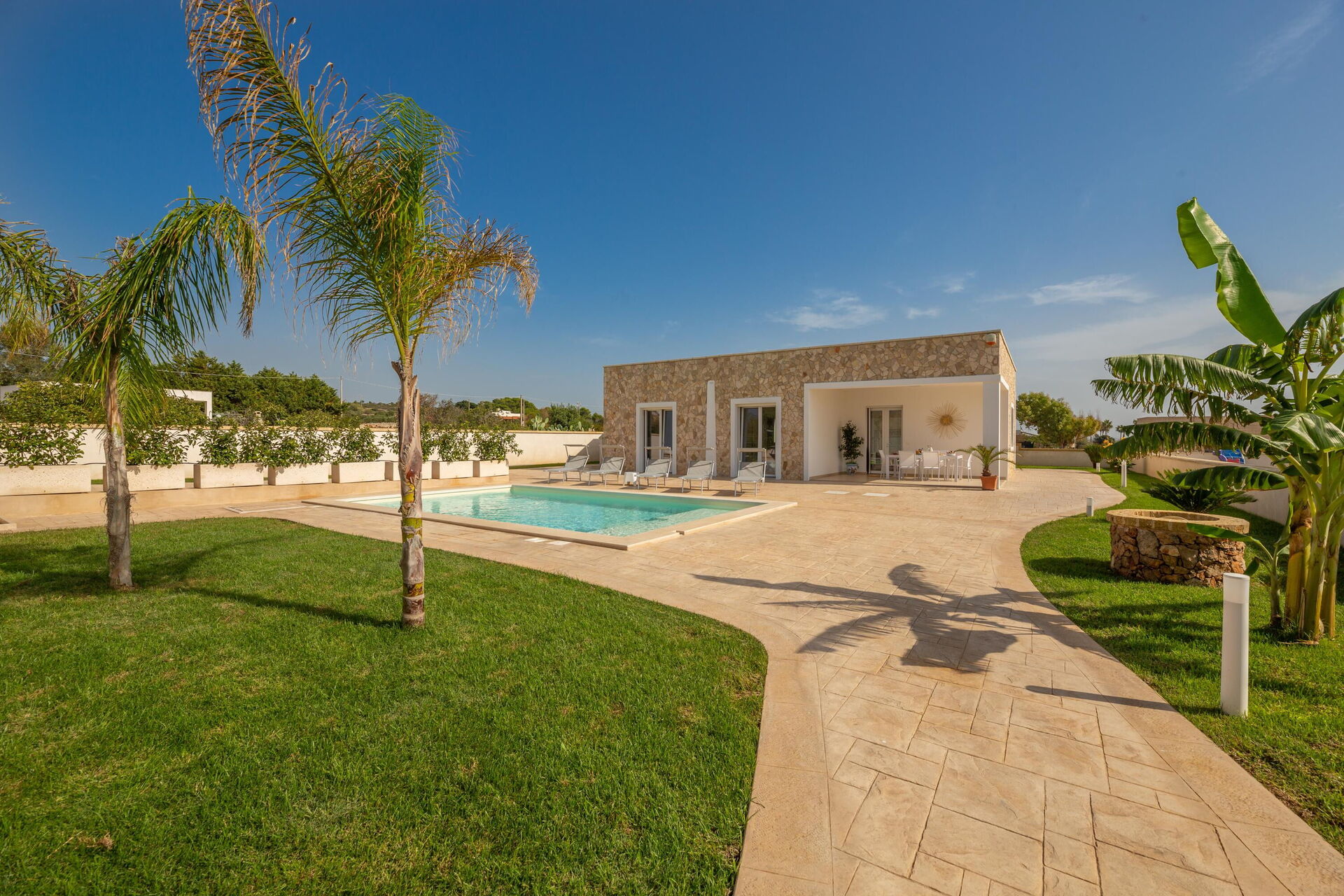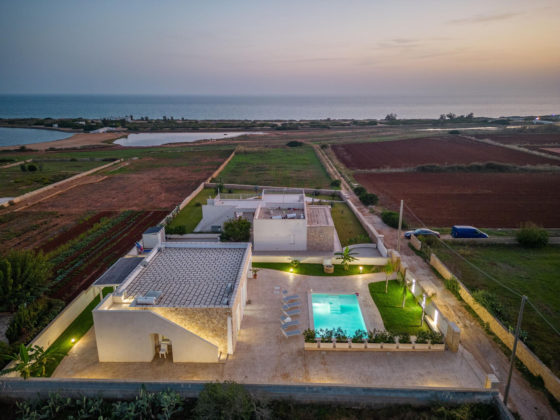 Avstander: Sjøen ligger 300 meter fra huset, Torre Pali (alle slags butikker) 1,5 km, Marina di Pescoluse ("Maldivene i Salento") 5 km, Torre Vado 6 km, Torre San Giovanni (sandstrand) 12 km, Baia dei Diavoli (klipper) 16 km, Santa Maria di Leuca 19 km, Gallipoli 38 km, Otranto 56 km, Lecce 75 km