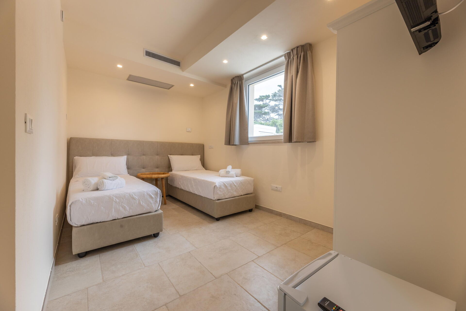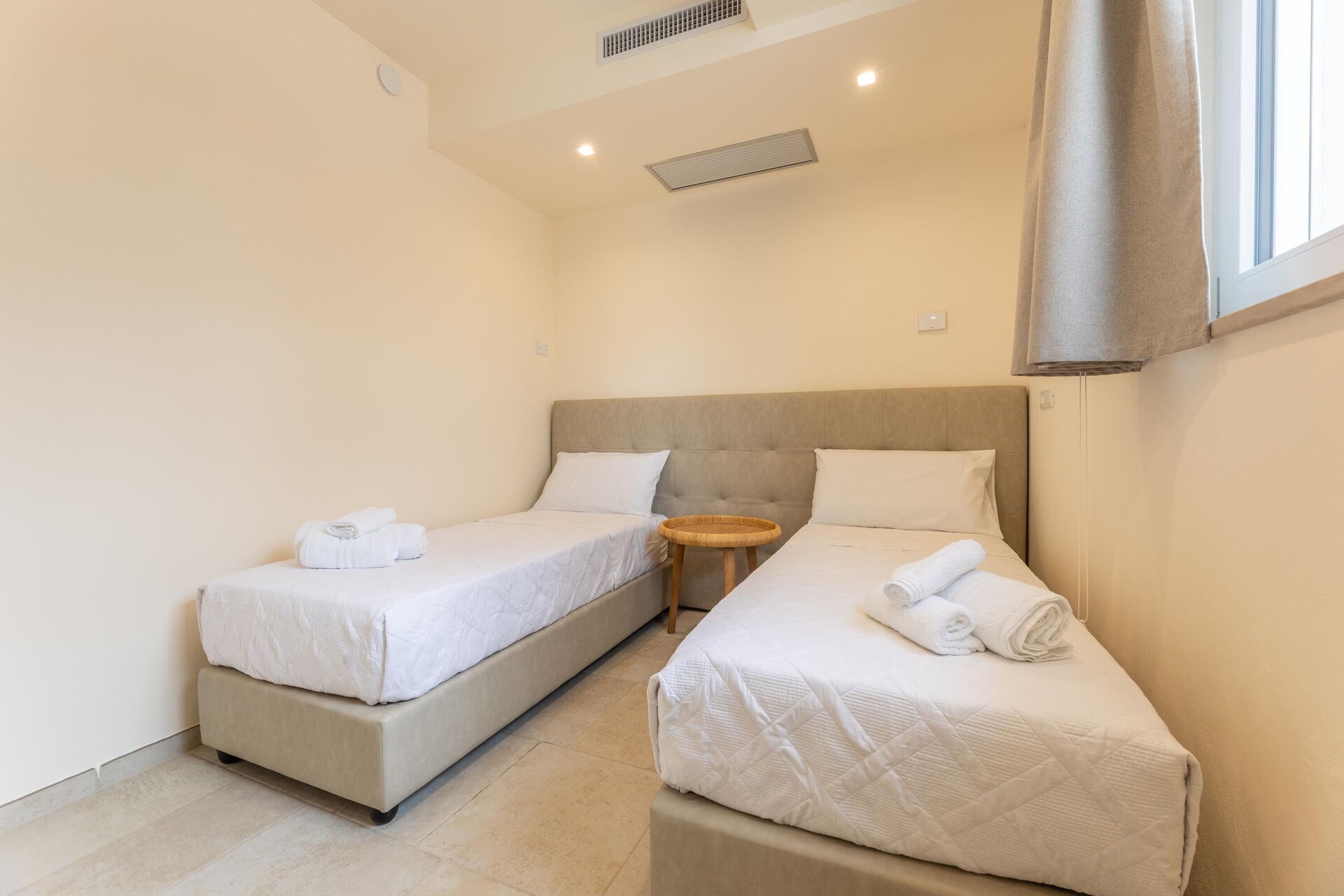 Første etasje: dobbeltrom (aircondition), bad med dusj, soverom med 2 enkeltsenger (aircondition).