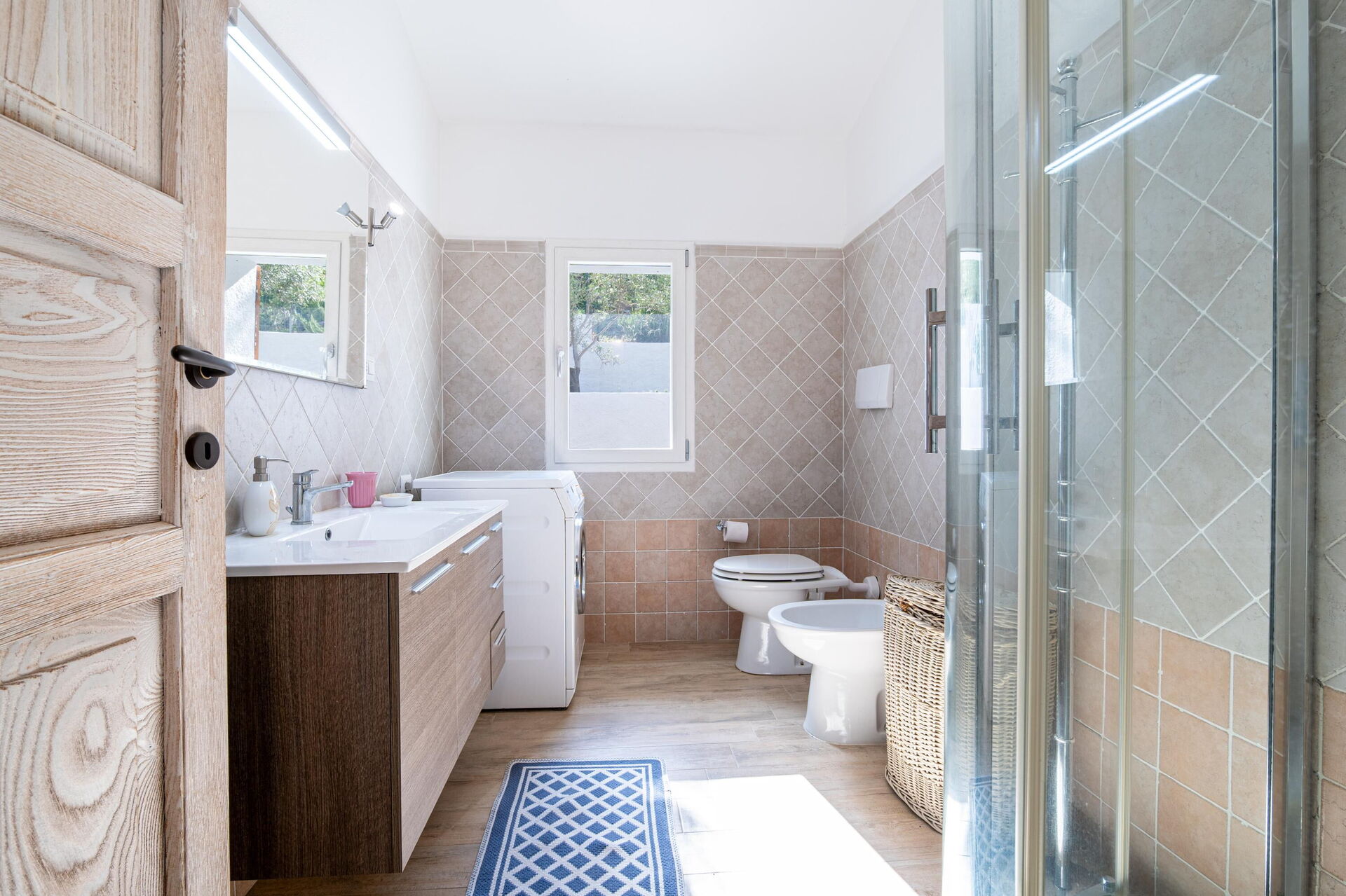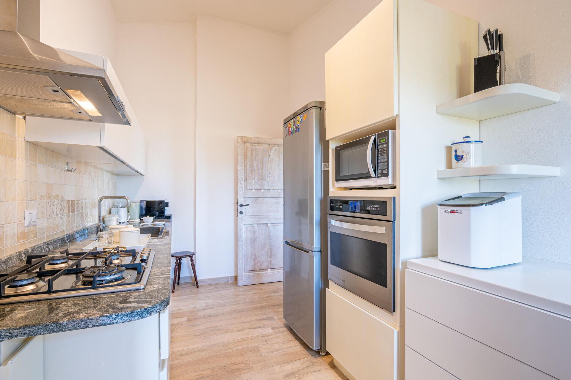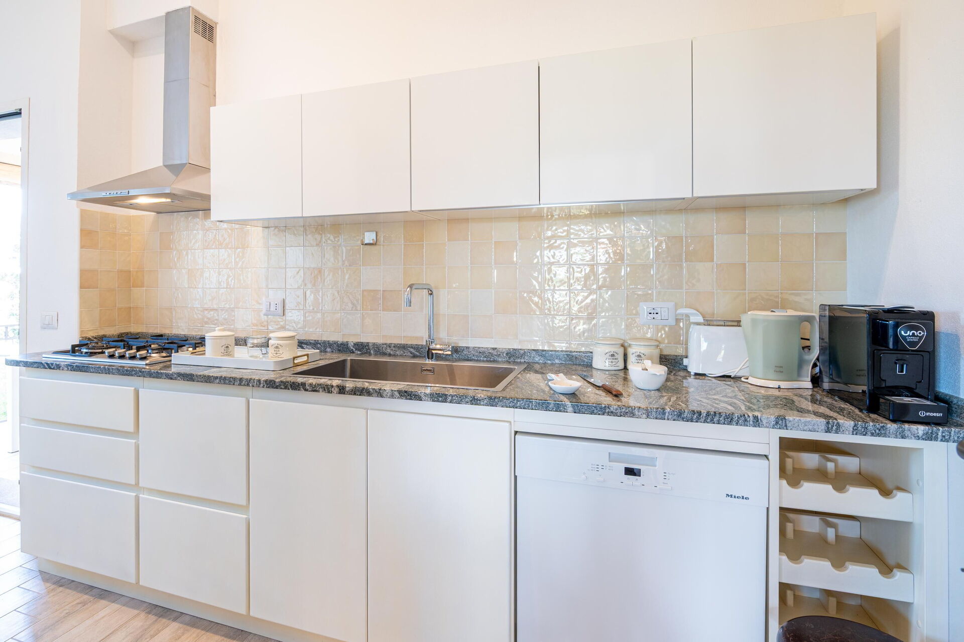 Første etasje: lys stue (satellitt-TV) med spiseplass, kjøkken (koketopp, stekeovn, kjøleskap, fryser, oppvaskmaskin, mikrobølgeovn, espressomaskin) med utgang til terrasse med utendørs spiseplass og panoramautsikt over havet; dobbeltrom, dobbeltrom (sengen kan deles i 2 enkeltsenger på forespørsel), bad med dusj, soverom med fransk seng (140 cm x 190 cm), bad med dusj og vaskemaskin.