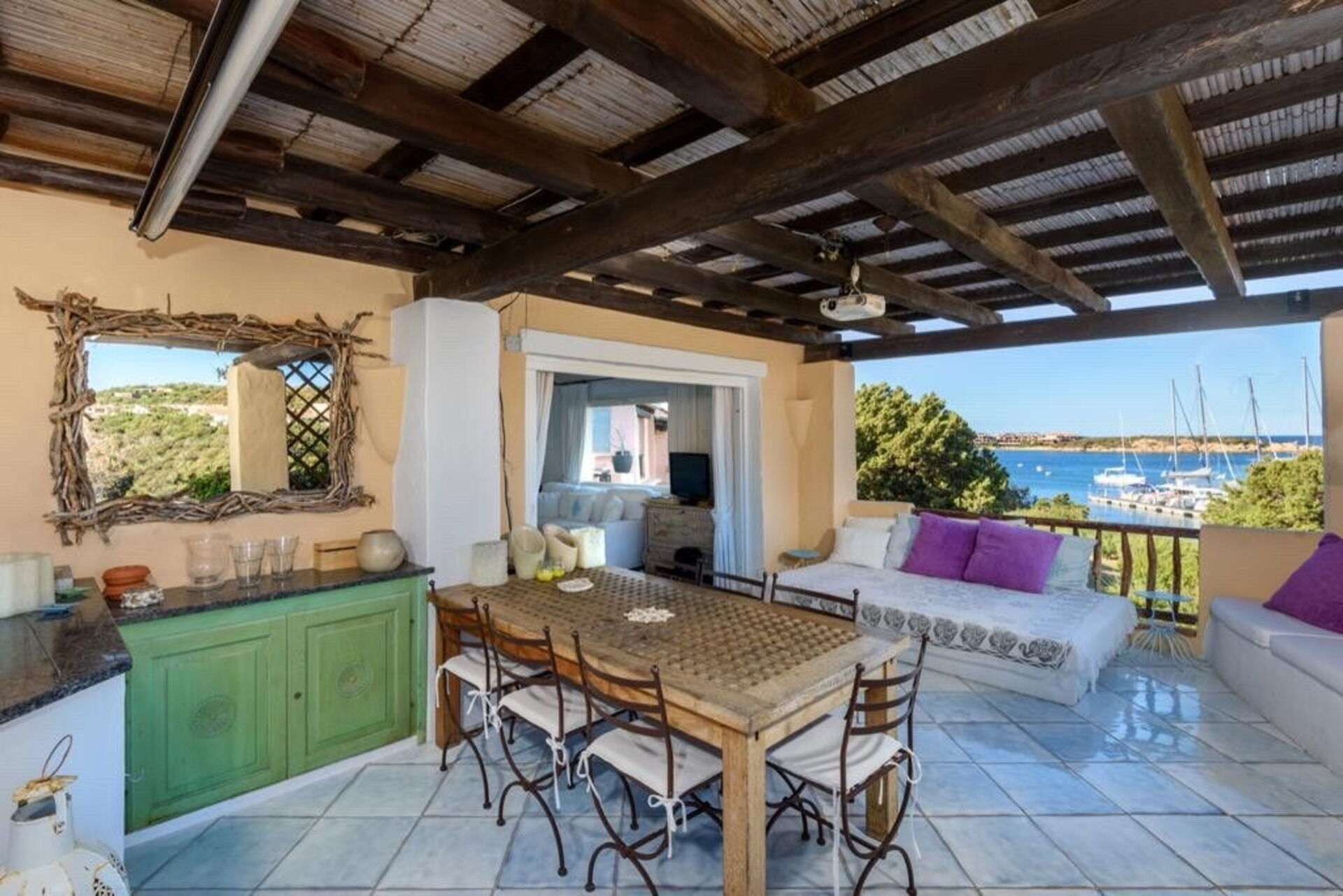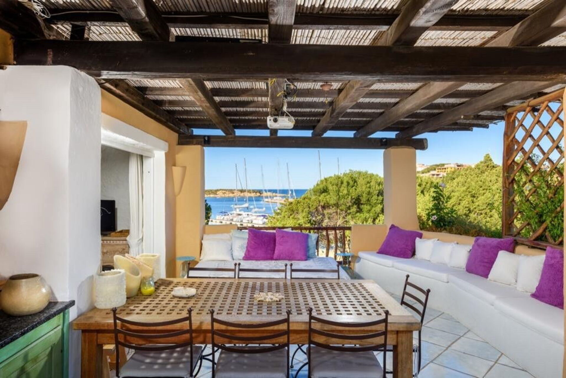 Det er en overbygd veranda med bord og stoler for uteservering, med utsikt over den vakre gamle piren i Porto Corvo-bukten.