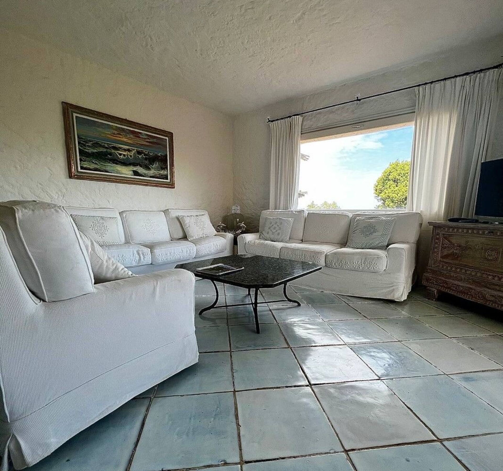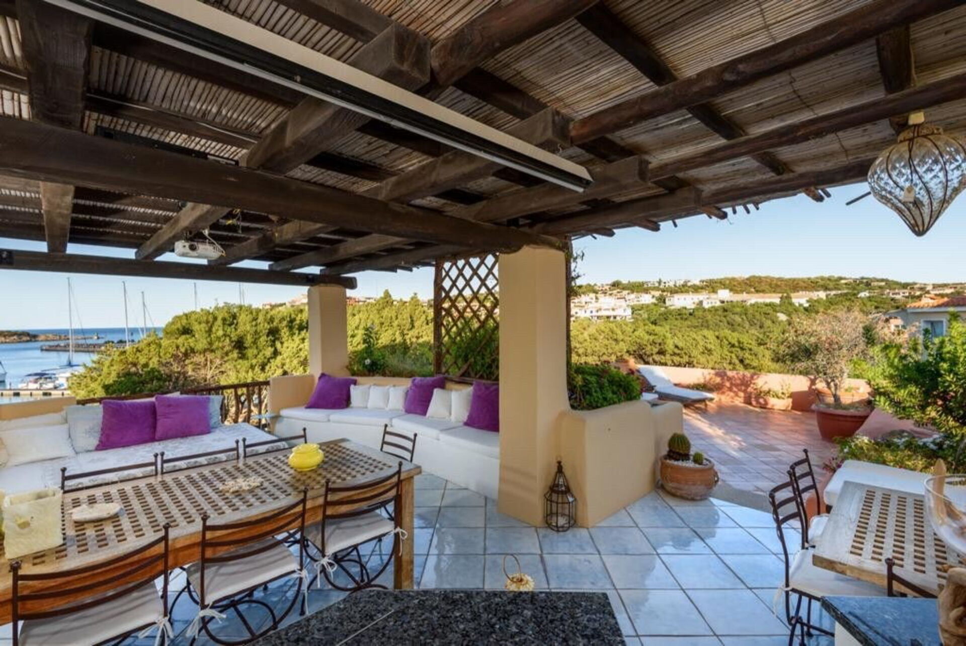 - Overbygd veranda med bord, sofaer, lenestoler og fantastisk havutsikt
