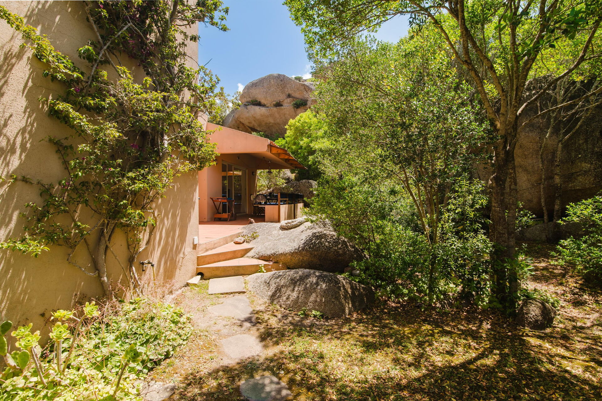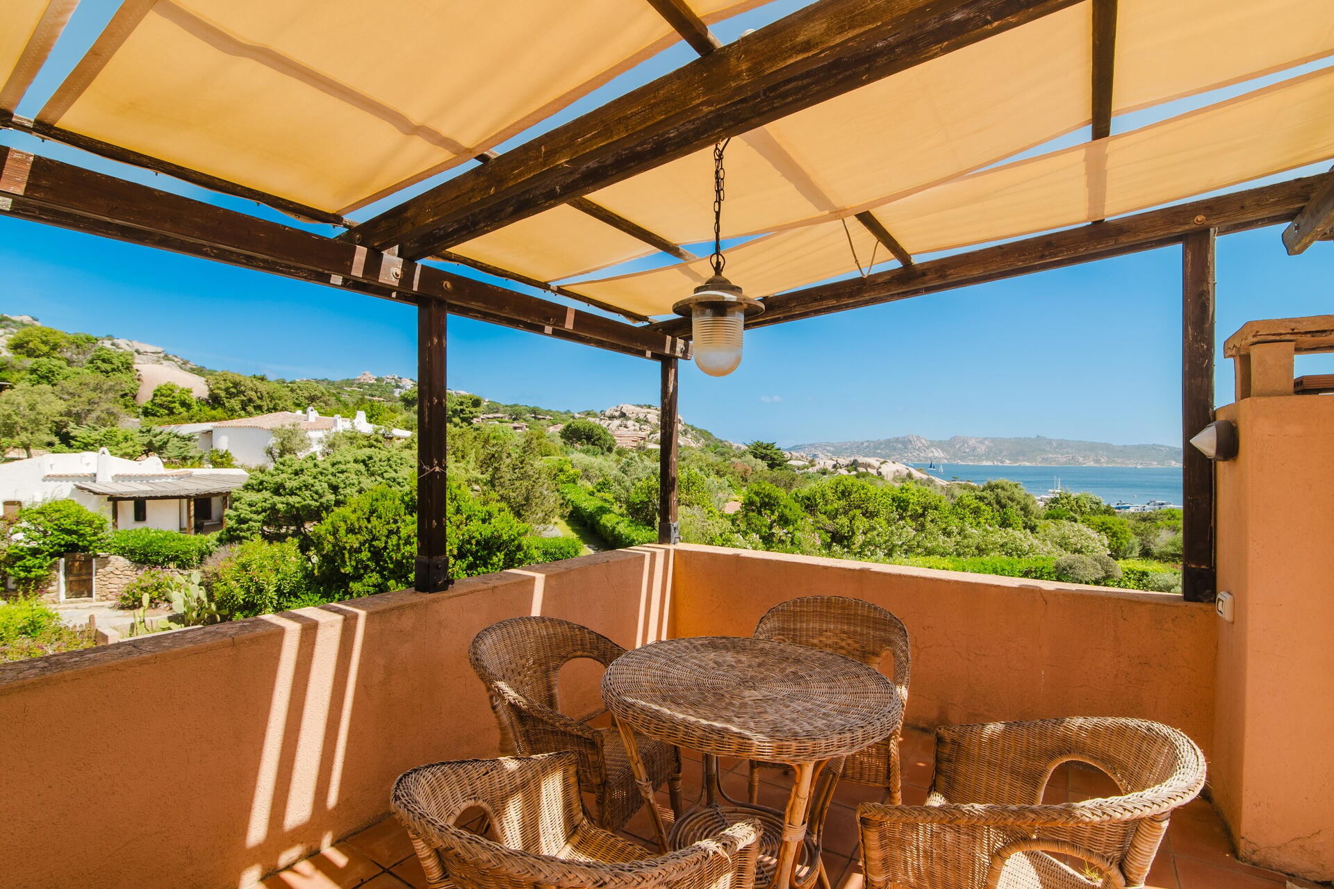 Uteområdene er prikken over i'en på denne eiendommen: nyt roen i den velstelte hagen, slapp av ved det private bassenget, og nyt måltider utendørs på verandaen. Her kan du beundre den spektakulære utsikten over landskapet rundt og havet.