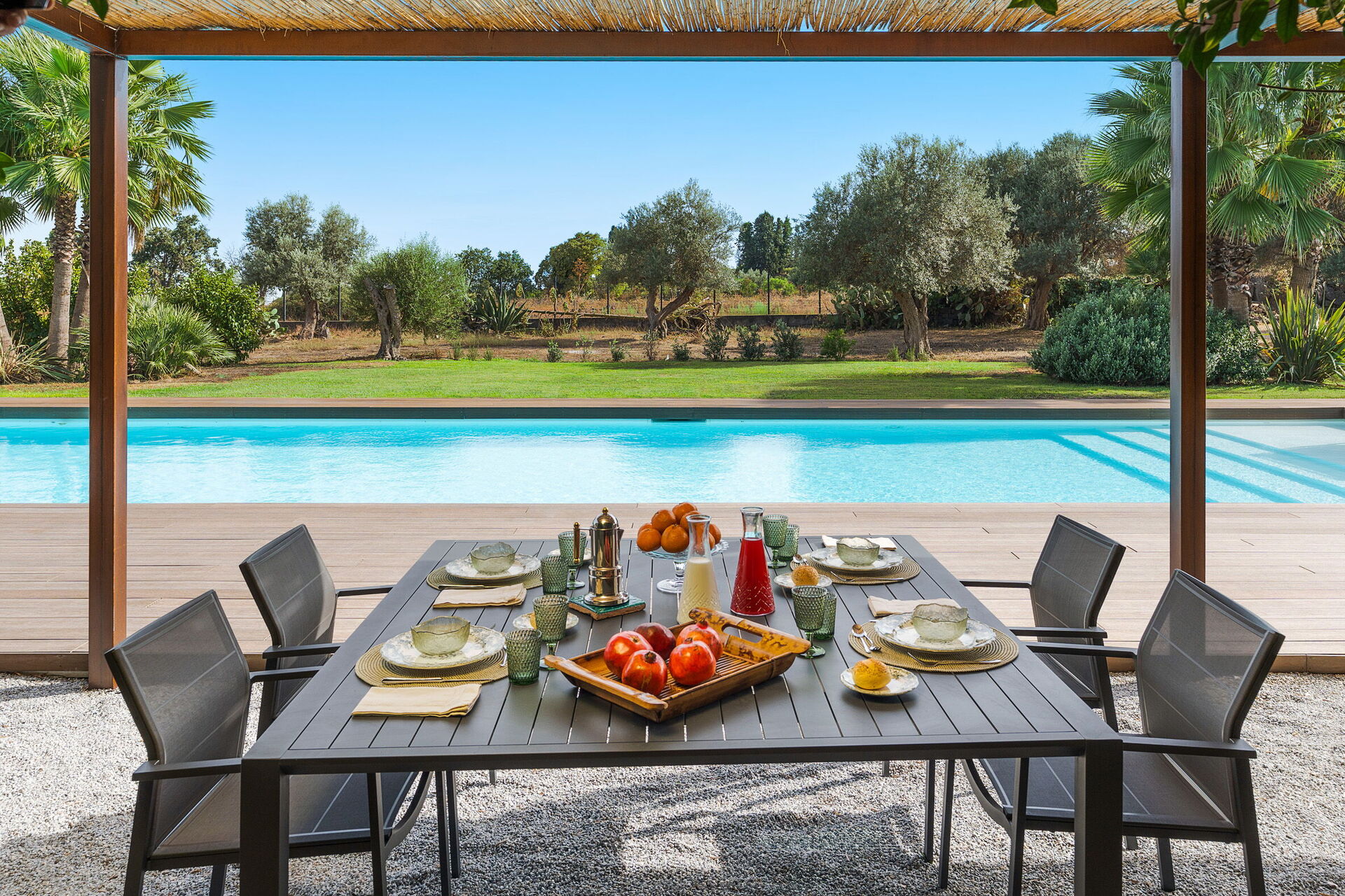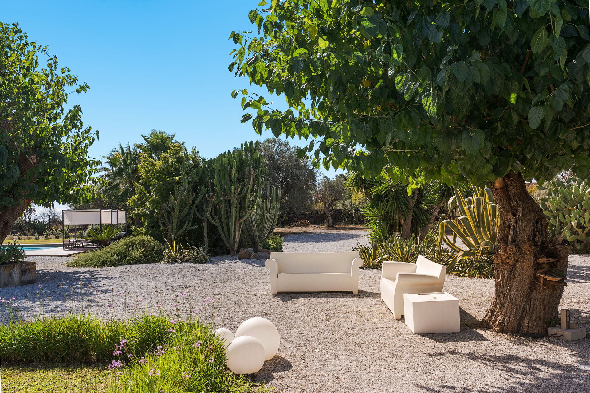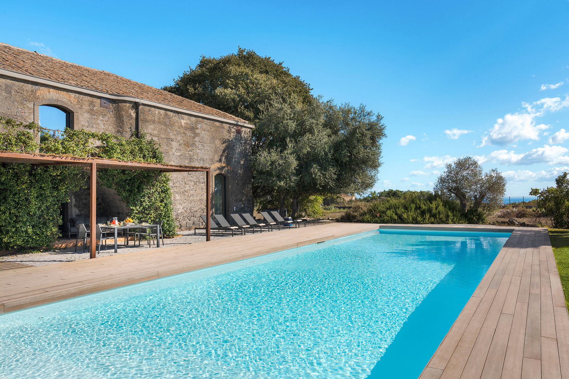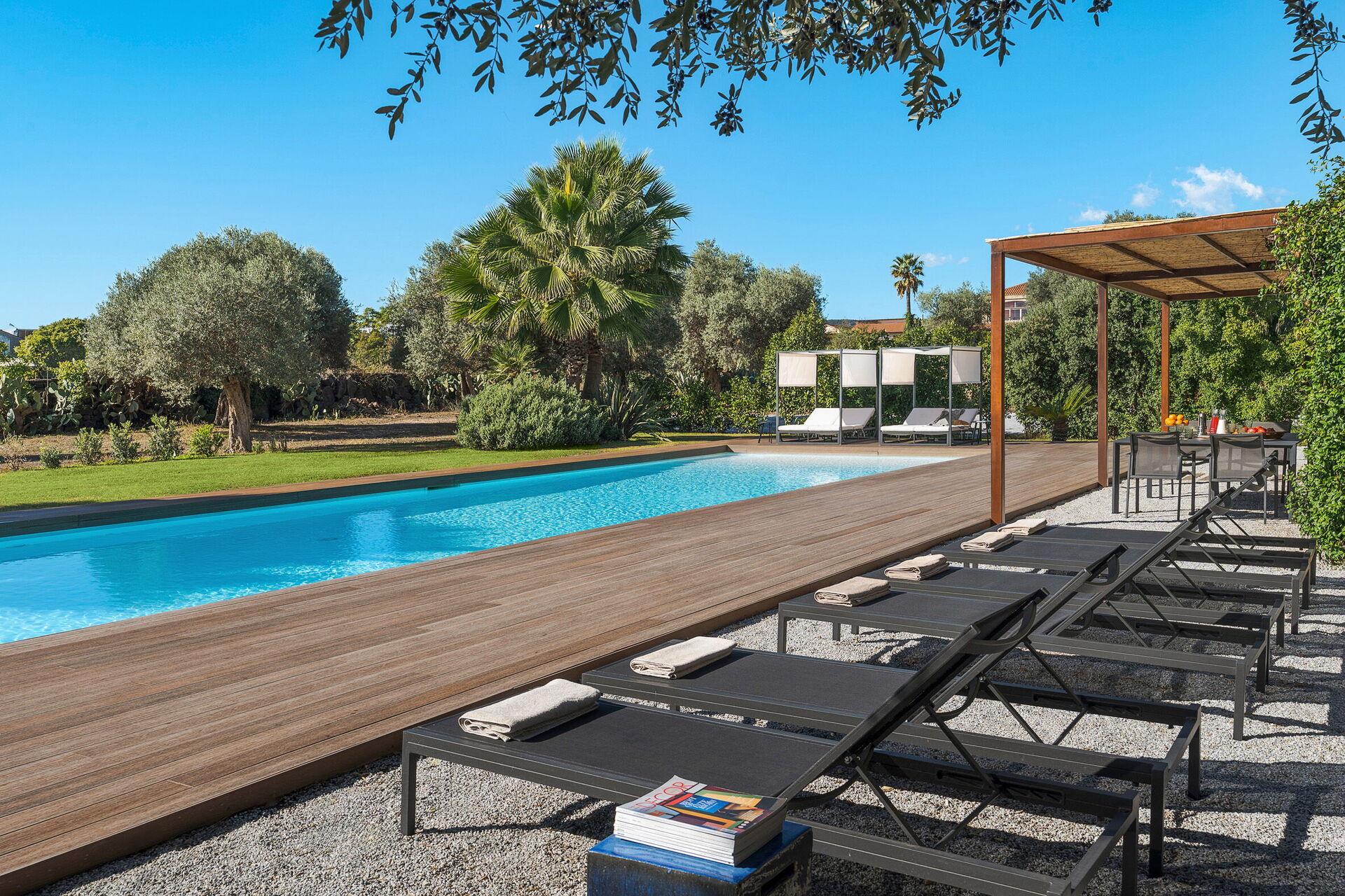 Utendørsområdet er pent opparbeidet: en nydelig hage med frodige sicilianske planter omgir et vakkert, stort privat saltvannsbasseng. Ved bassenget finnes solsenger og parasoller, hvor du kan slappe av under solen på Sicilia.