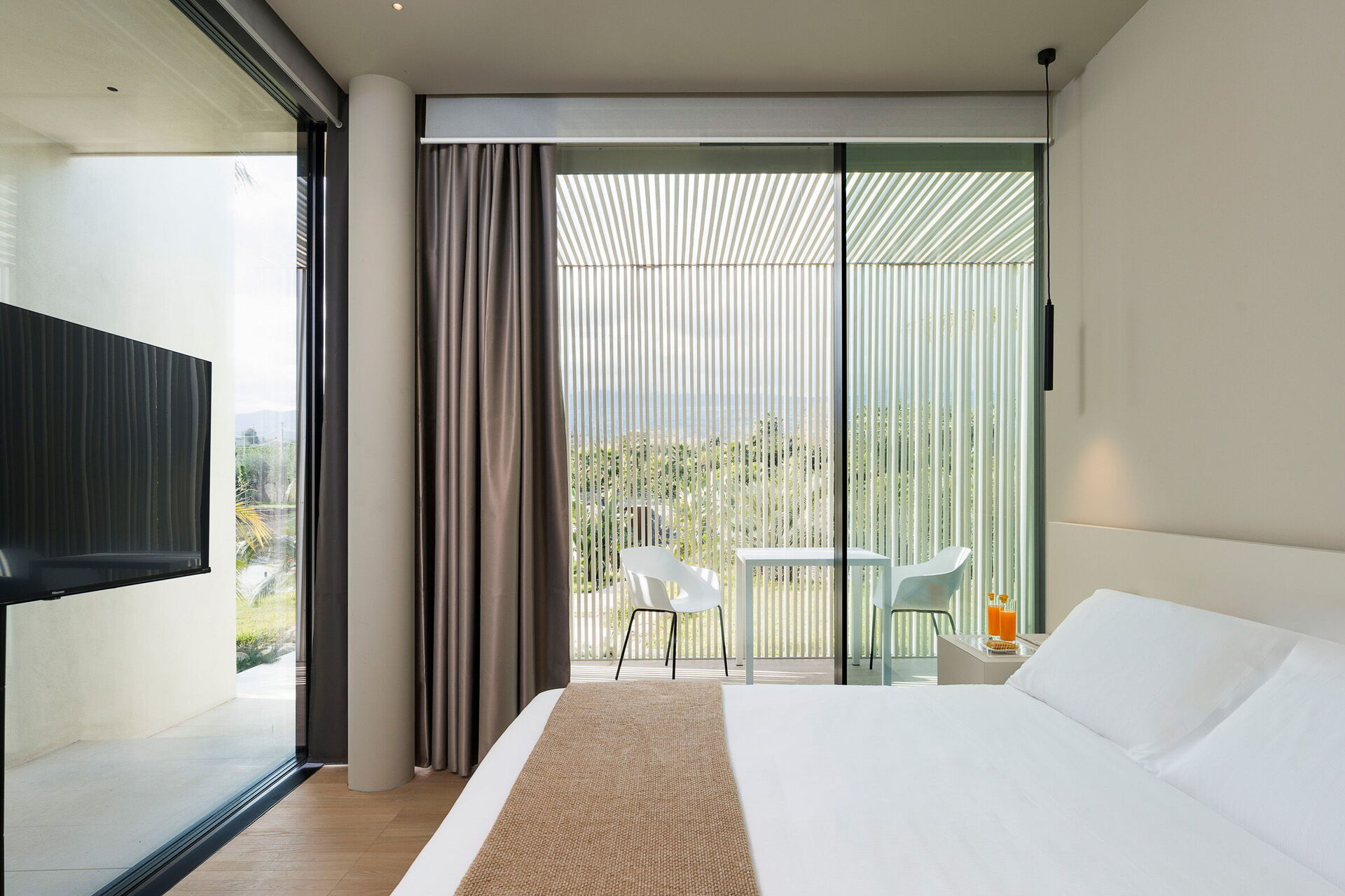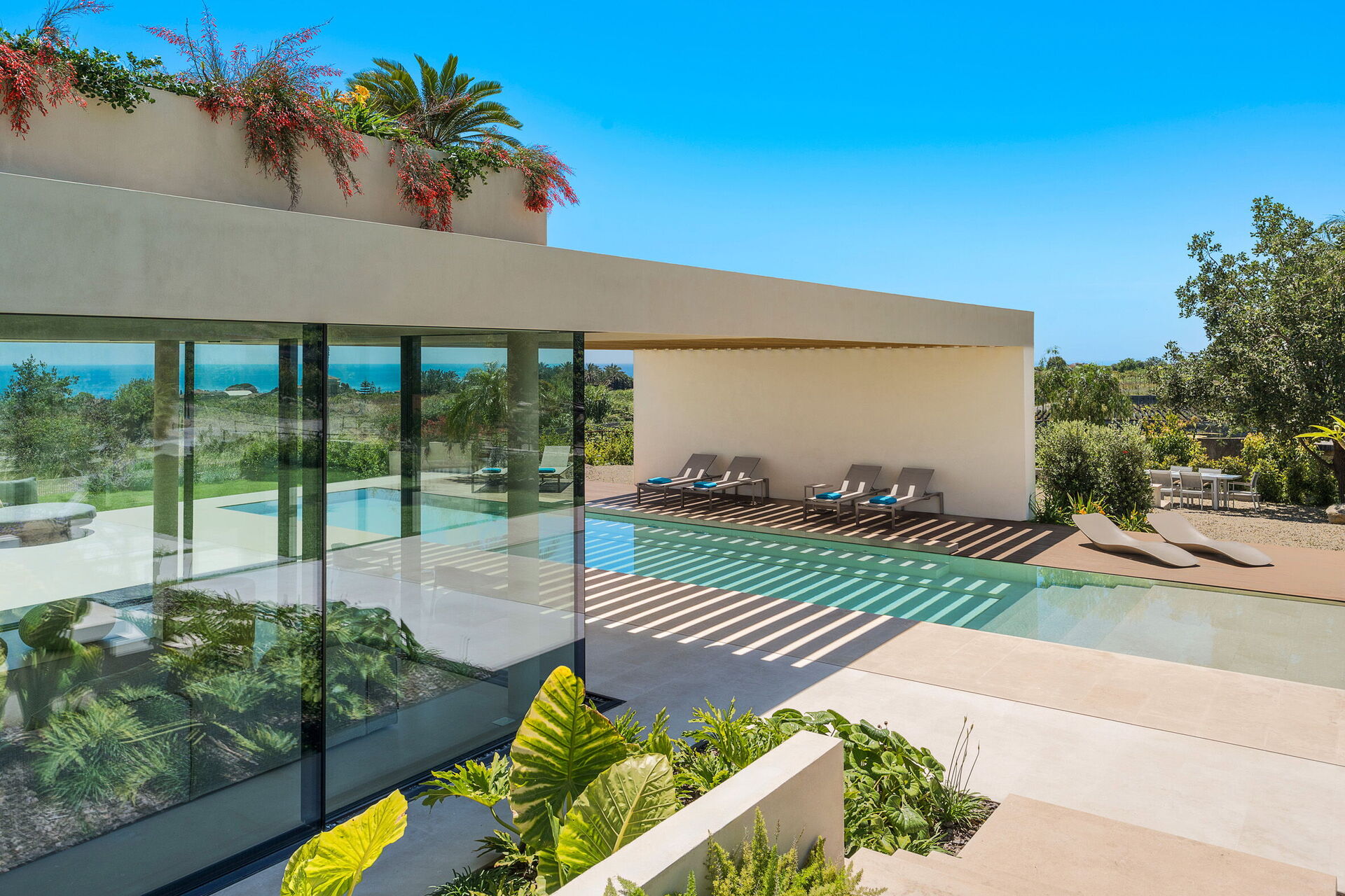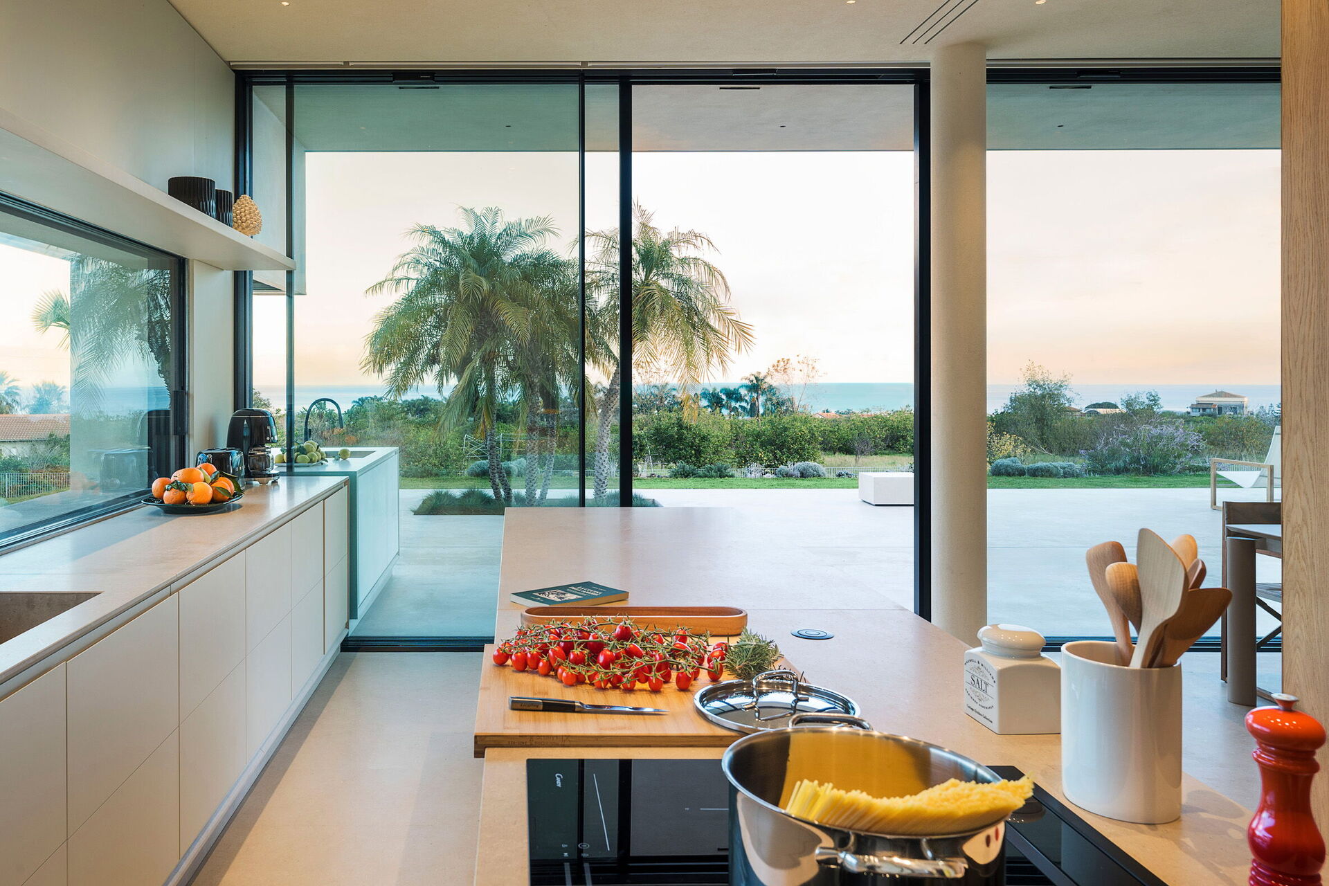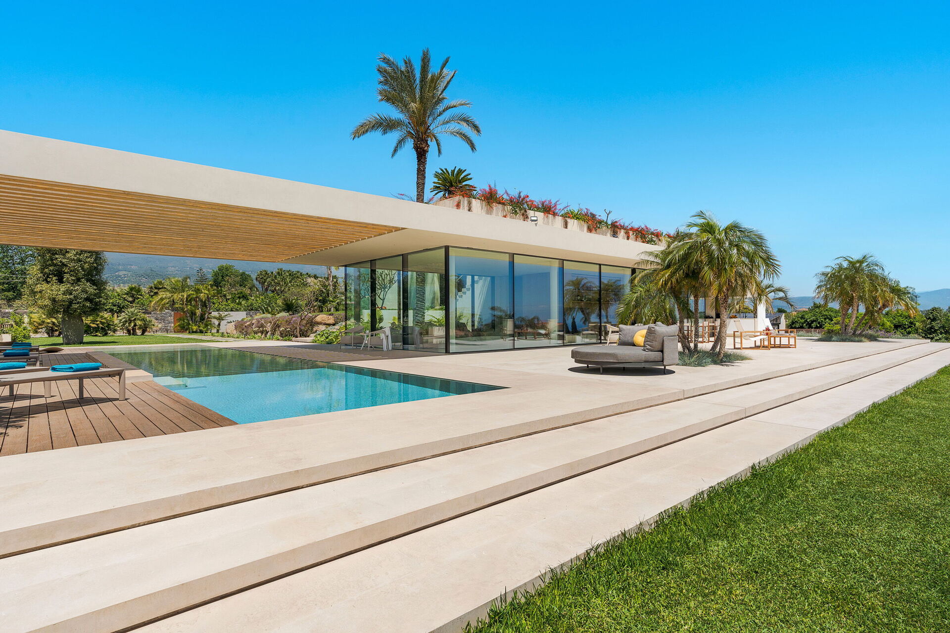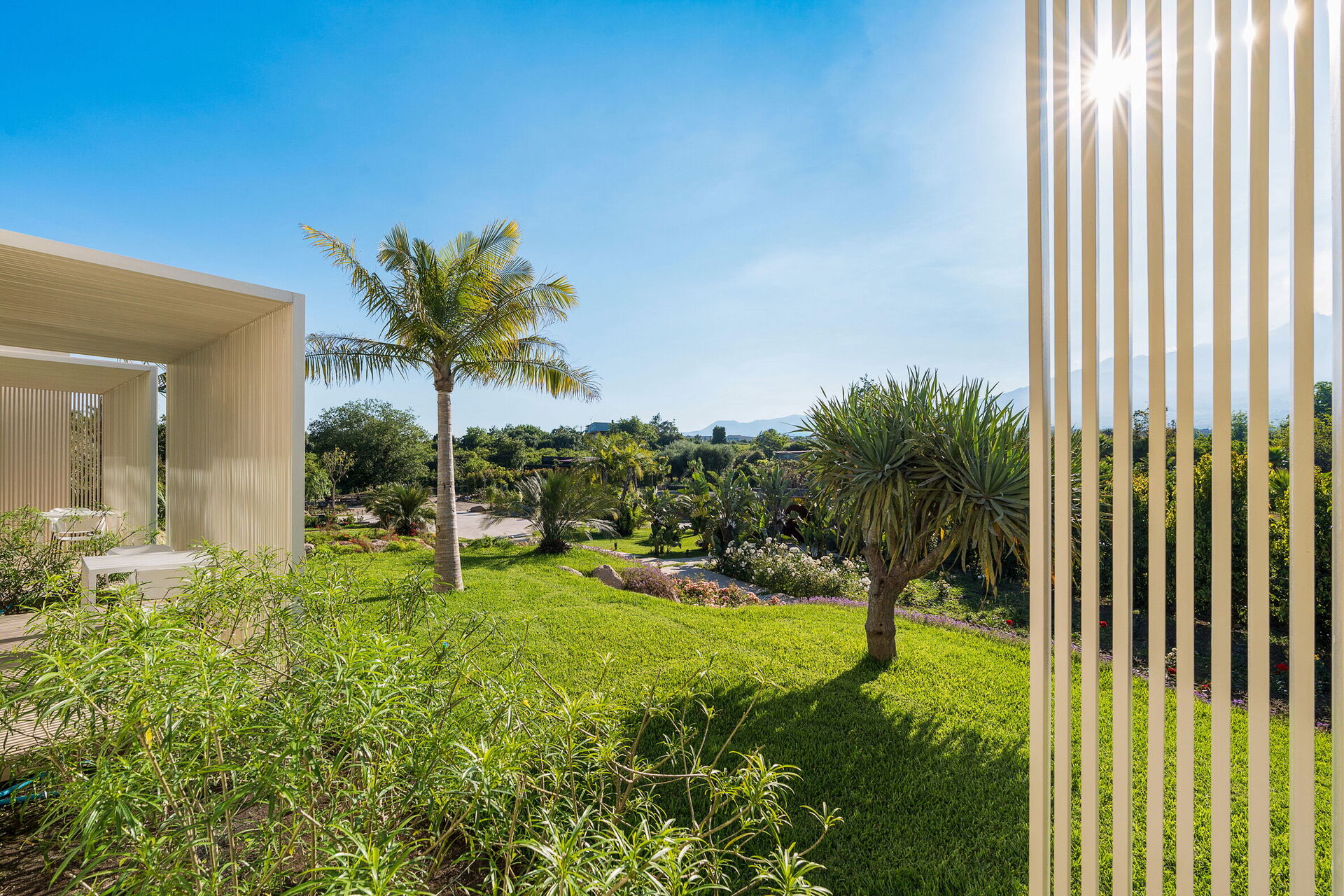 Huet er både moderne og luksuriøst, og ligger i naturskjønne omgivelser med en enestående panoramautsikt som strekker seg fra Etna til Taormina. Utsikten kan nytes fra bassenget, de store terrassene og hagen.