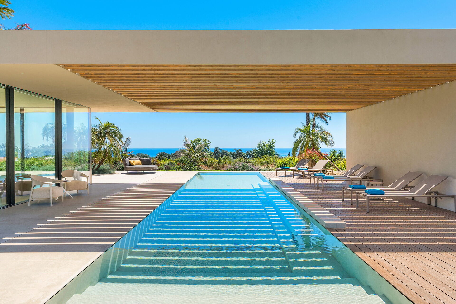 - privat saltvanns evighetsbasseng med boblebadområde (19 x 3,6 meter; minimum dybde: 0,20 meter; maksimum dybde: 1,40 meter); oppvarmet til 26°