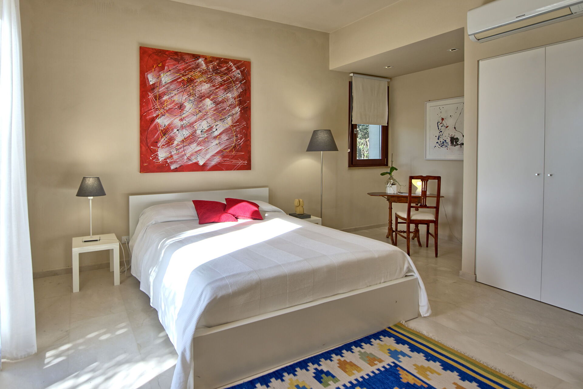 Stor og lys stue med utgang til utendørsområdet, satellitt-TV og dekorativ flygel (ikke i bruk), spisestue, kjøkken (oppvaskmaskin, stekeovn, induksjonstopp, kjøleskap, fryser, mikrobølgeovn, kaffemaskin), toalett, 2 dobbeltrom med egne bad med dusj og utgang til utendørsområdet, 1 dobbeltrom (kan omgjøres til to enkeltsenger etter forespørsel) med eget bad med dusj og utgang til utendørsområdet, 1 twin rom med eget bad med dusj og utgang til utendørsområdet.