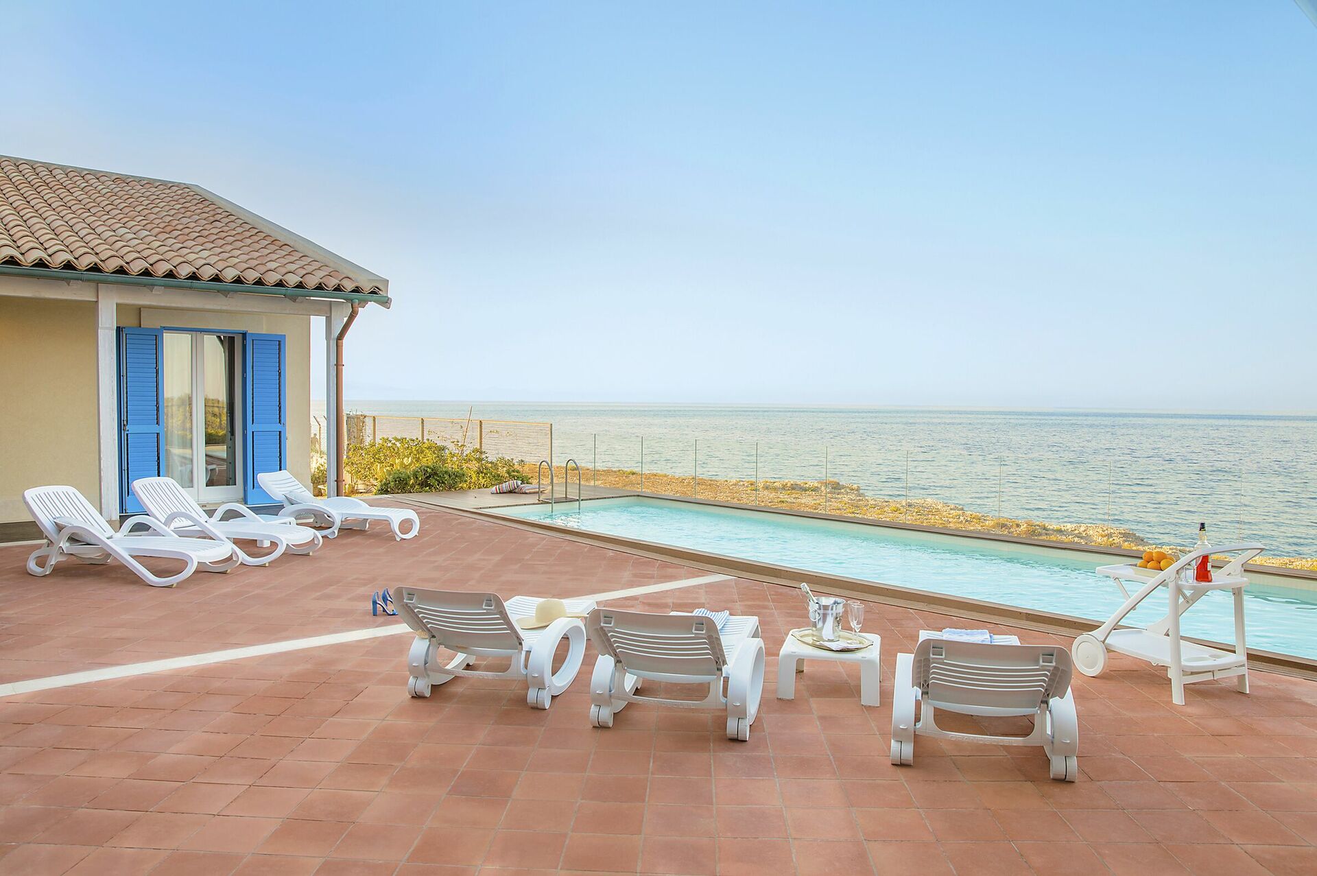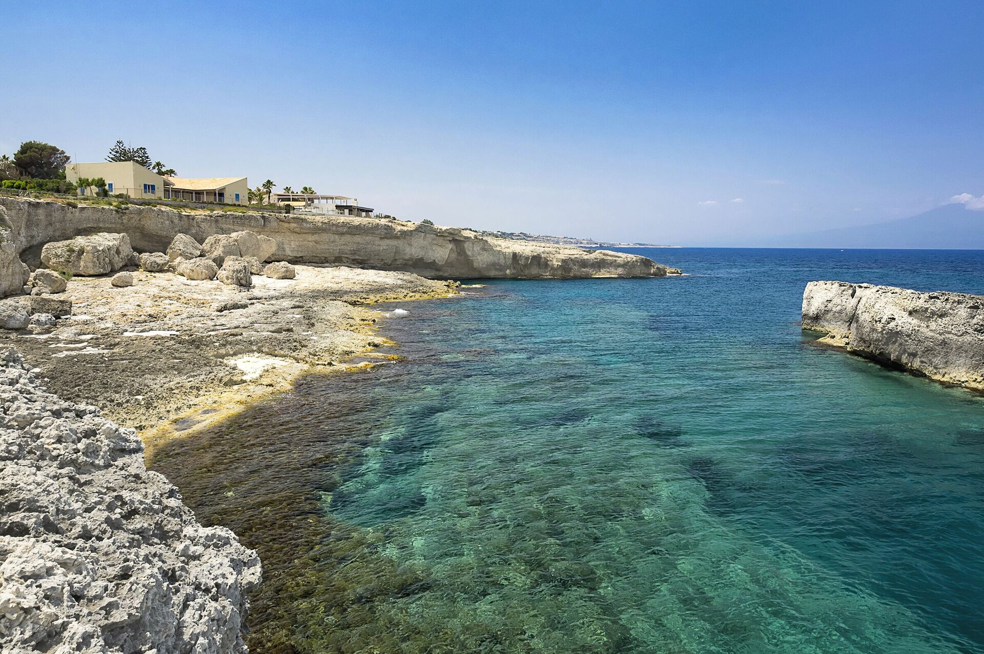 Pent feriehus på en klippe over havet nær Augusta på østkysten av Sicilia. Huset har en stor velutstyrt terrasse og en velstelte hage. Et perfekt sted en avslappende ferie hvor man kan nyter den avkjølende havbrisen.