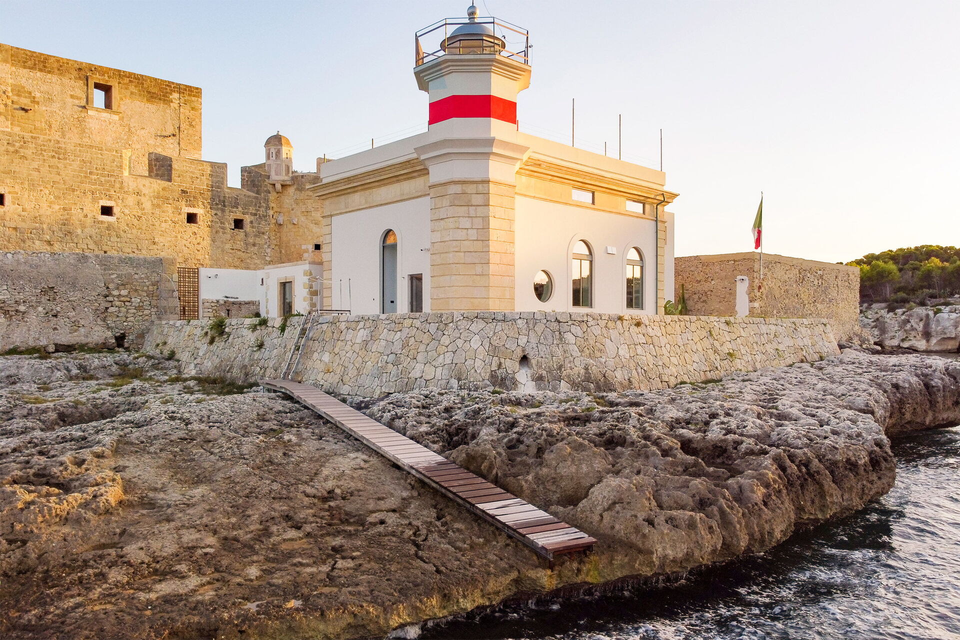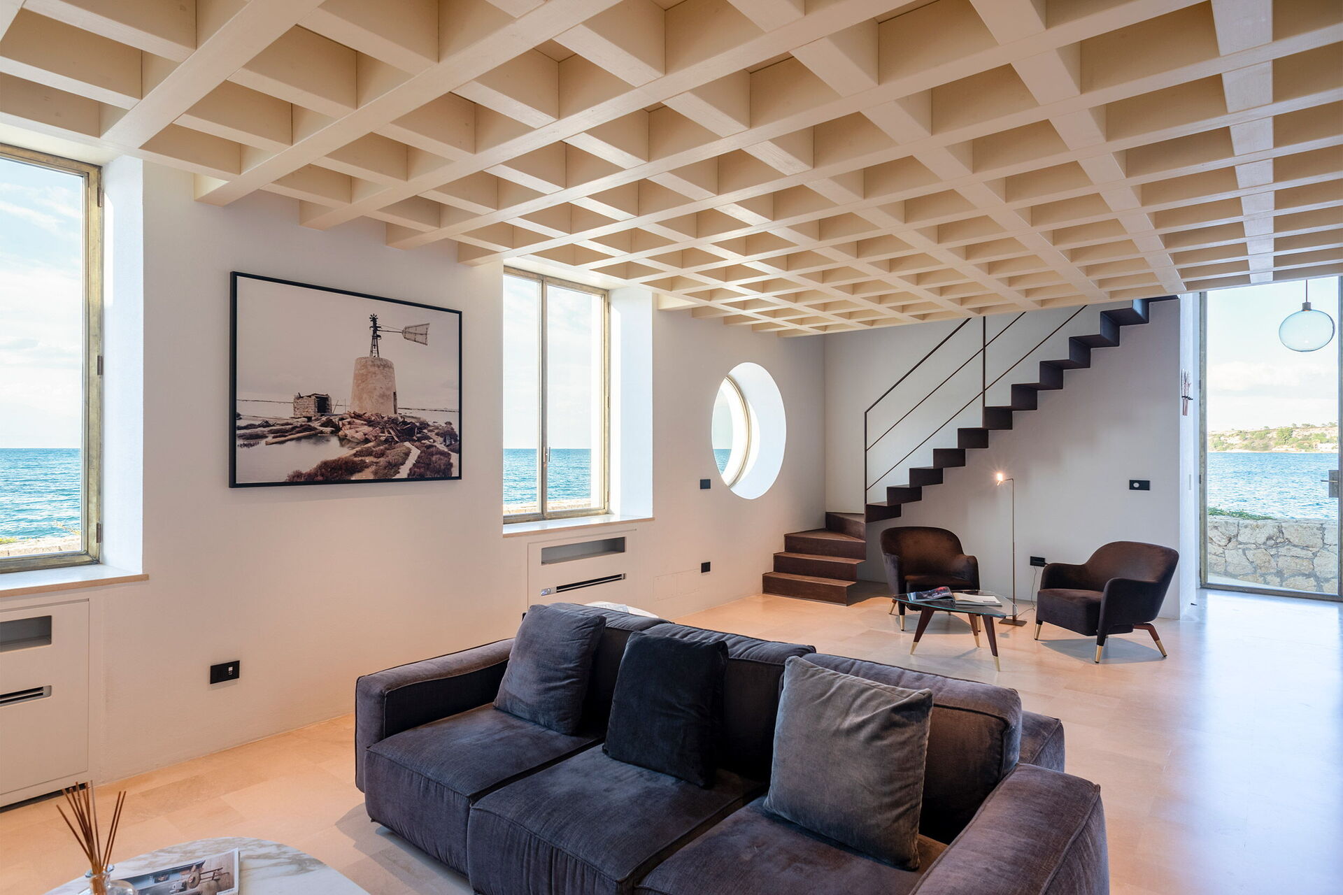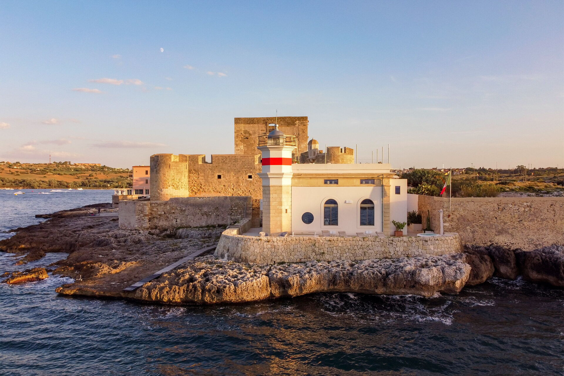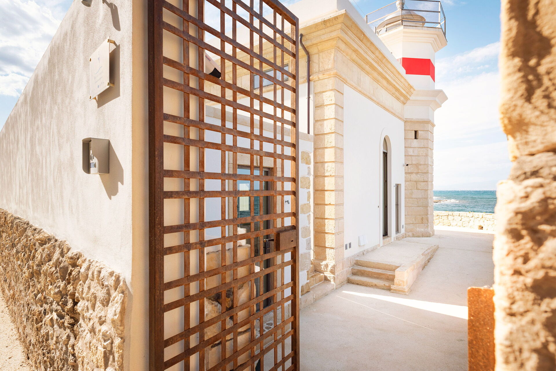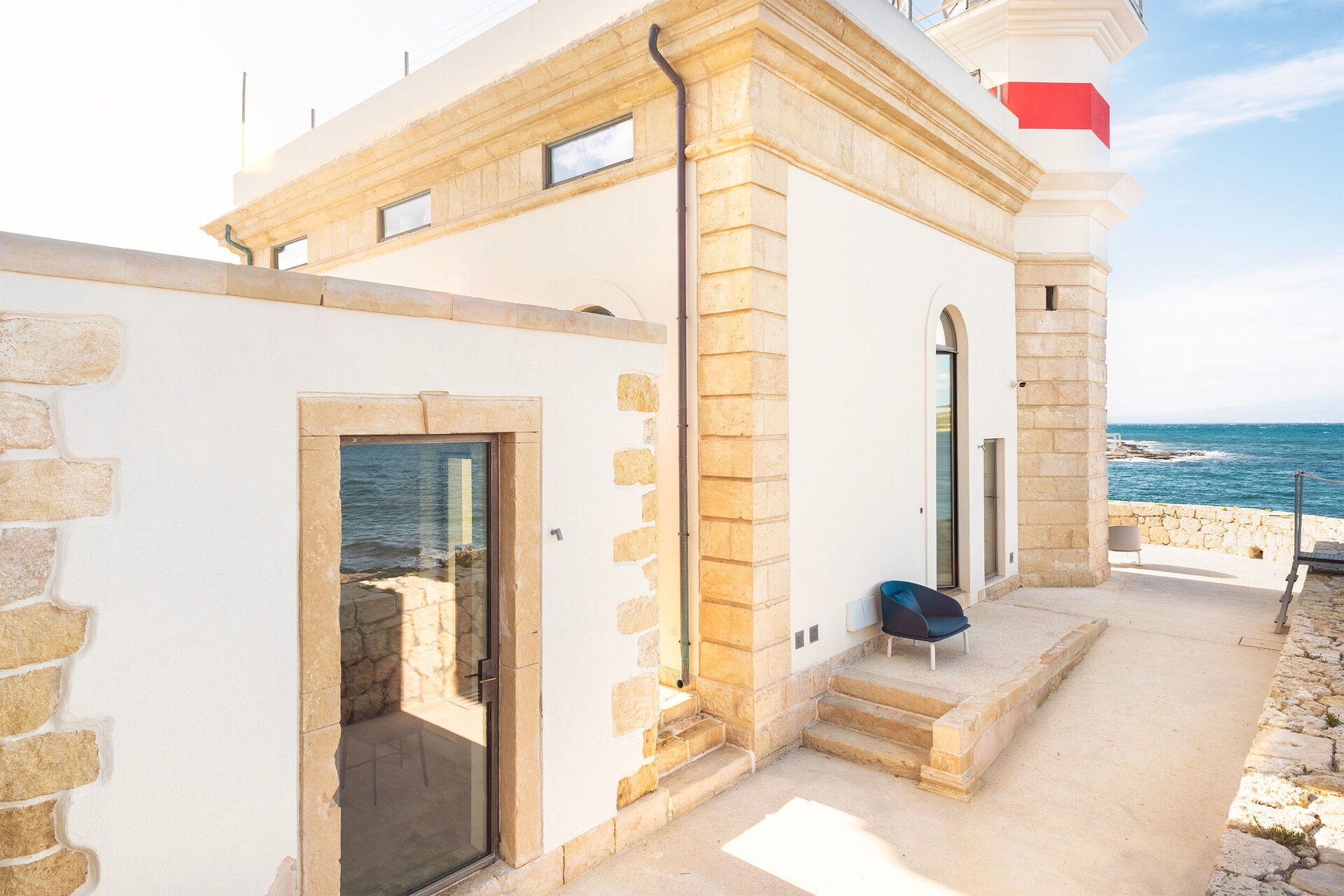 Denne eksklusive eiendommen ligger på klippene med utsikt over havet i Brucoli på Sicilias østkyst med en møblert, naturskjønn takterrasse som kan nås via en utendørstrapp, akkurat slik fyrvokteren brukte før i tiden.