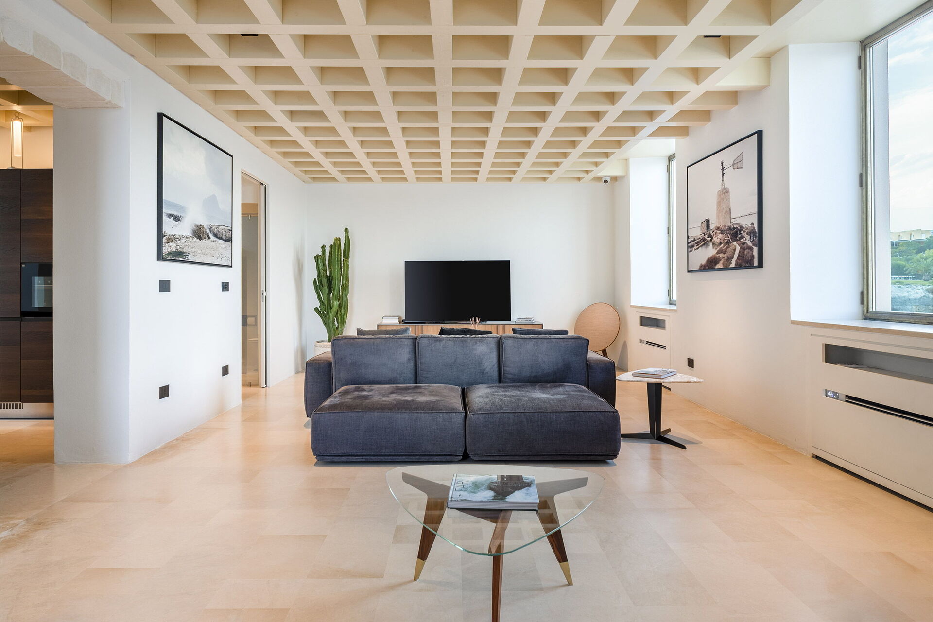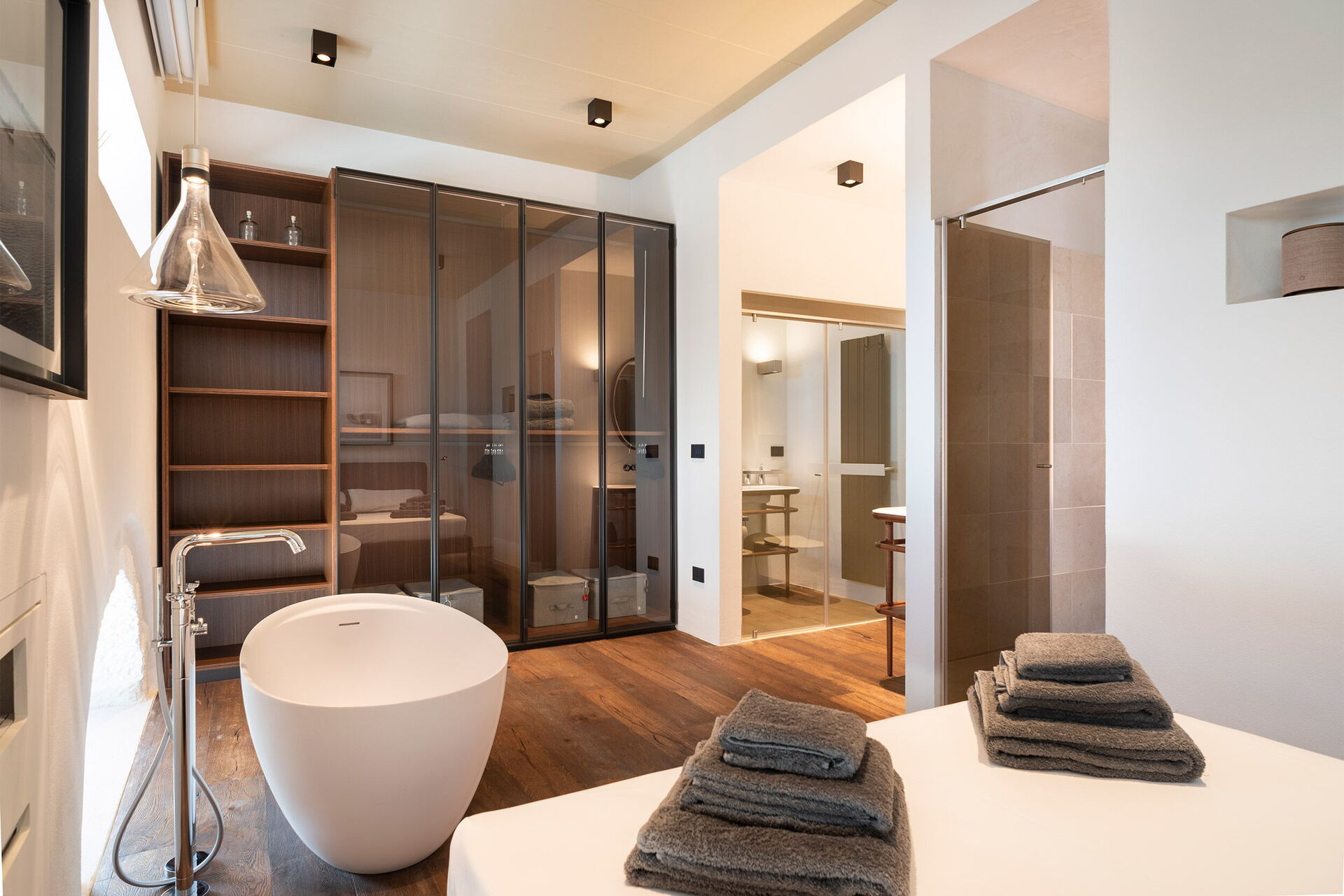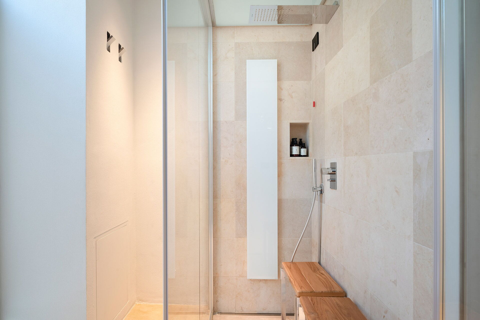 Lys stue (peis, smart-TV, aircondition), kjøkken (kokeplater, stekeovn, fryser, oppvaskmaskin, kaffemaskin, mikrobølgeovn, kjøleskap) og spiseplass, toalett, velværeavdeling med stor dusj med fargeterapi og dampbad.