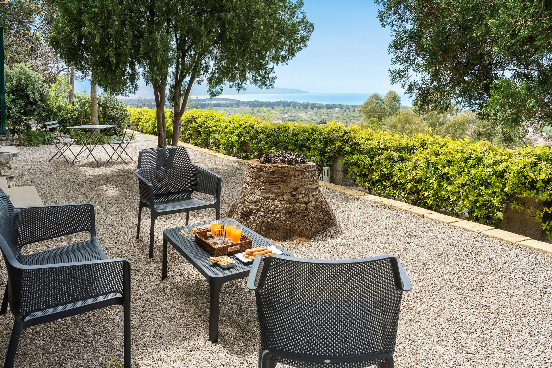 • Terrasse med bord, stoler og utrolig utsikt