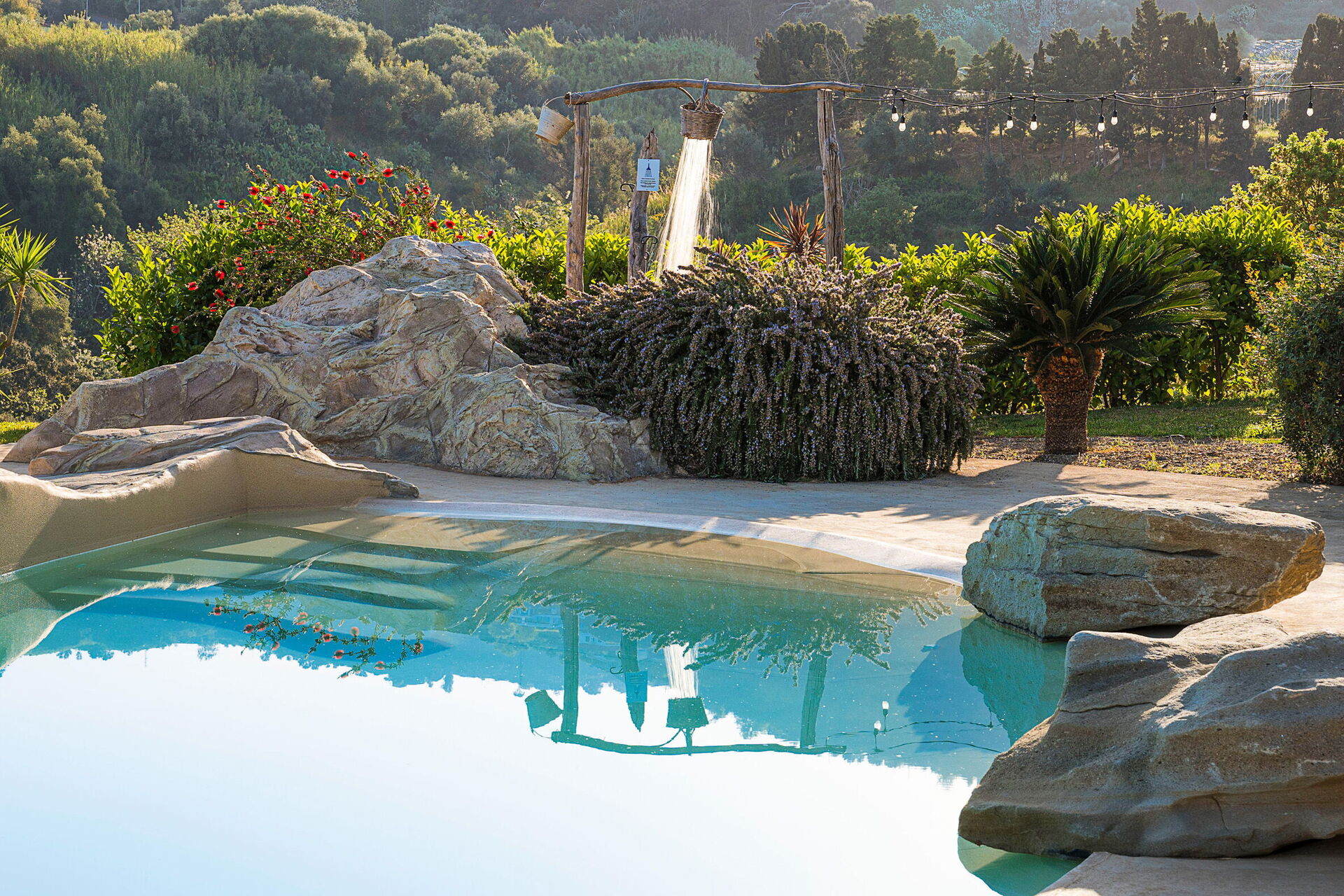 Feriehuset har to etasjer, stor terrasse og plass til opptil 10 personer. I hagen er det et ekslusivt svømmebasseng, som er bygget naturlig blant klippene.
