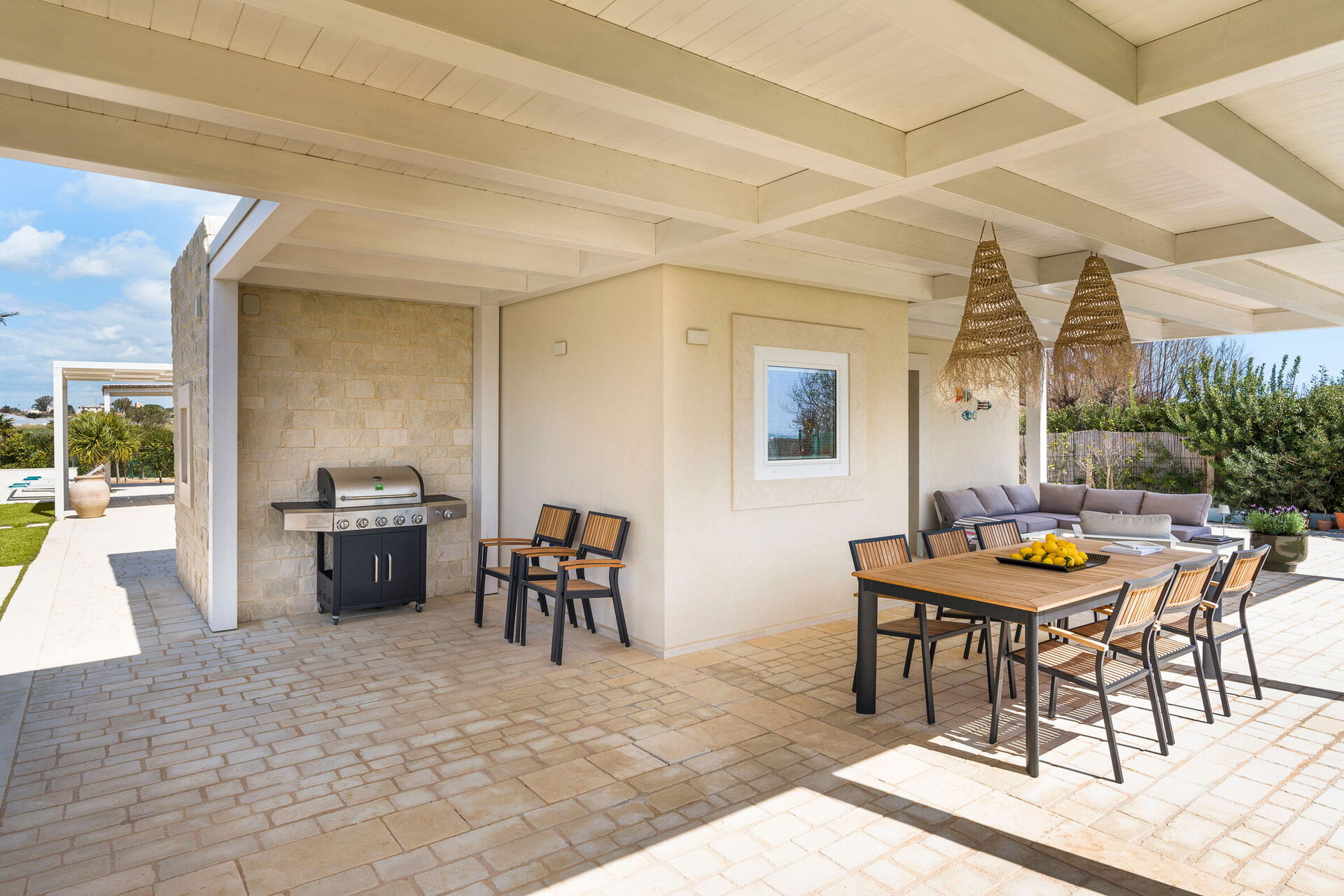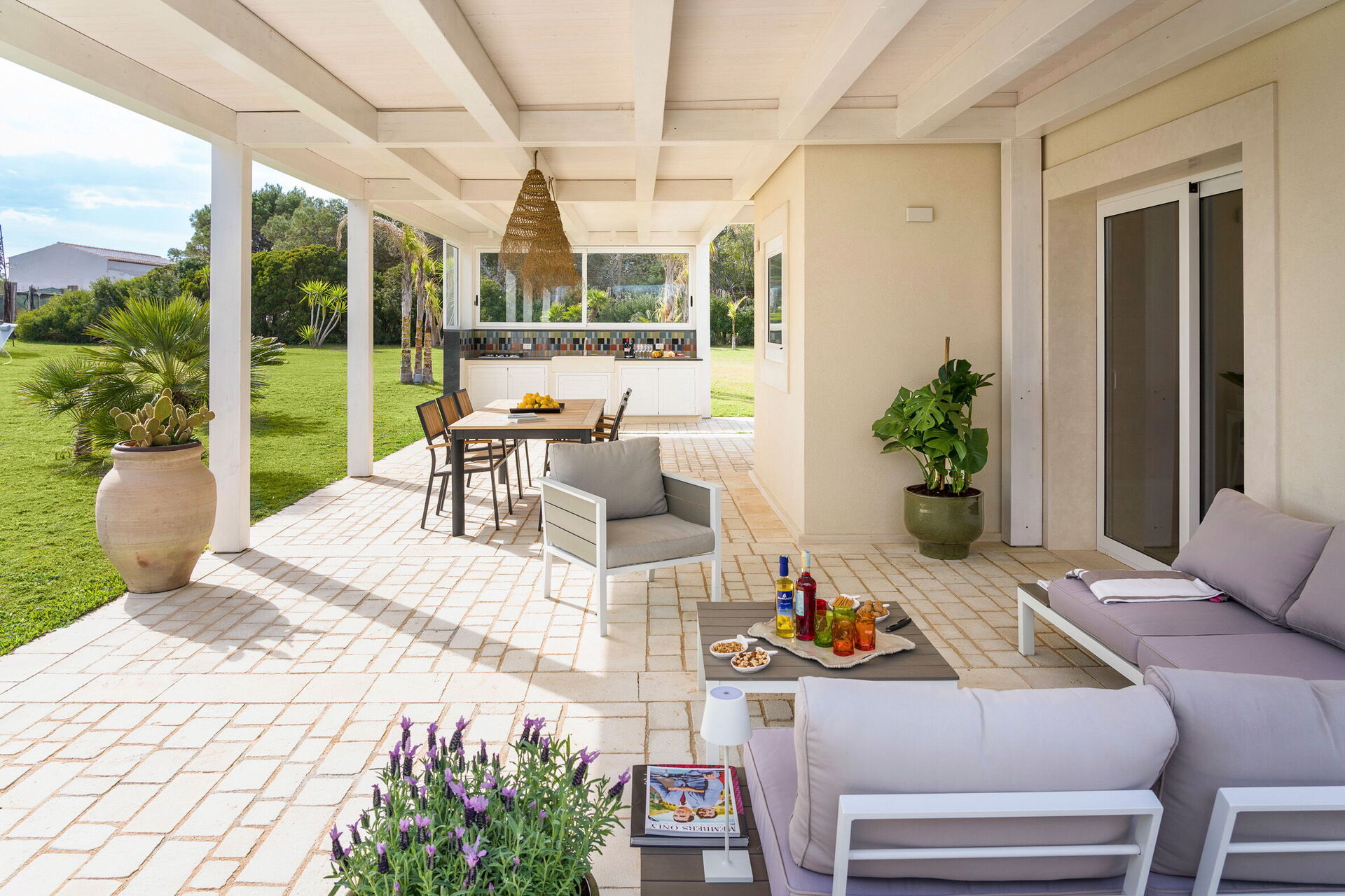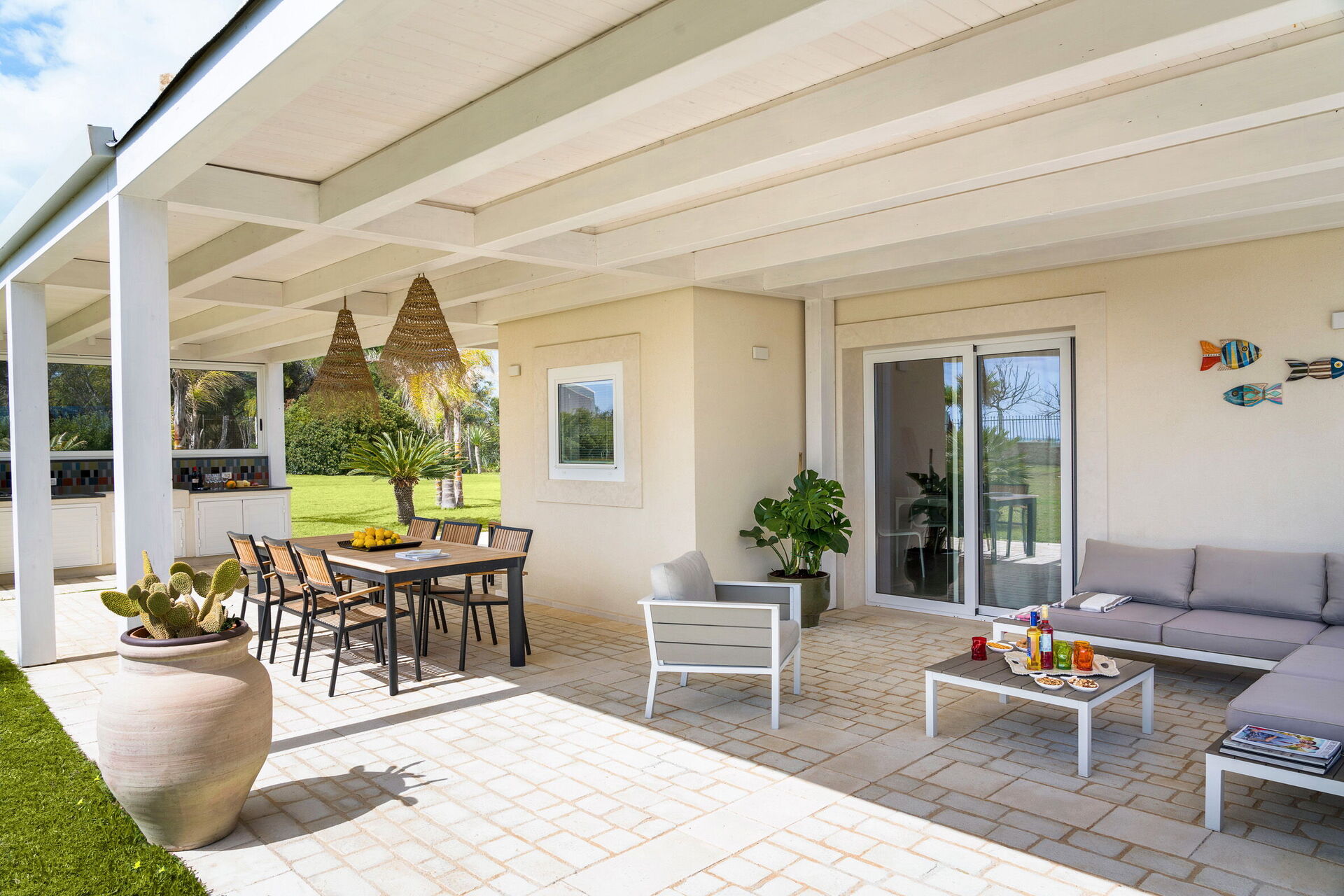 Uteområdene med panoramautsikt byr på flere områder som lar gjestene nyte et hyggelig opphold med familie eller venner. Her kan man slappe av på verandaen som er utstyrt for utendørs måltider eller i det store bassengområdet med solterrasse, perfekt for å nyte solen på Sicilia.