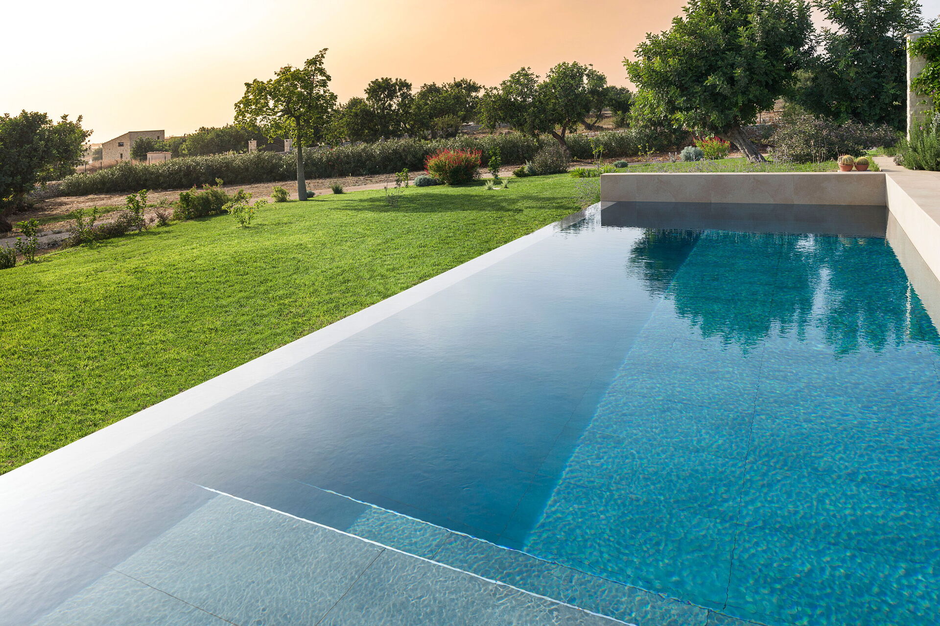 - Stort bassengdekk med solsenger