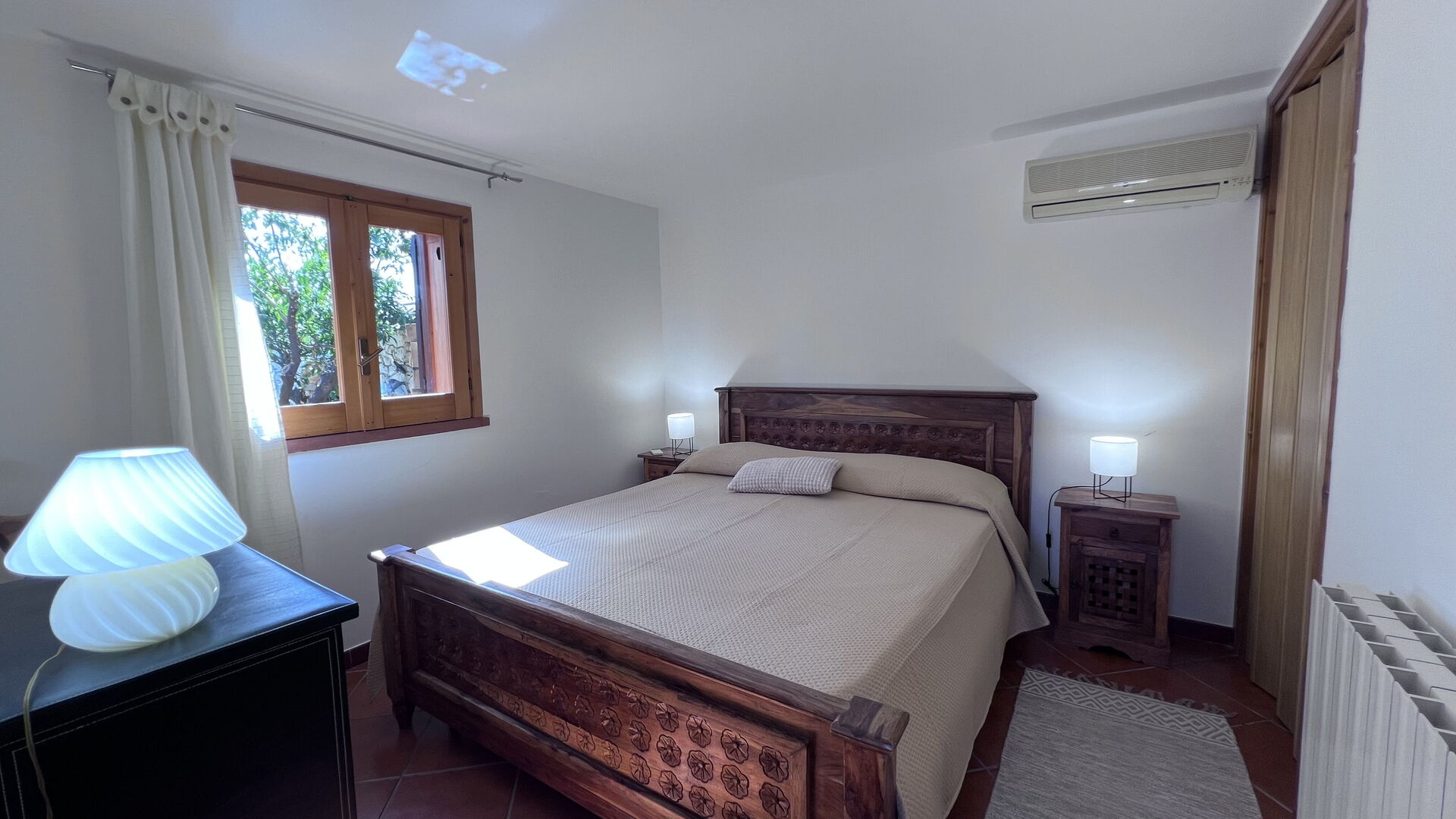 Grunnplan: stor stue (TV, aircondition) med kjøkkenkrok (kjøleskap, ovn), dobbelt soverom, soverom med køyeseng (uten vindu), bad med dusj.