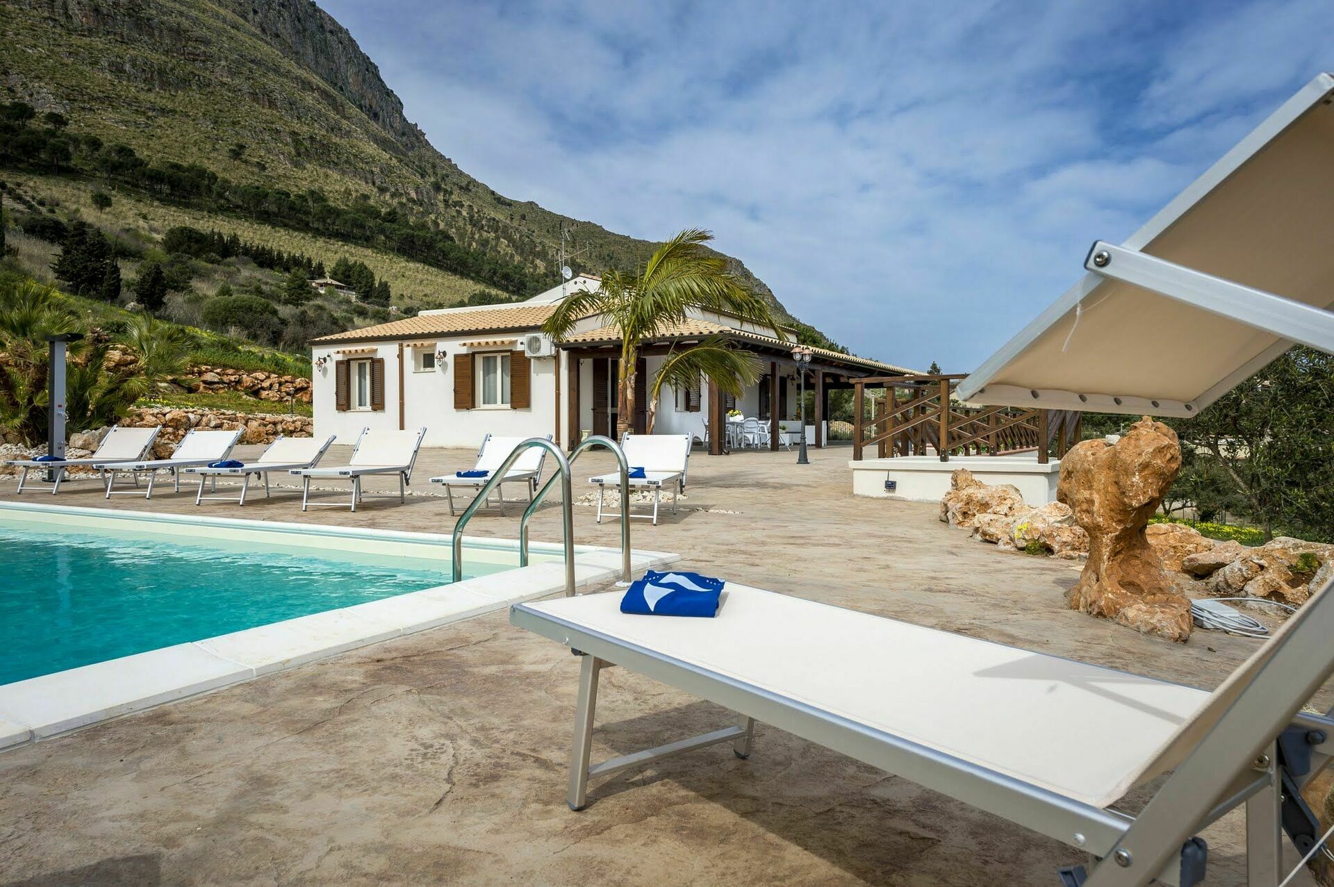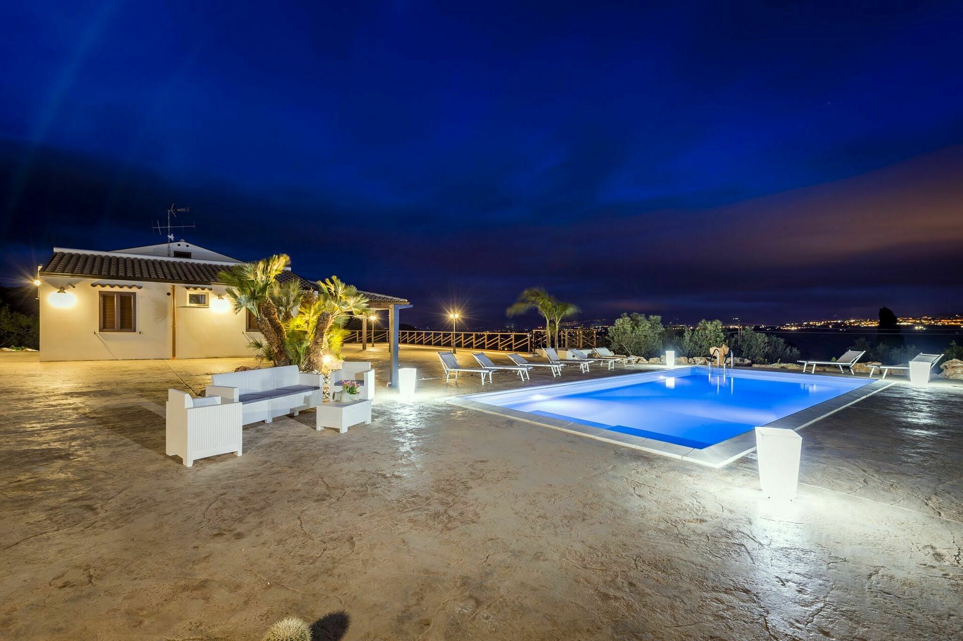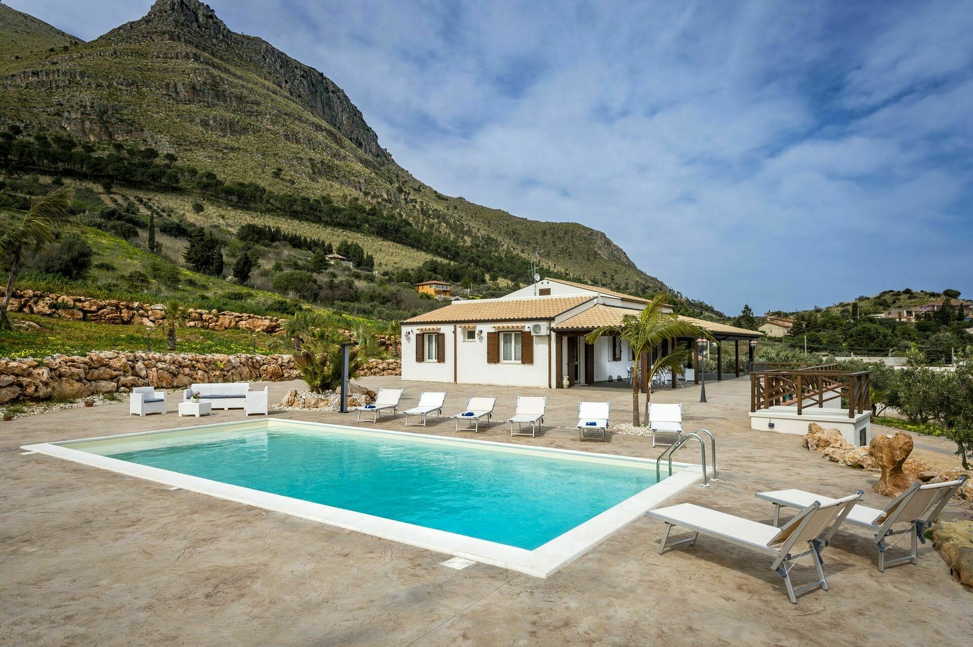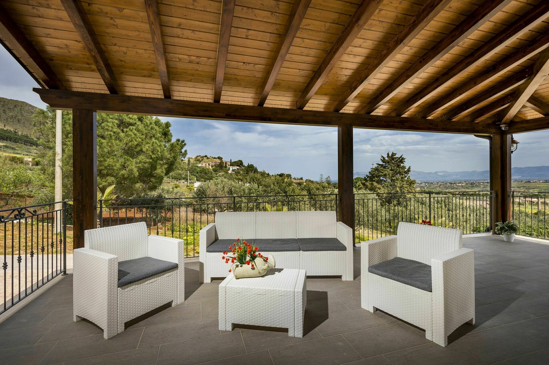 Villaen har en stor veranda med komfortable hagemøbler hvor gjestene kan slappe av og nyte utsikten over bassenget, landskapet rundt og havet.