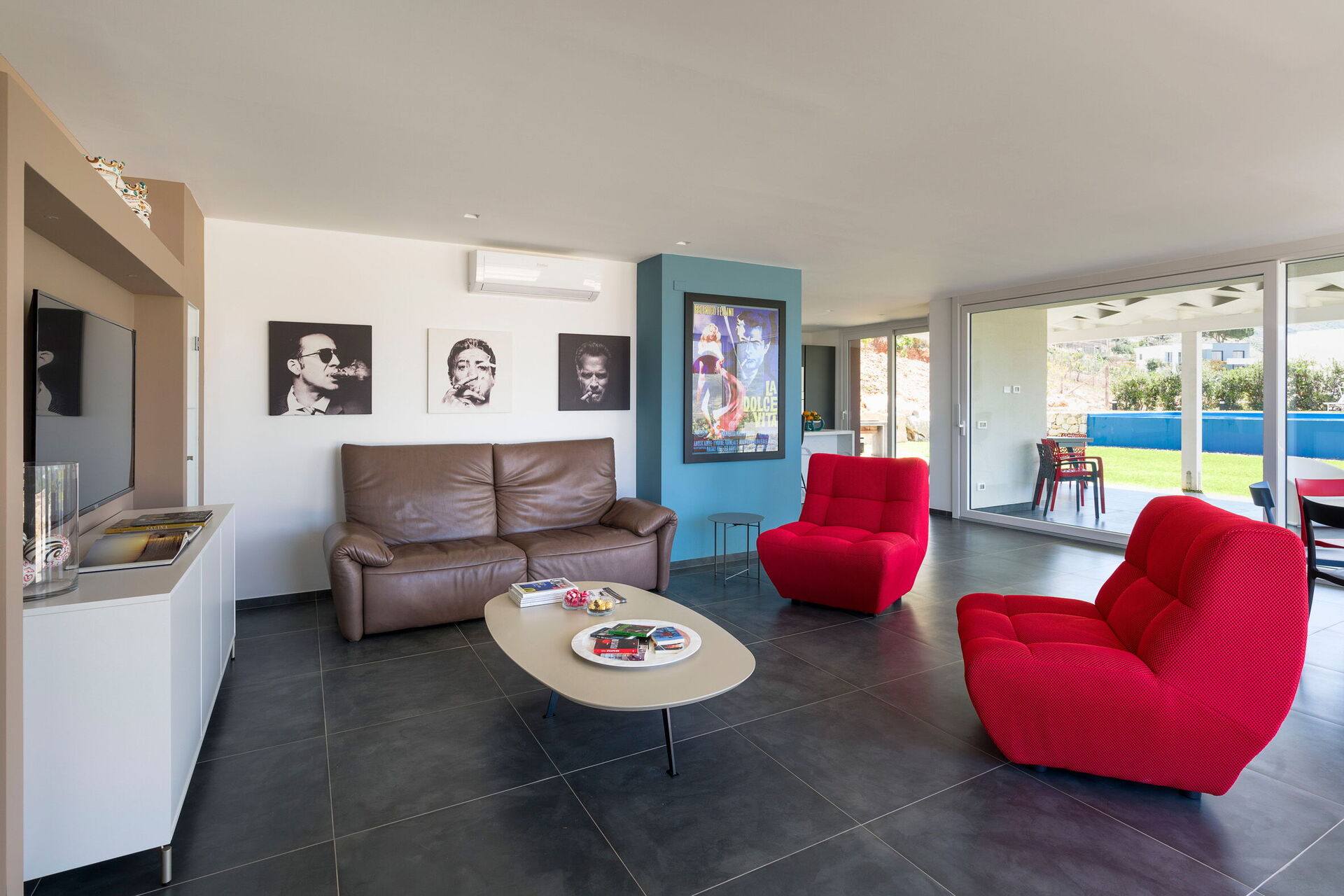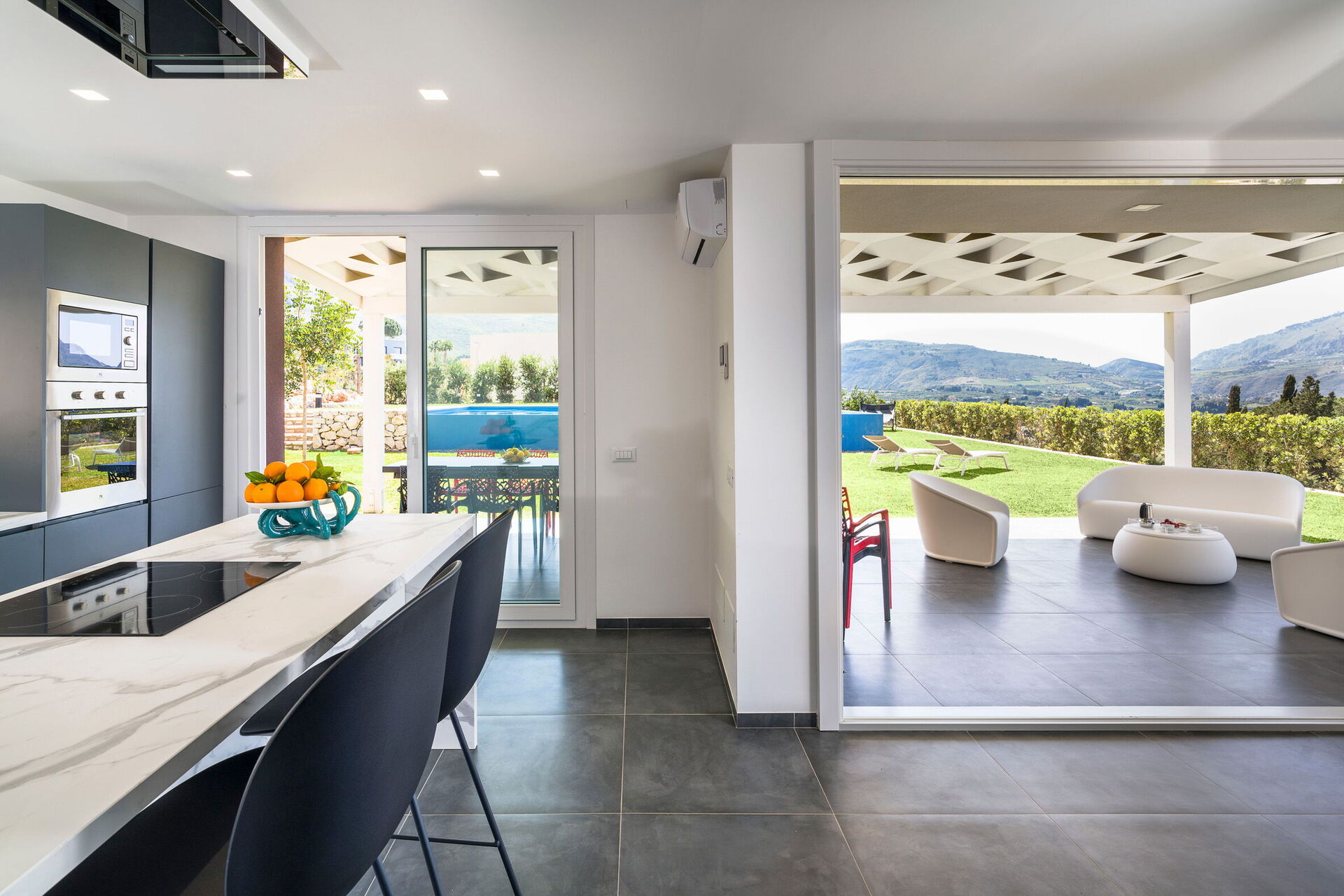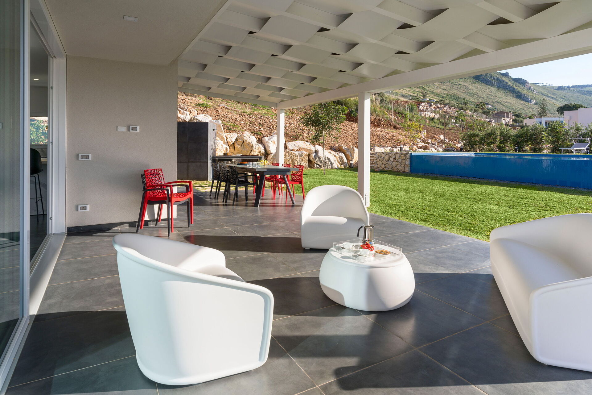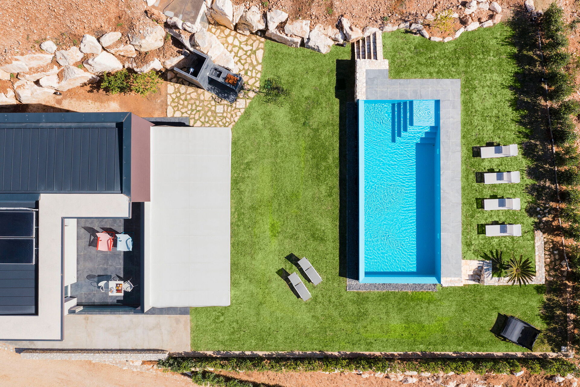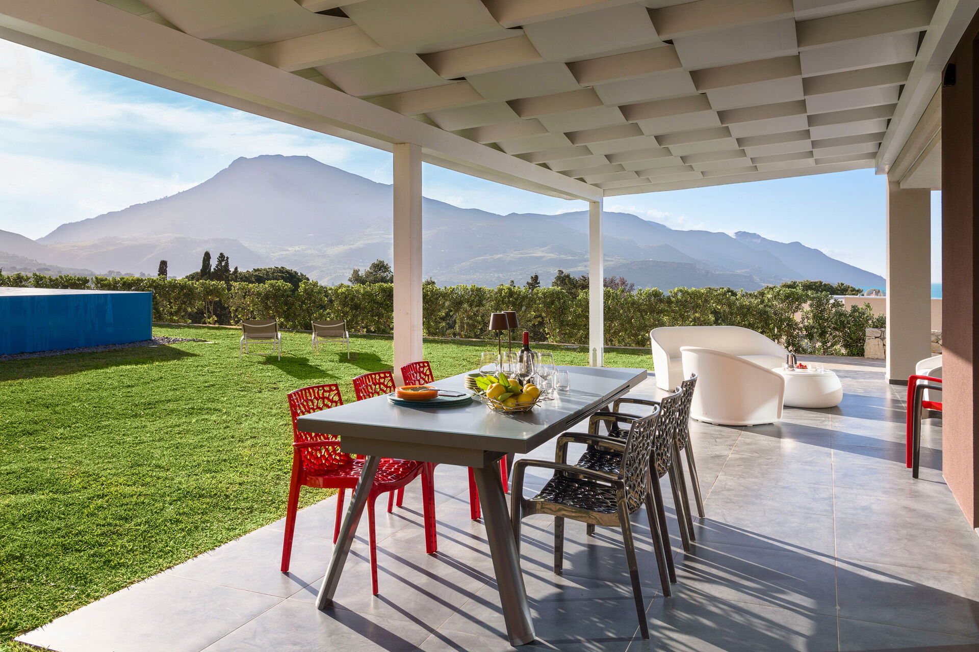 Gressplenen er veldig velstelt og bassenget med utsikt over landskapet kan friste de fleste. Det er solsenger rundt på gressplenen og møblert veranda til både måltider og avslapning, samt en stor terrasse i andre etasje!
