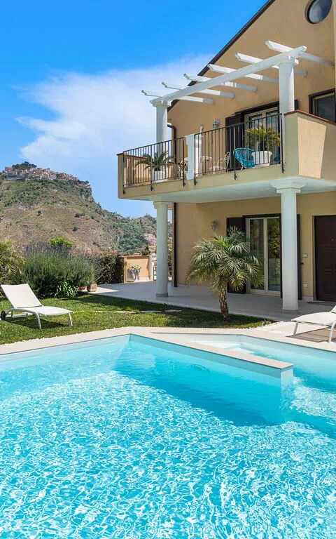 Villa Giuditta er et eksklusivt feriehus med privat basseng på Sicilia, i et rolig boligområde på en høyde, med fantastisk vidstrakt utsikt over Taormina og Castelmola.