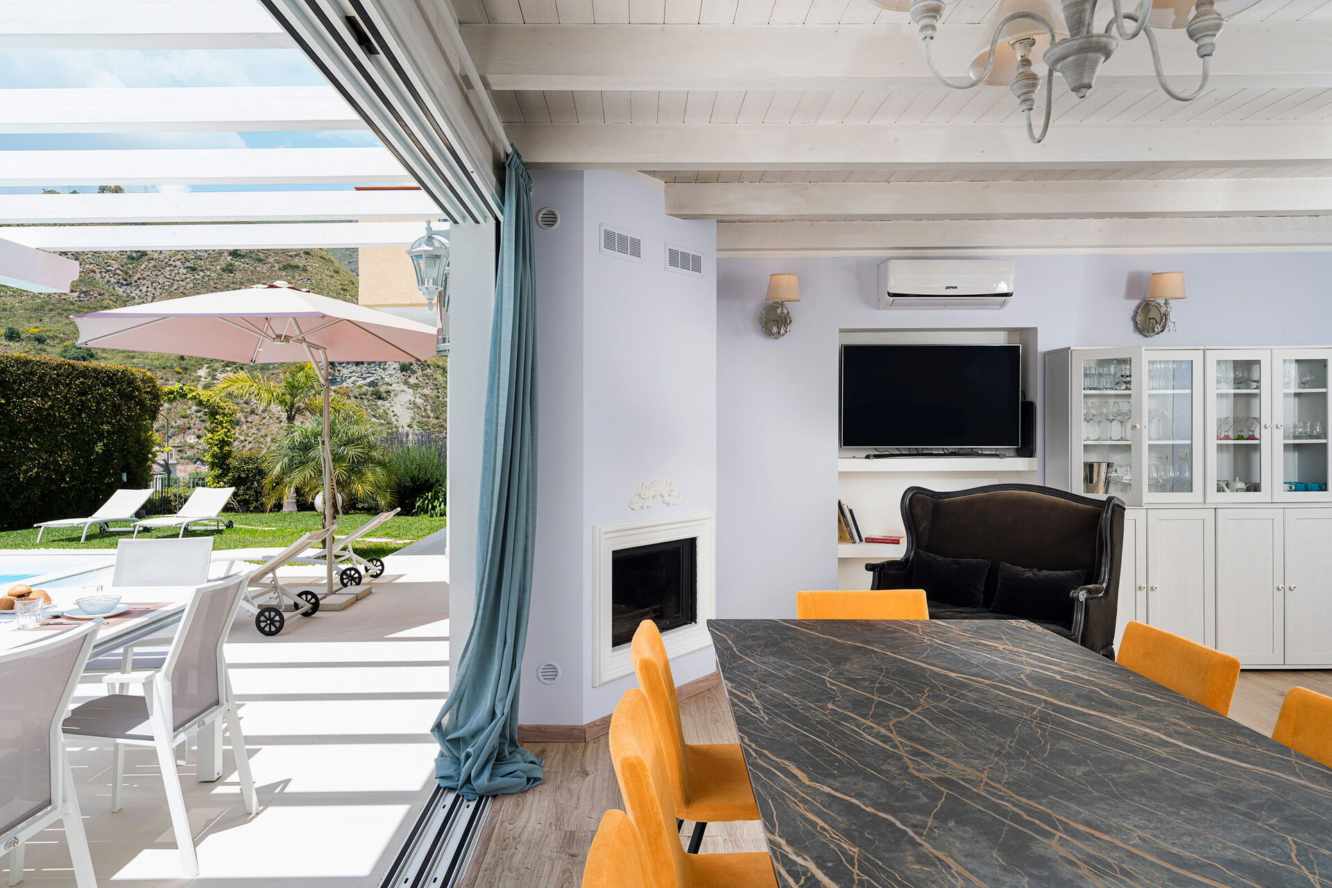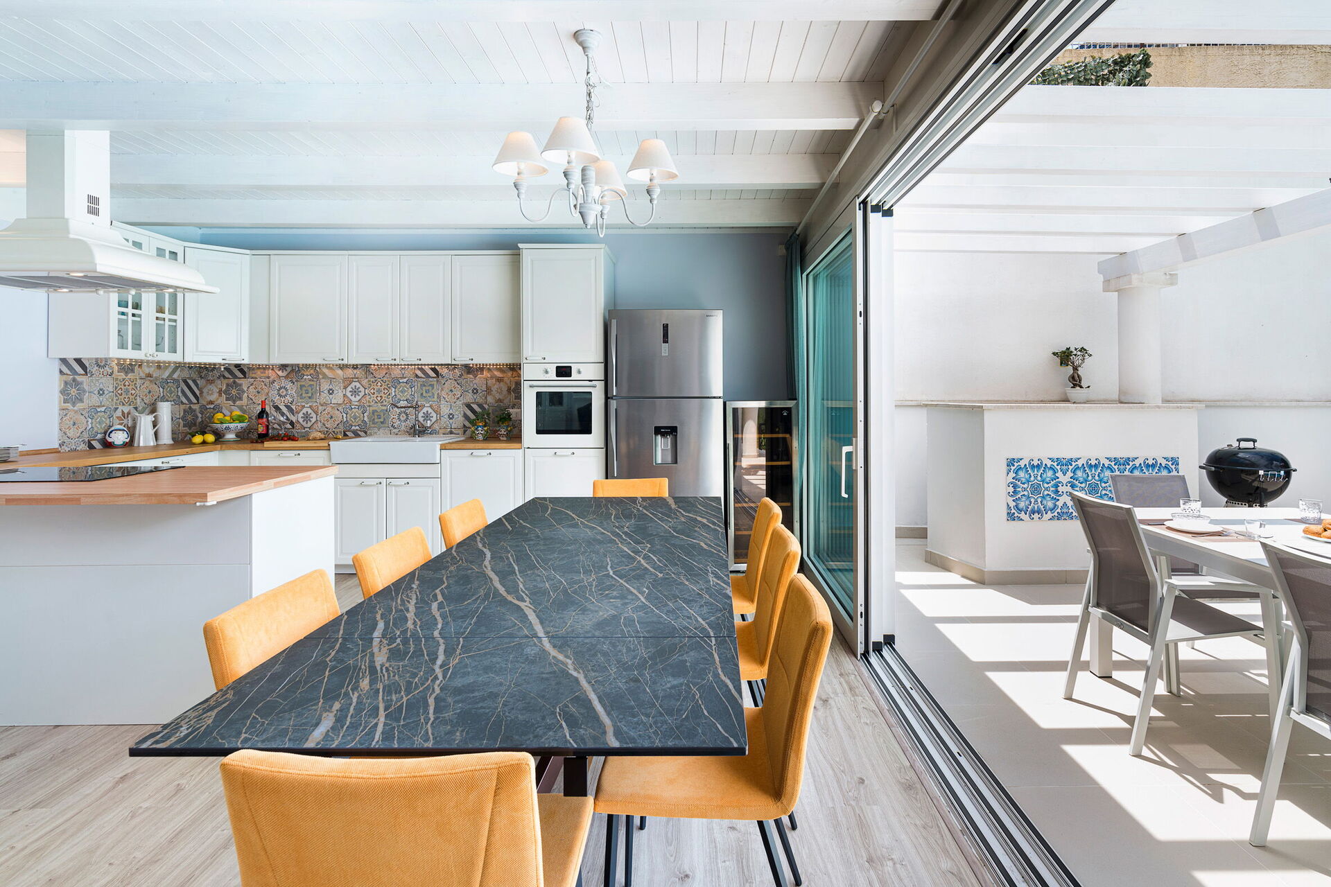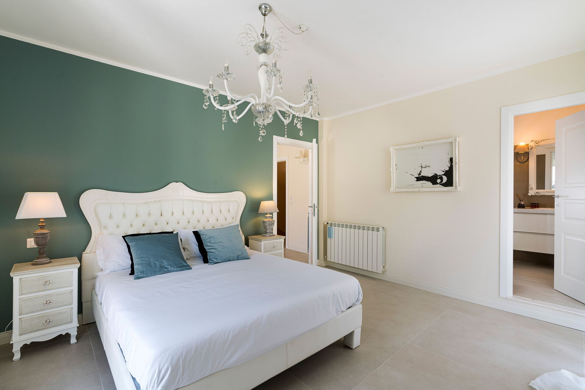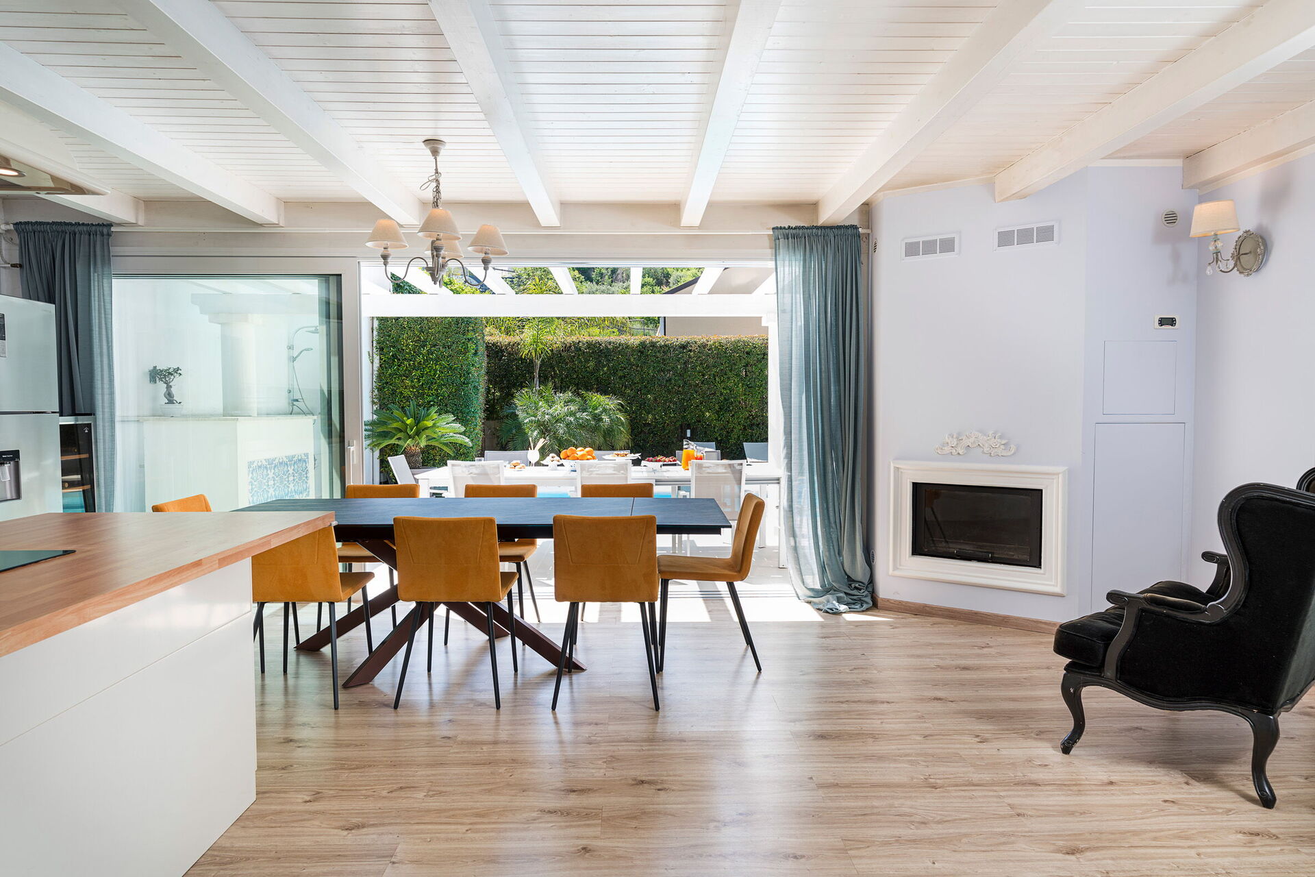 Feriehuset har 3 etasjer, innbydende interiør med klimaanlegg og 4 soverom. Ute er den velstelte hagen med saltvannsbasseng med masserende vannstråler og flere møblerte avslapningsområder.